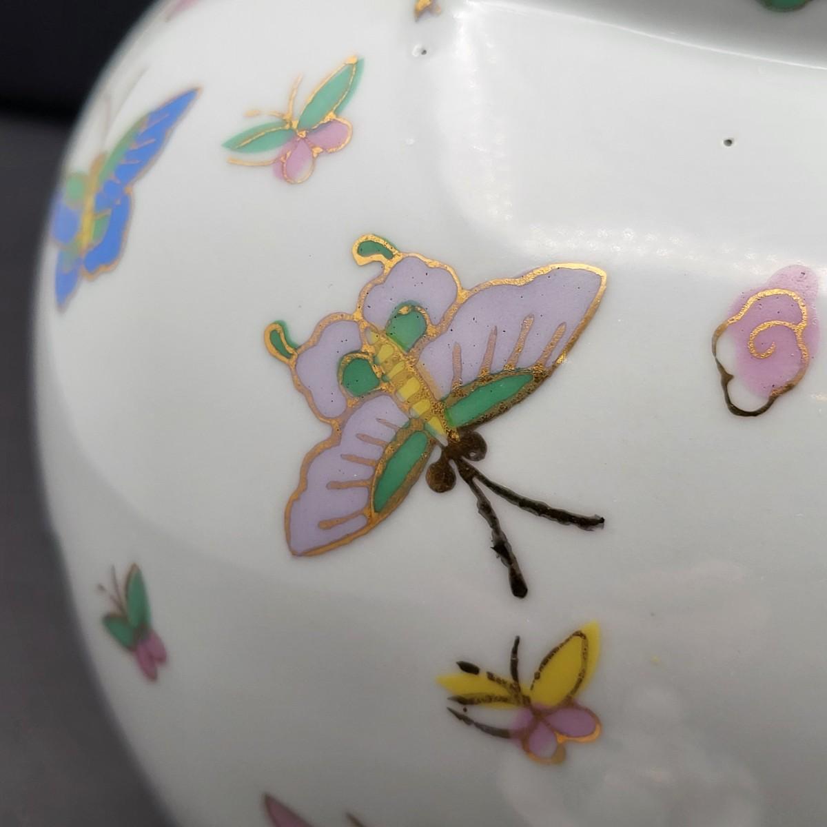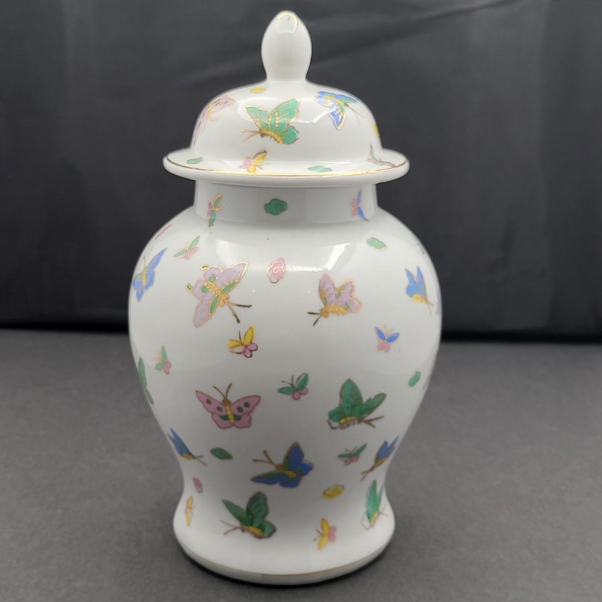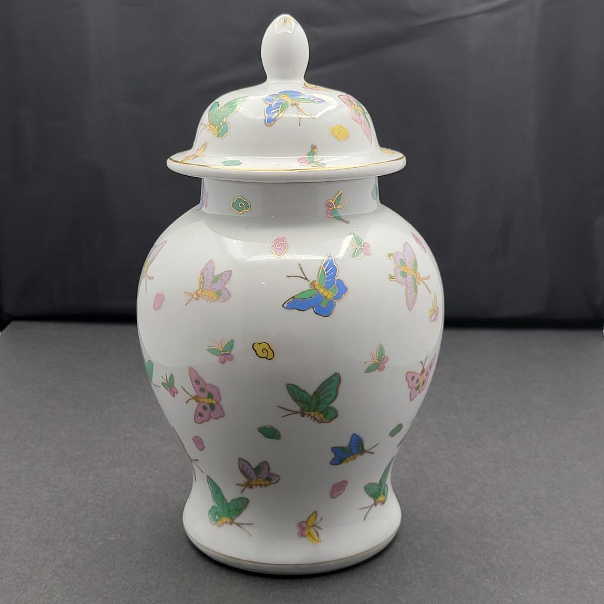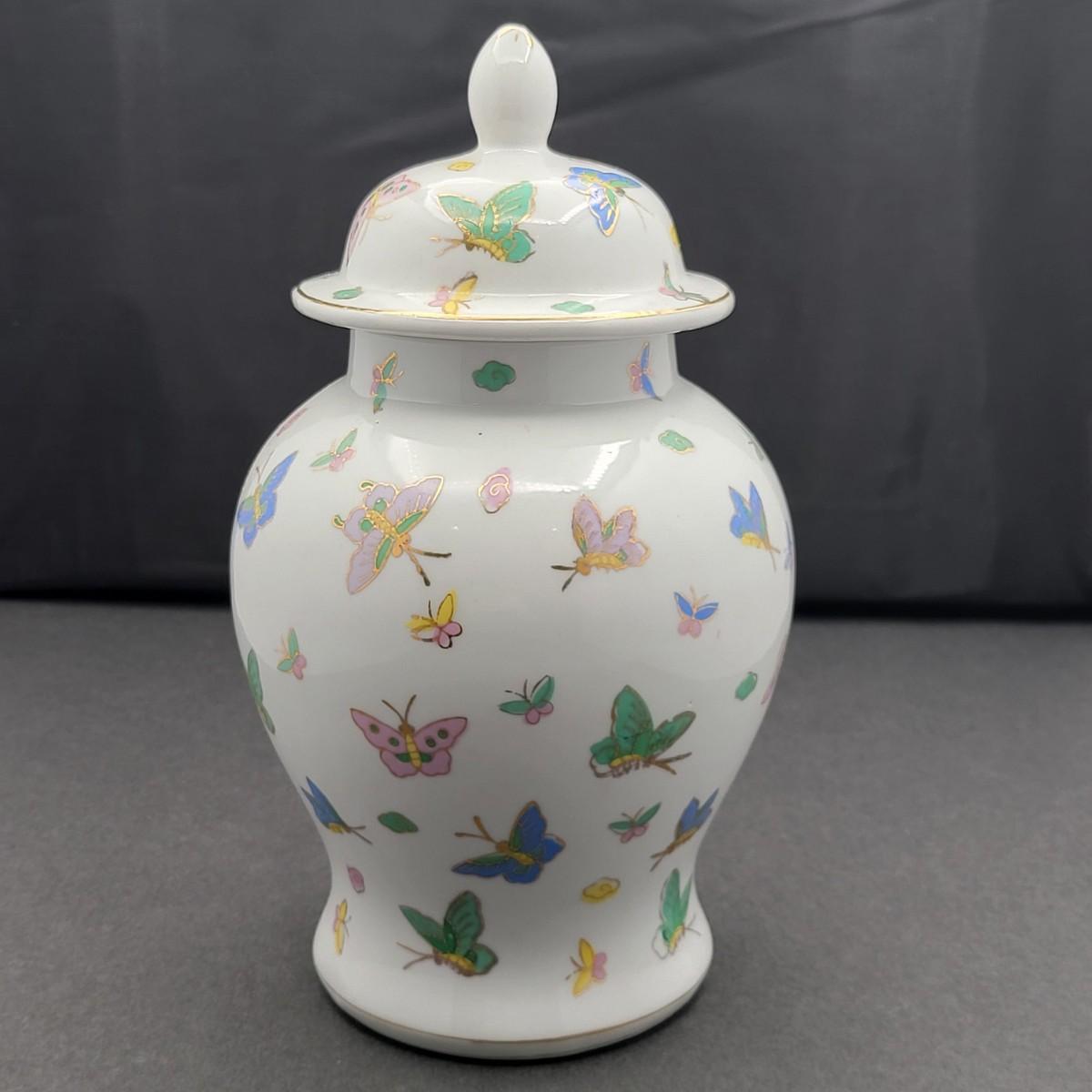 Butterfly pattern all around jar and bell style lid. White glaze with hand painted pastel and gold butterflies. Measures 11" tall. Good condition, no chips, cracks or breaks. This item does not ship. Local pick up only.