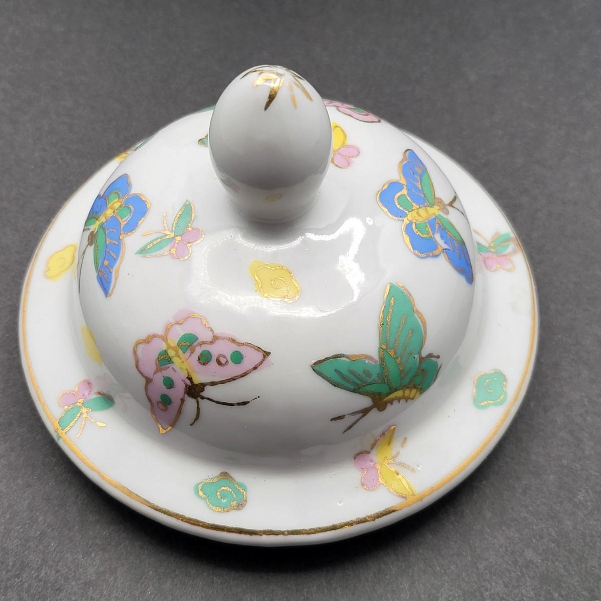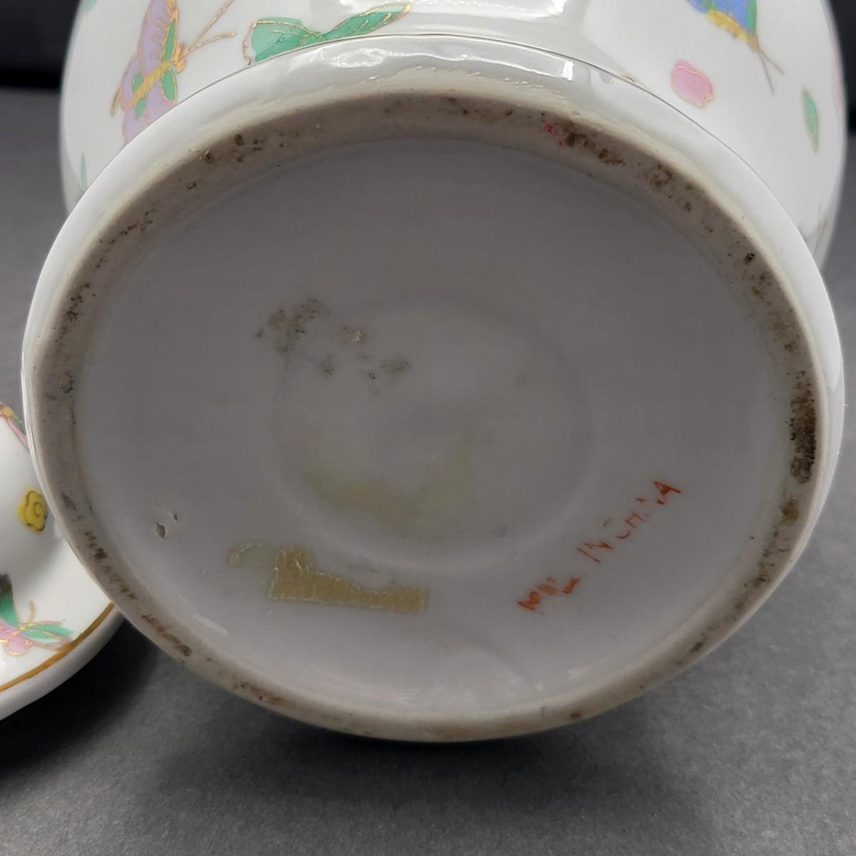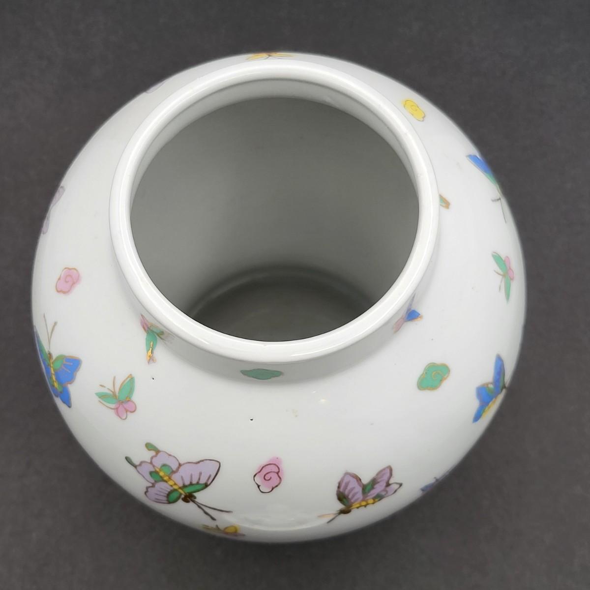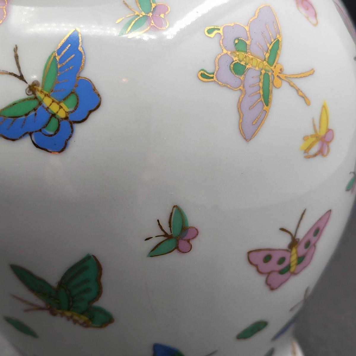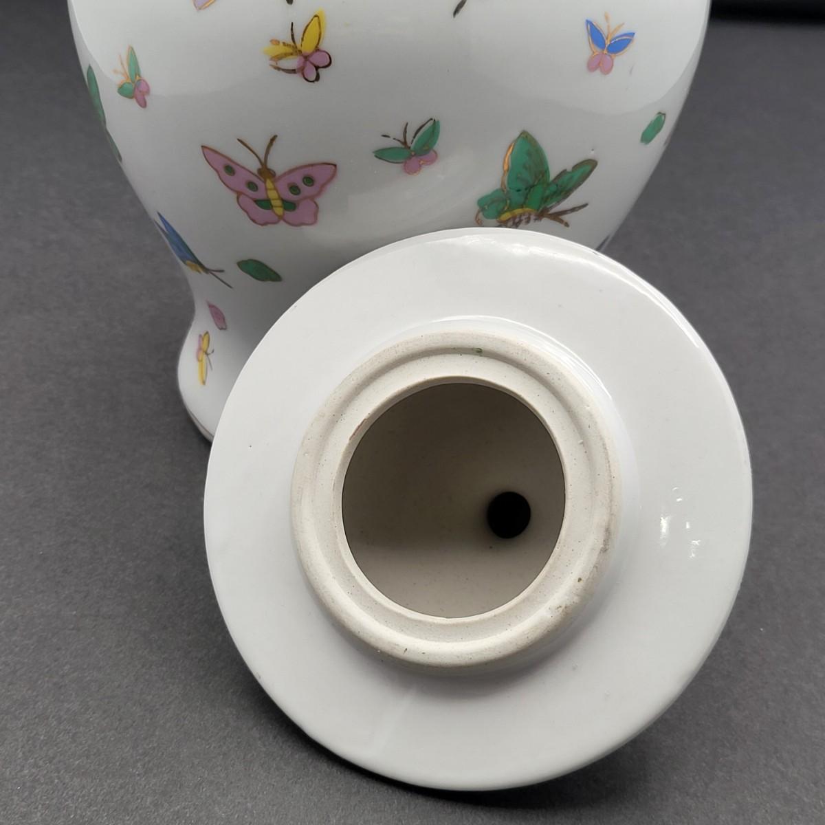 Butterfly pattern all around jar and bell style lid. White glaze with hand painted pastel and gold butterflies. Measures 11" tall. Good condition, no chips, cracks or breaks. This item does not ship. Local pick up only.