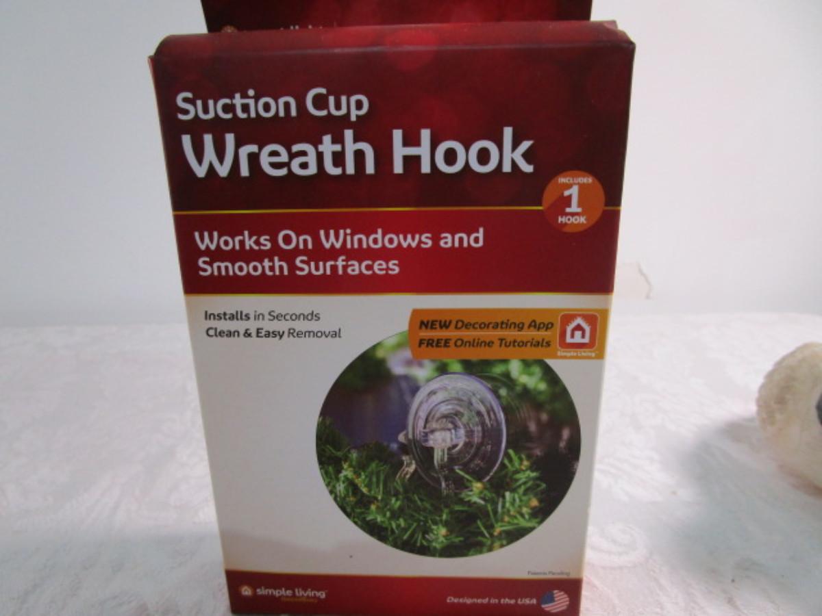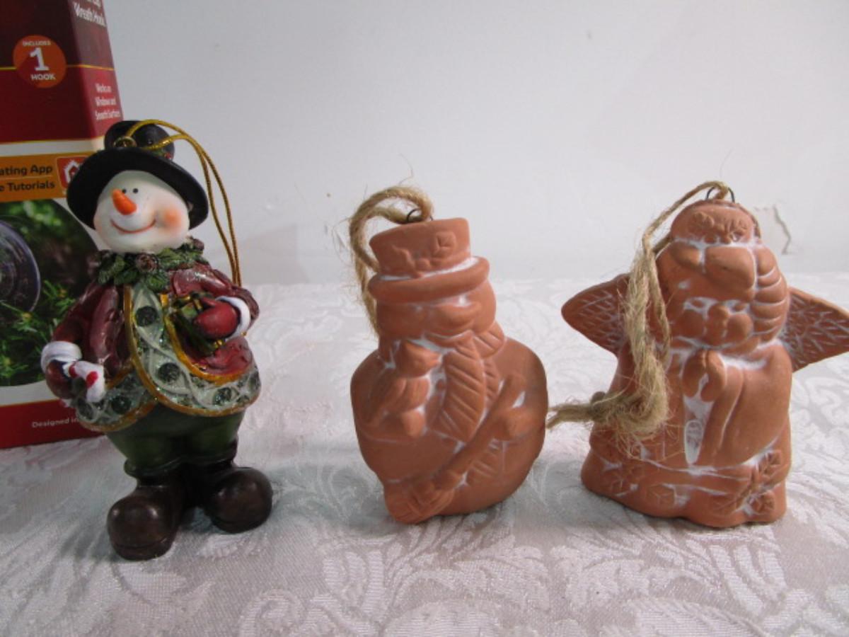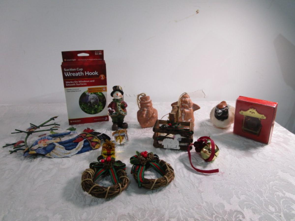 11 Christmas ornaments, 1 suction cup wreath holder, bird candle
