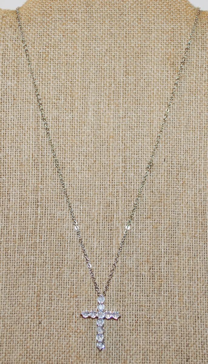 11 Clear ROUND Stones Cross PENDANT (1¼" x ¾") on a Silver Tone Necklace Chain 17" L
