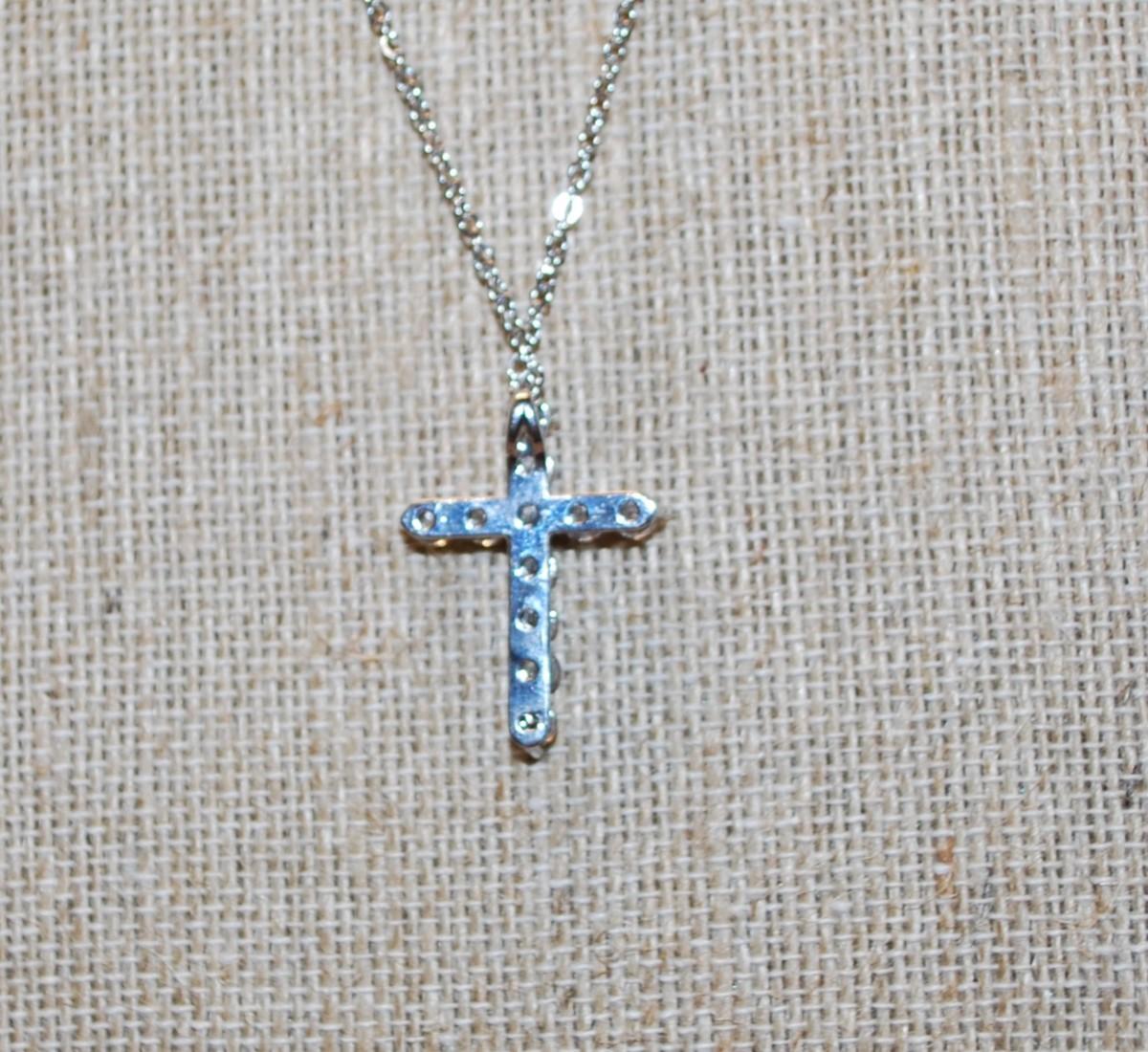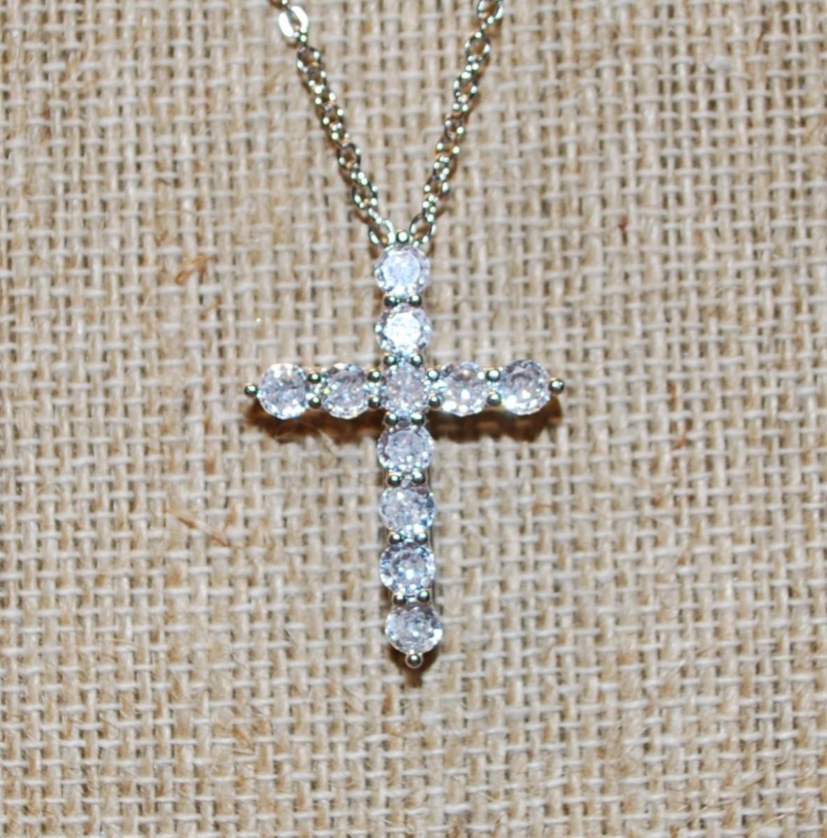 11 Clear ROUND Stones Cross PENDANT (1¼" x ¾") on a Silver Tone Necklace Chain 17" L