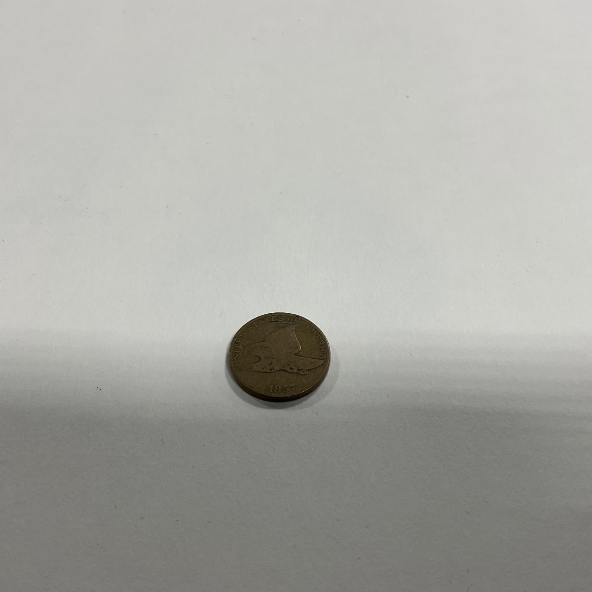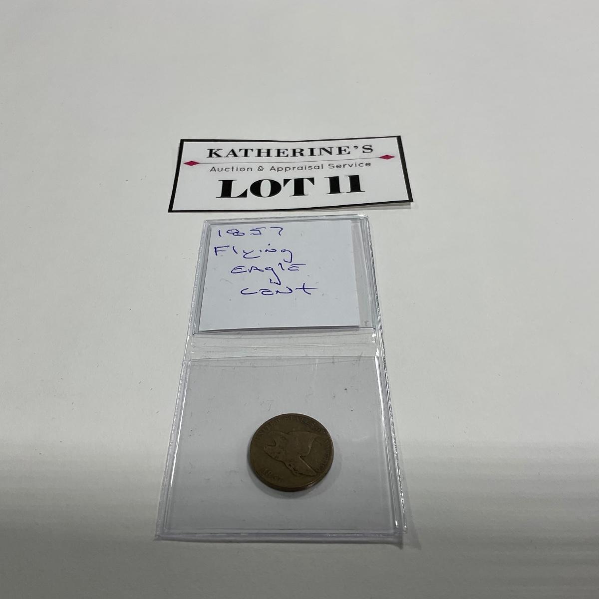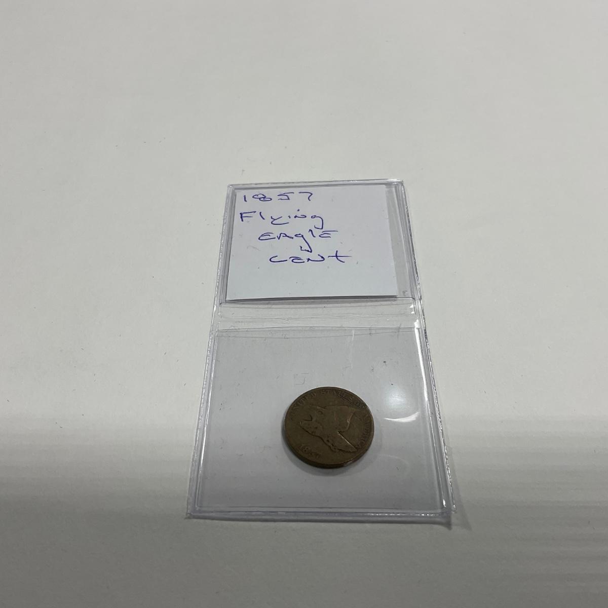 One 1857 flying eagle coin. Please see photos for details and condition. ::: Shipping is available on this lot. If you require shipping you must let us know at the close of the auction. We will coordinate with you after the item has been won. Shipping fees will include insurance up to or exceeding the value of all items being mailed. If you have any questions regarding this lot please contact the auctioneer either via this website, by direct email or by phone. PICK UP TIMES and other important information can be found in the TERMS and DESCRIPTION of the auction. Please take a look for pertinent information. Thanks!
