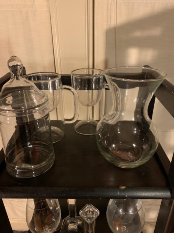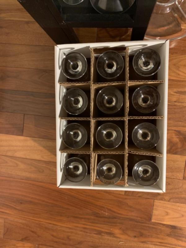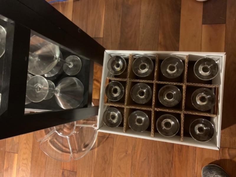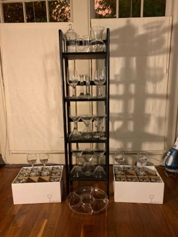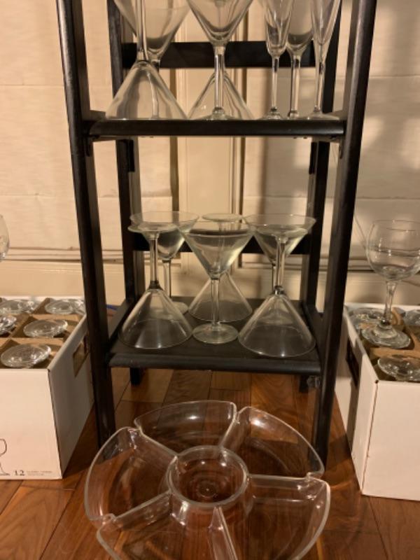 2 boxes of wine glasses 24 total, plastic tray, wine mugs, 10 Martini glasses, 4 cordial glasses, glass container with lid, pair of glass candlesticks.