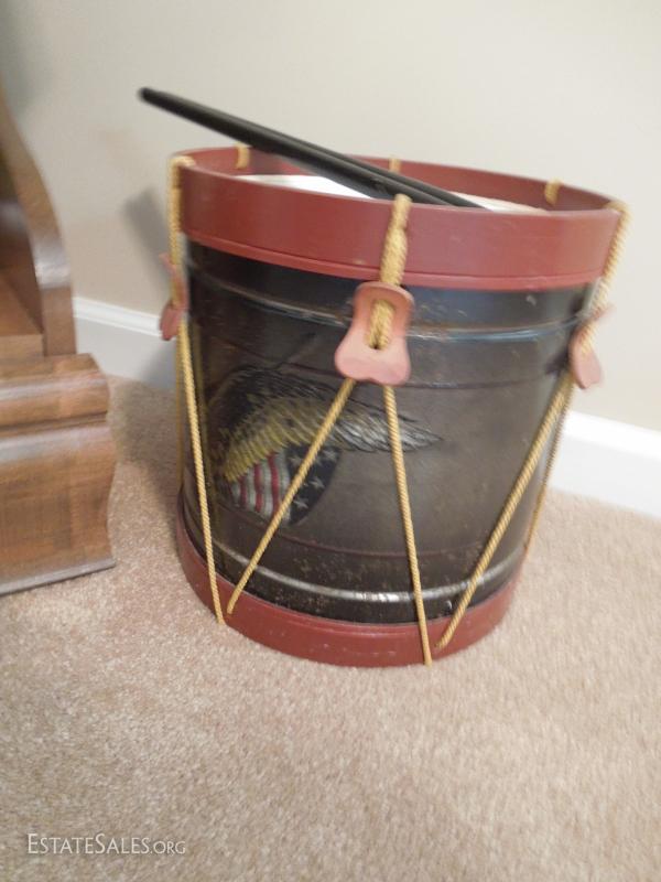 A charming historical reproduction tin drum just to look at or use for pageantry. Has American Eagle stenciled on side. Identical drum without sticks sold separately.