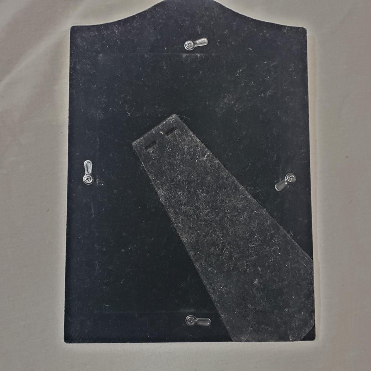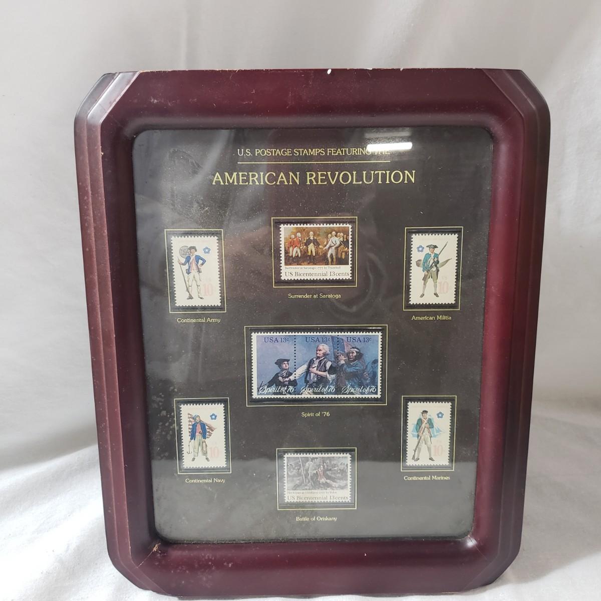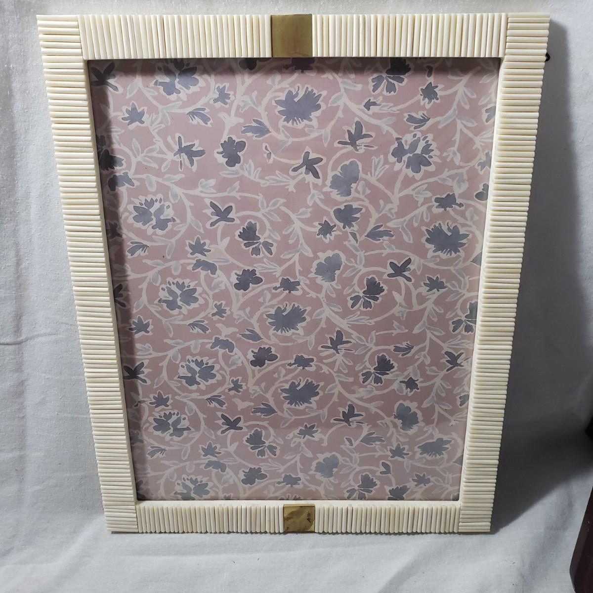 This lot features some beautiful picture frames! The largest 11" x 17" appears to be a faux ivory with brass accent pieces. The smallest frame, handmade in Italy measures 4" x 4". The small oval frame does not have glass. Thr framed stamp collection is an extra bonus! See pictures for details.