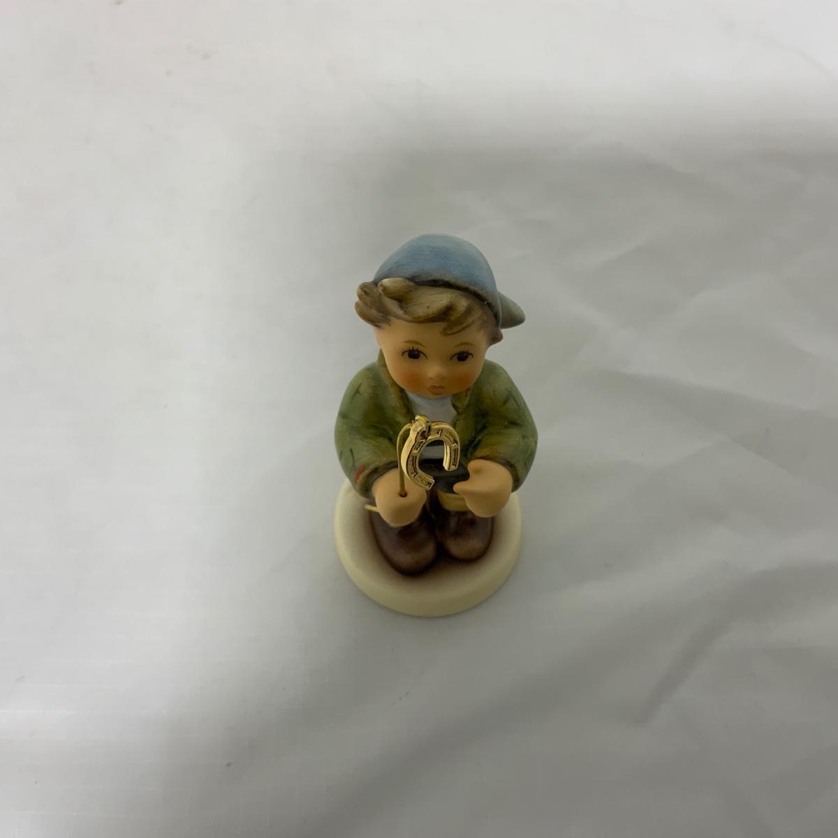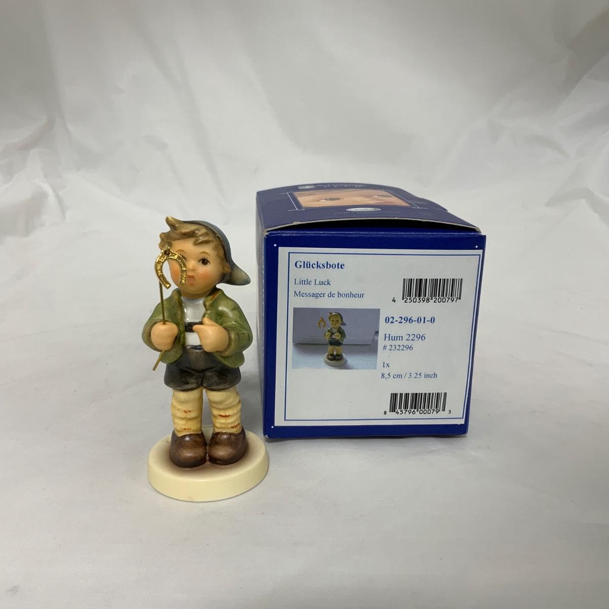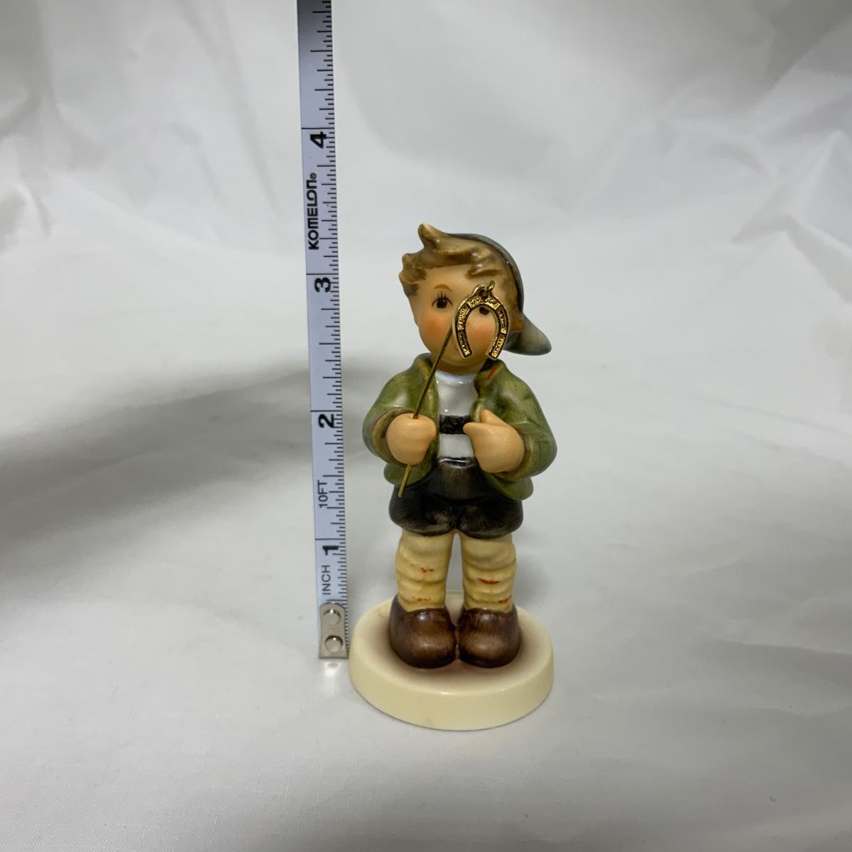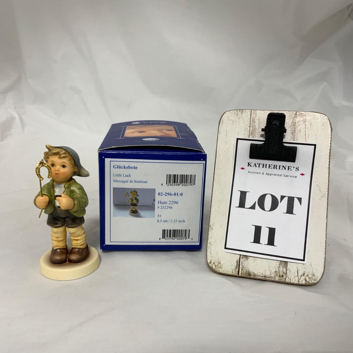 How sweet is he with his little horseshoe charm? Little Luck, Hum 2296, 3 1/4” tall. Hummel Club Exclusive, dated 2010. Please see photos for details and condition. - No Cracks, Chips or Crazing Noted. Figure comes with original box. ::: Shipping is available on this lot. If you require shipping you must let us know at the close of the auction. We will coordinate with you after the item has been won. Shipping fees will include insurance up to or exceeding the value of all items being mailed. If you have any questions regarding this lot please contact the auctioneer either via this website, by direct email or by phone. PICK UP TIMES and other important information can be found in the TERMS and DESCRIPTION of the auction. Please take a look for pertinent information. Thanks!