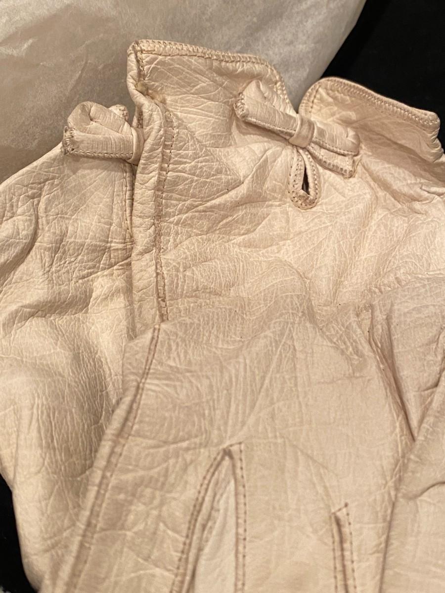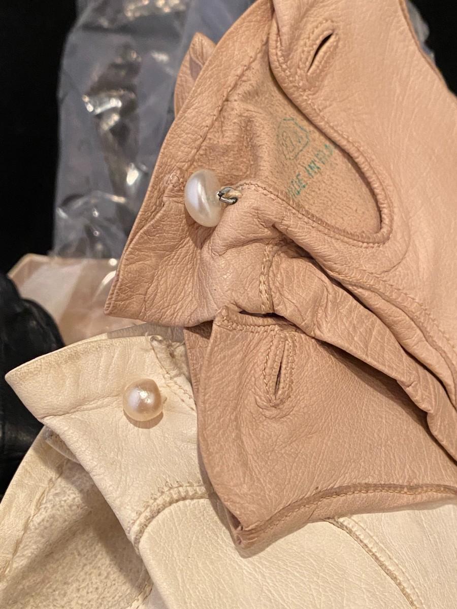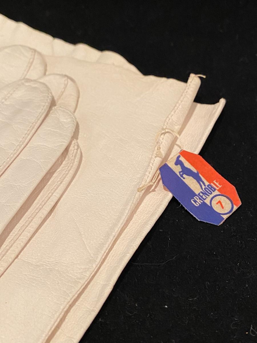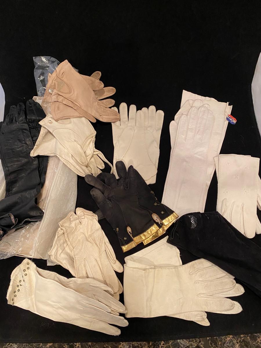 11 unique pairs of vintage leather and cloth gloves. Multiple appear not to be worn. One pair is white leather with tag still on is made by Grenoble, and a size 7 (which is most likely indicative of the sizes of the other pairs). Condition as shown.