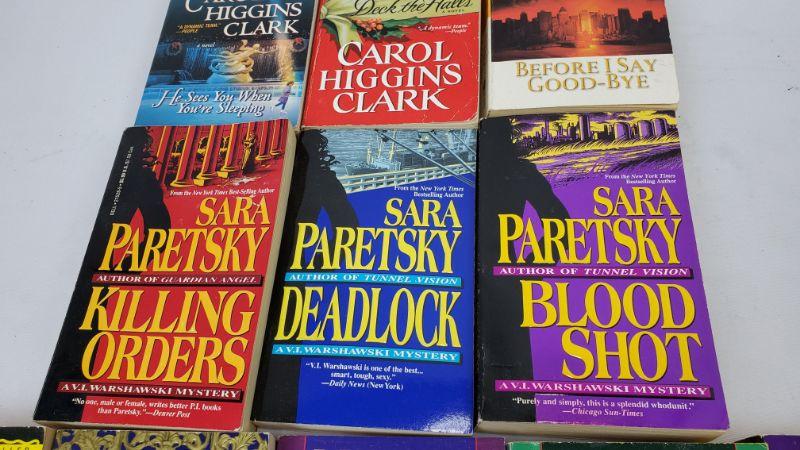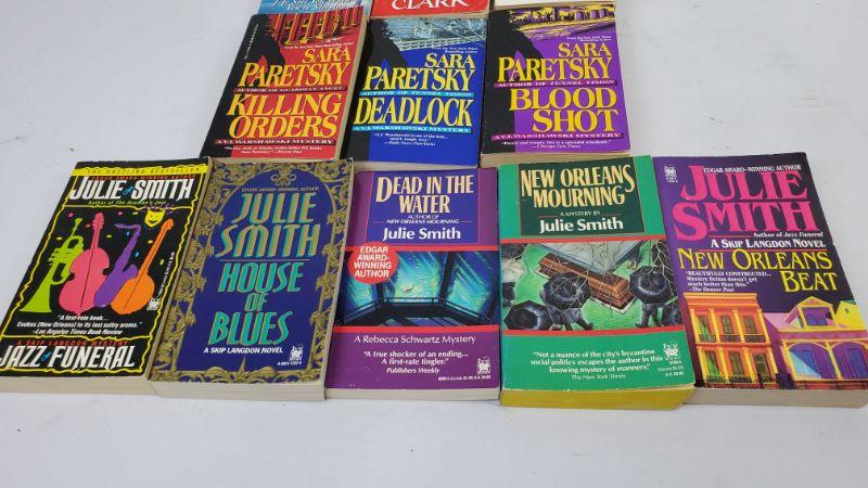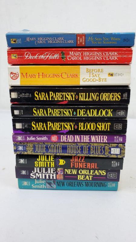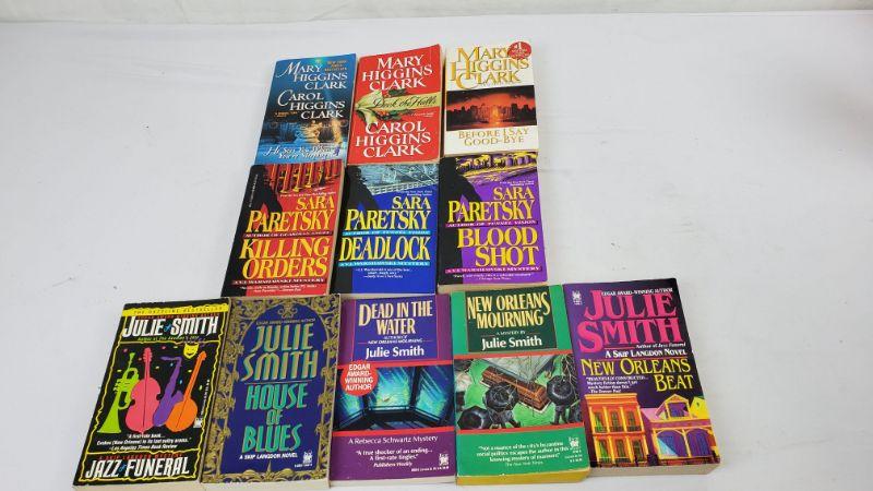 11 Paperback Books: 3 Mary Higgins Clark, 3 Sara Paretsky, and 5 Julie Smith