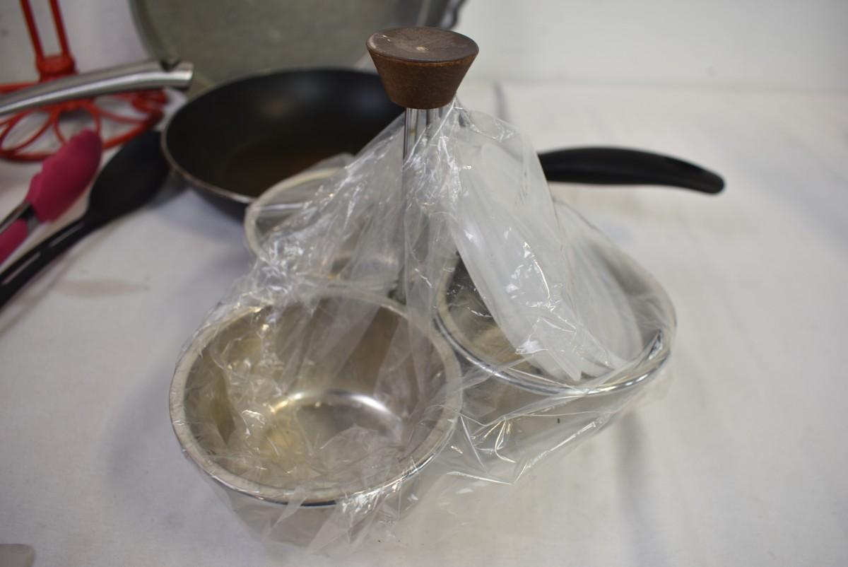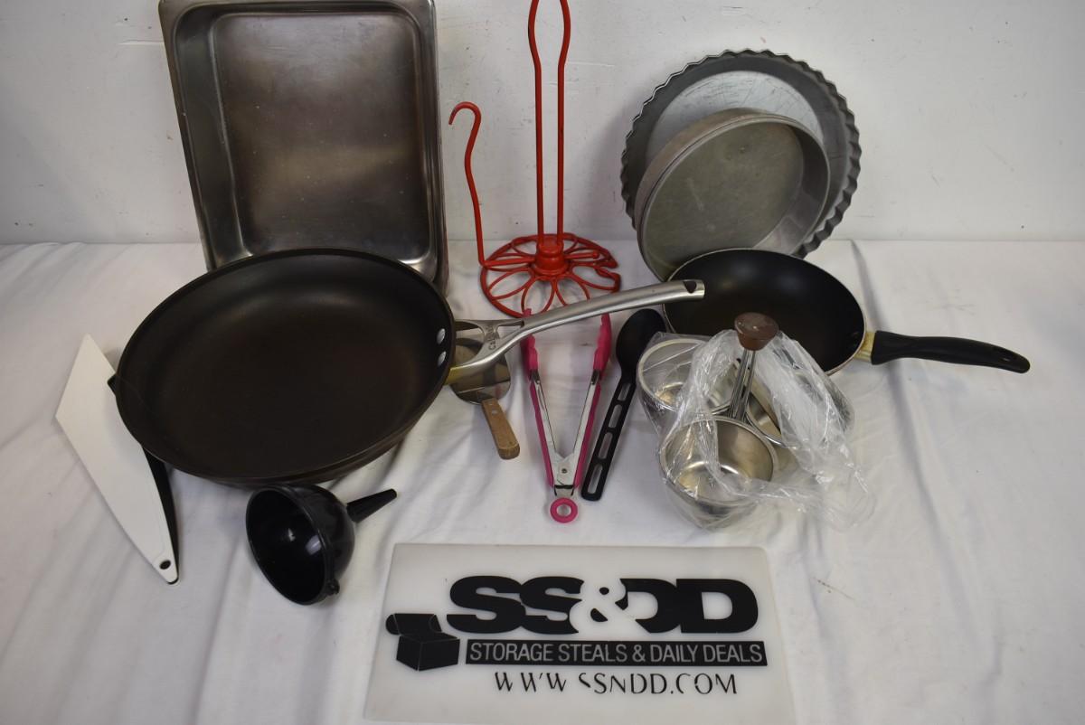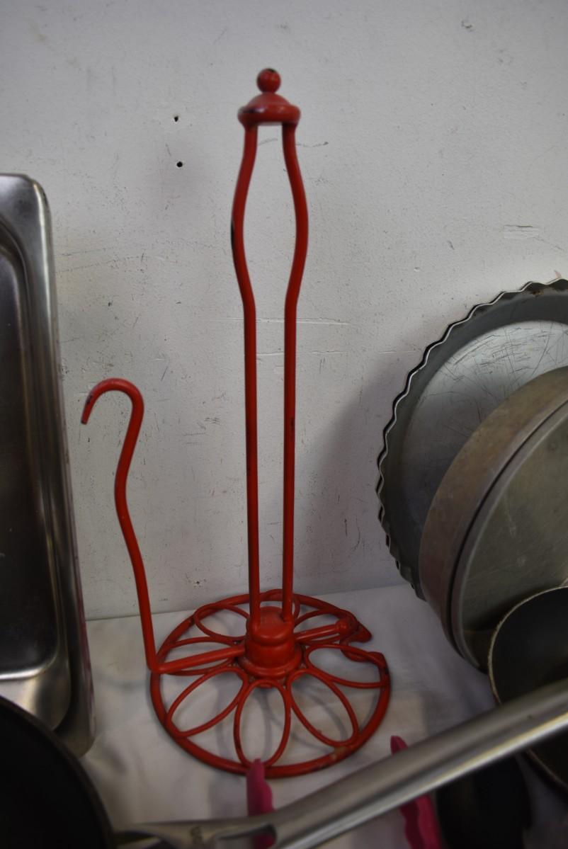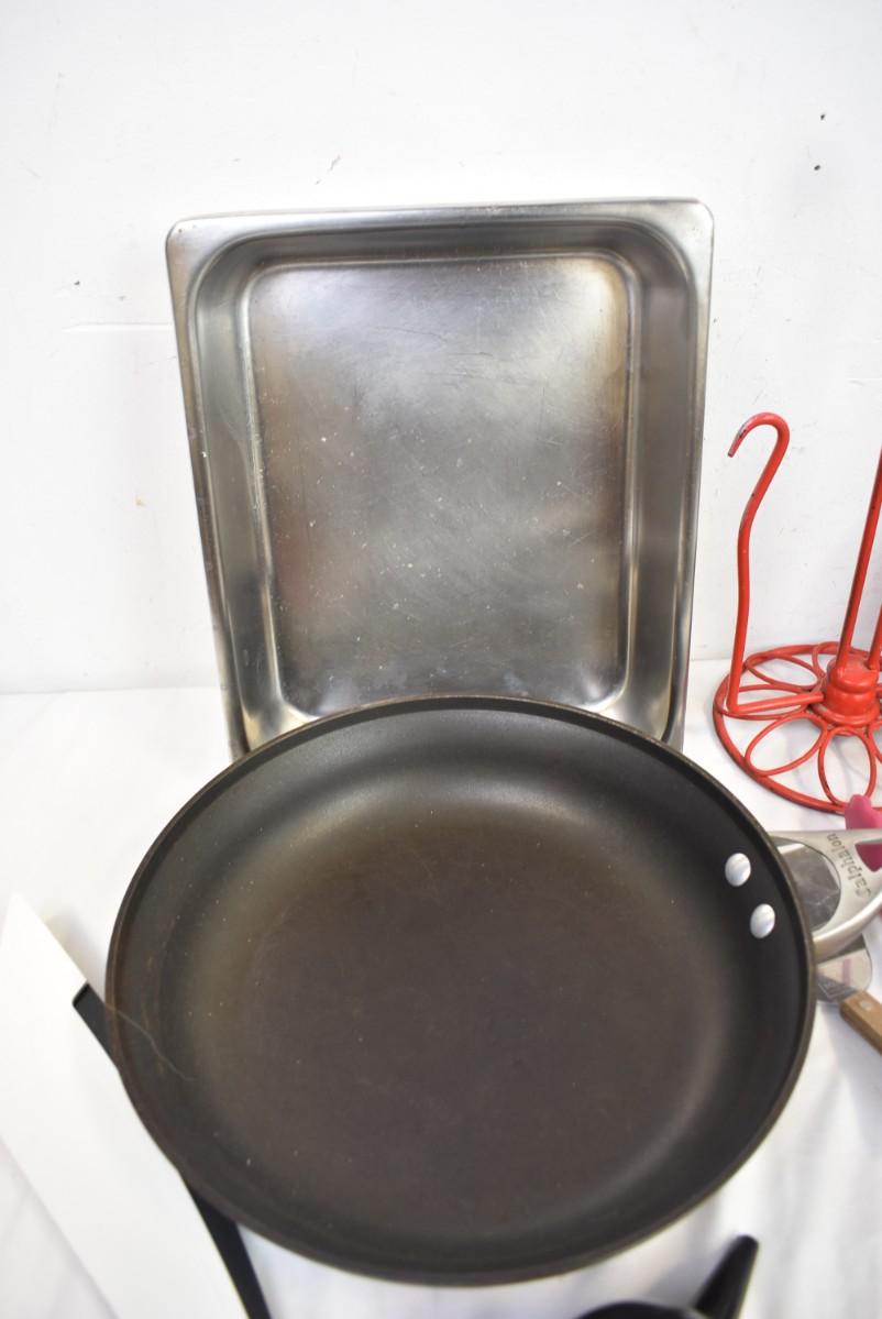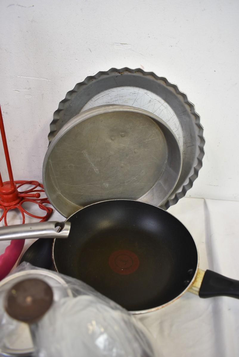 11 pc Kitchen: Calphalon Pan, Pie Pans, T-Fal, Paper Towel Holder