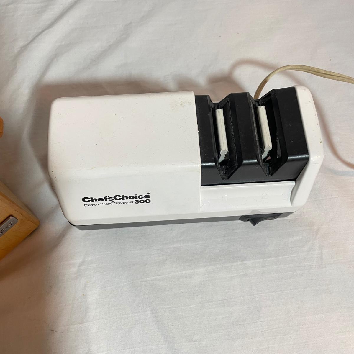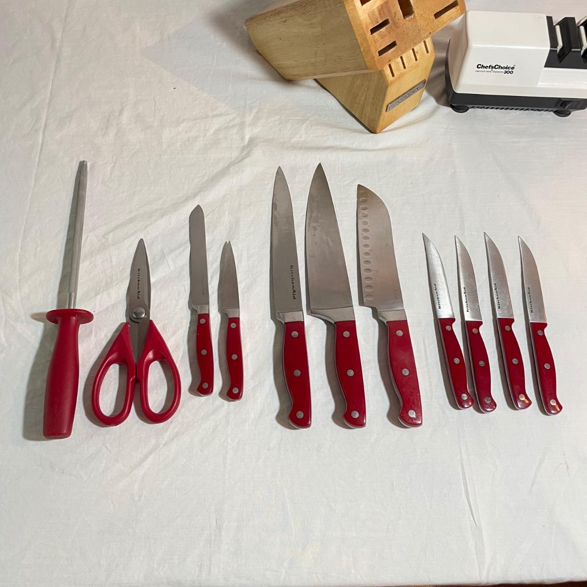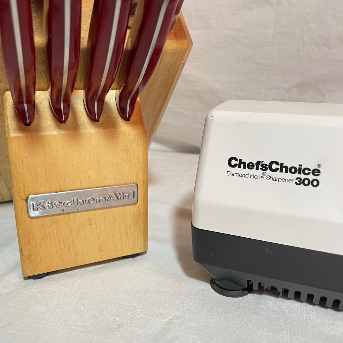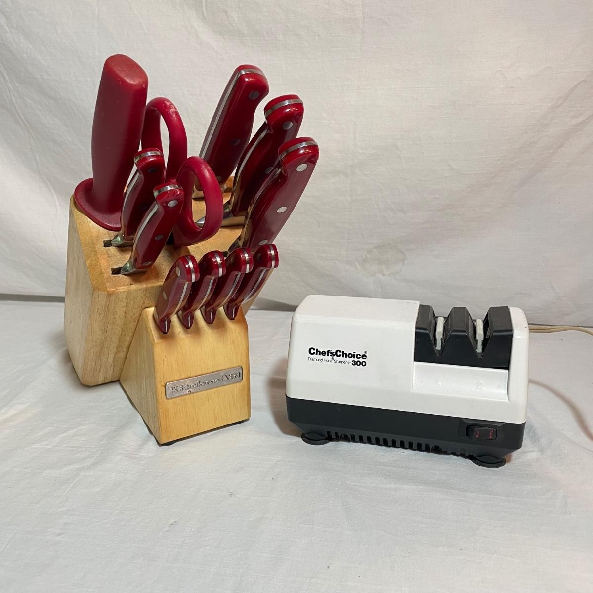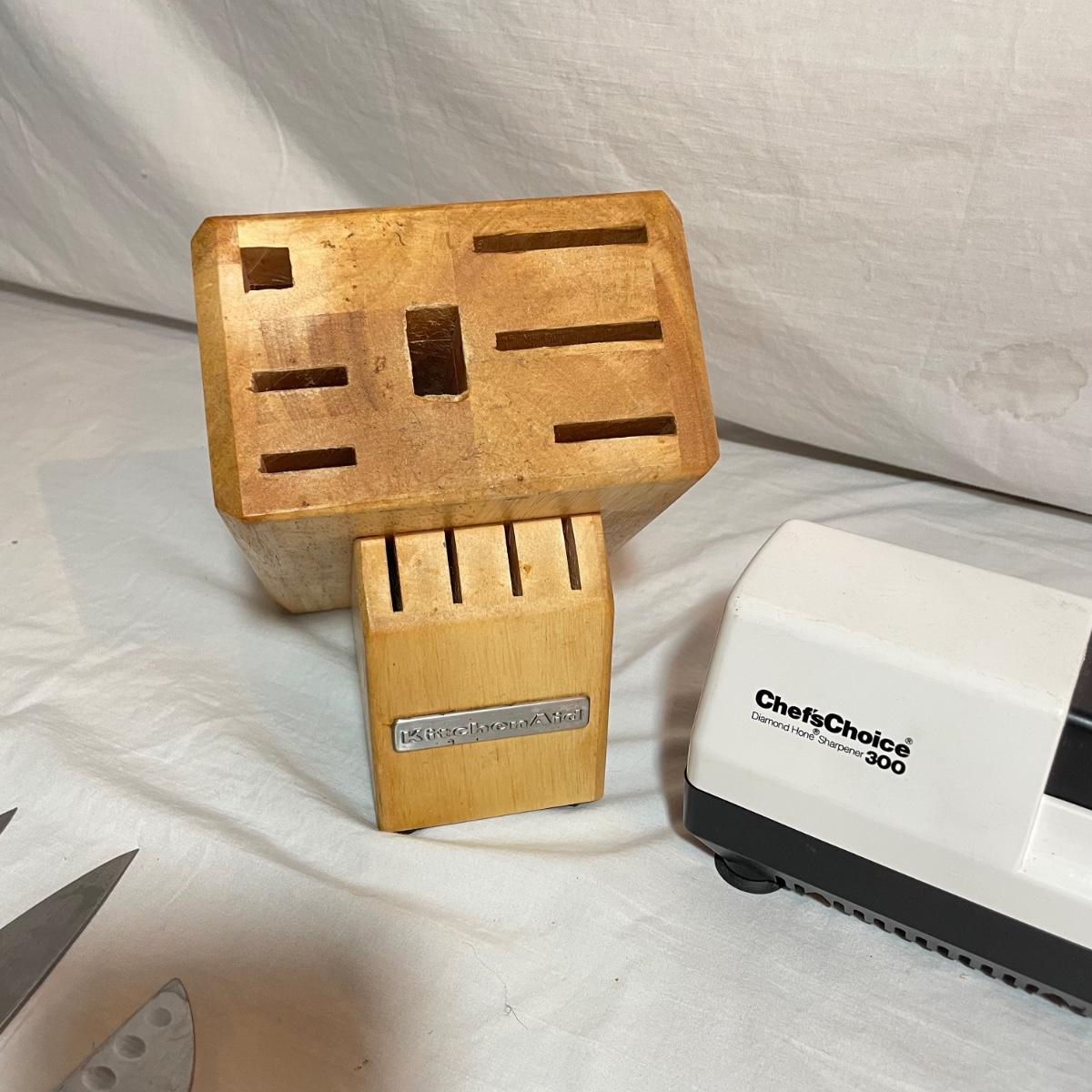 Wooden KitchenAid knife block with nine knives, scissors and manual sharpener plus a Chef’s Choice 300 electric knife sharpener. Longest blade is 8”. Electric sharpener turned on when plugged in. The knife block needs a little cleaning. See images. Shipping available.
