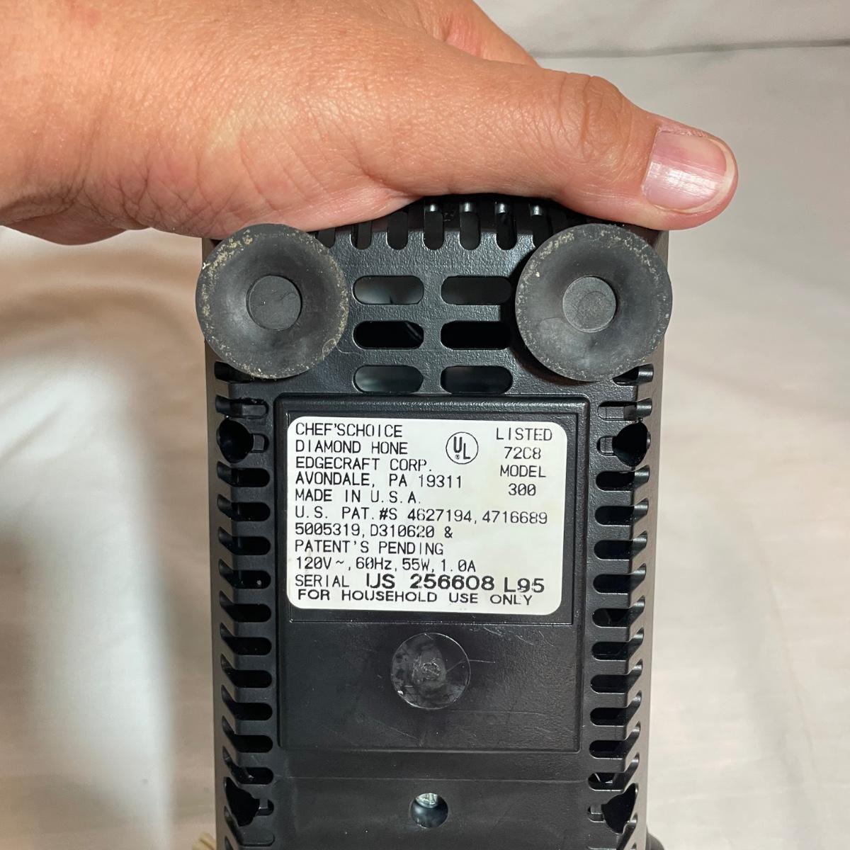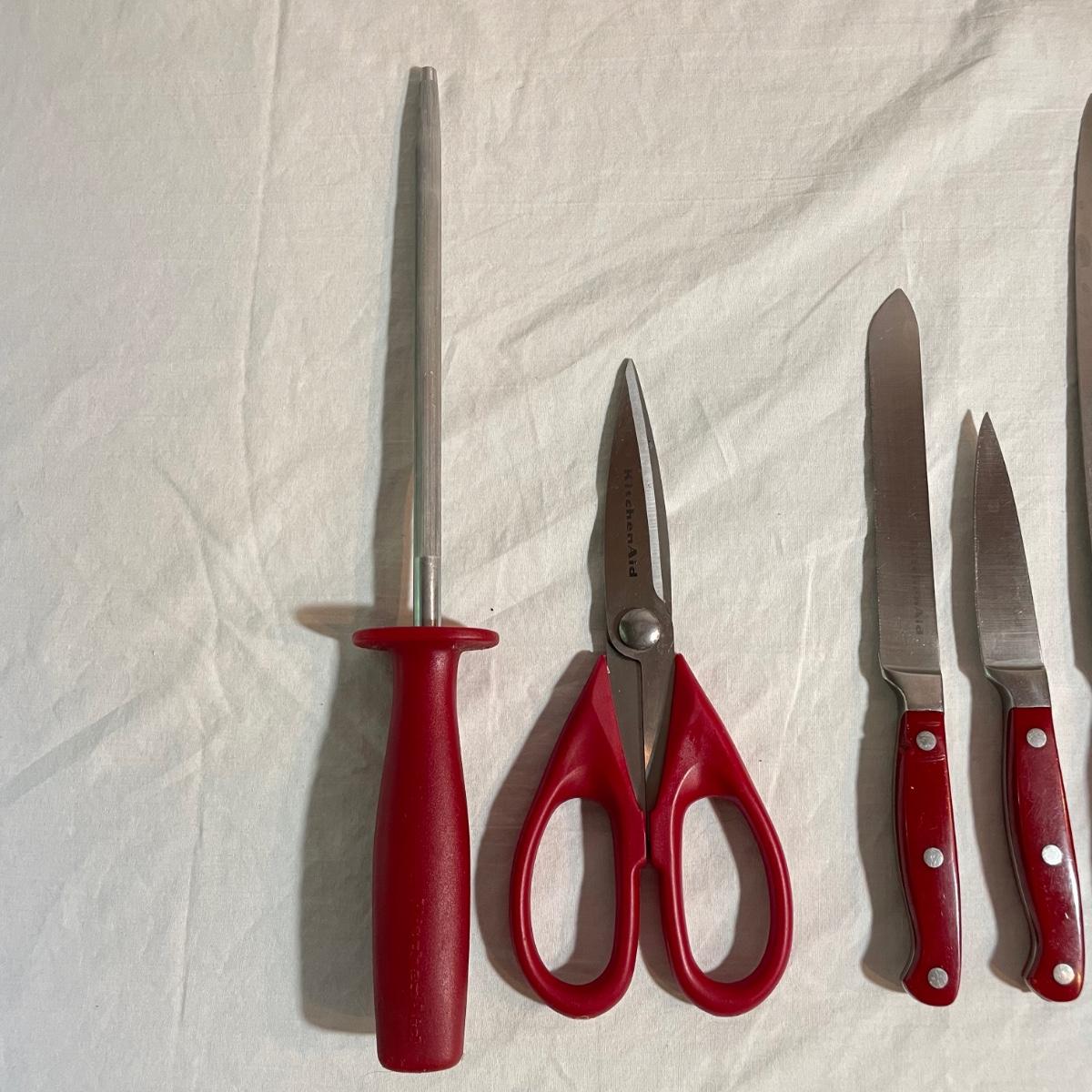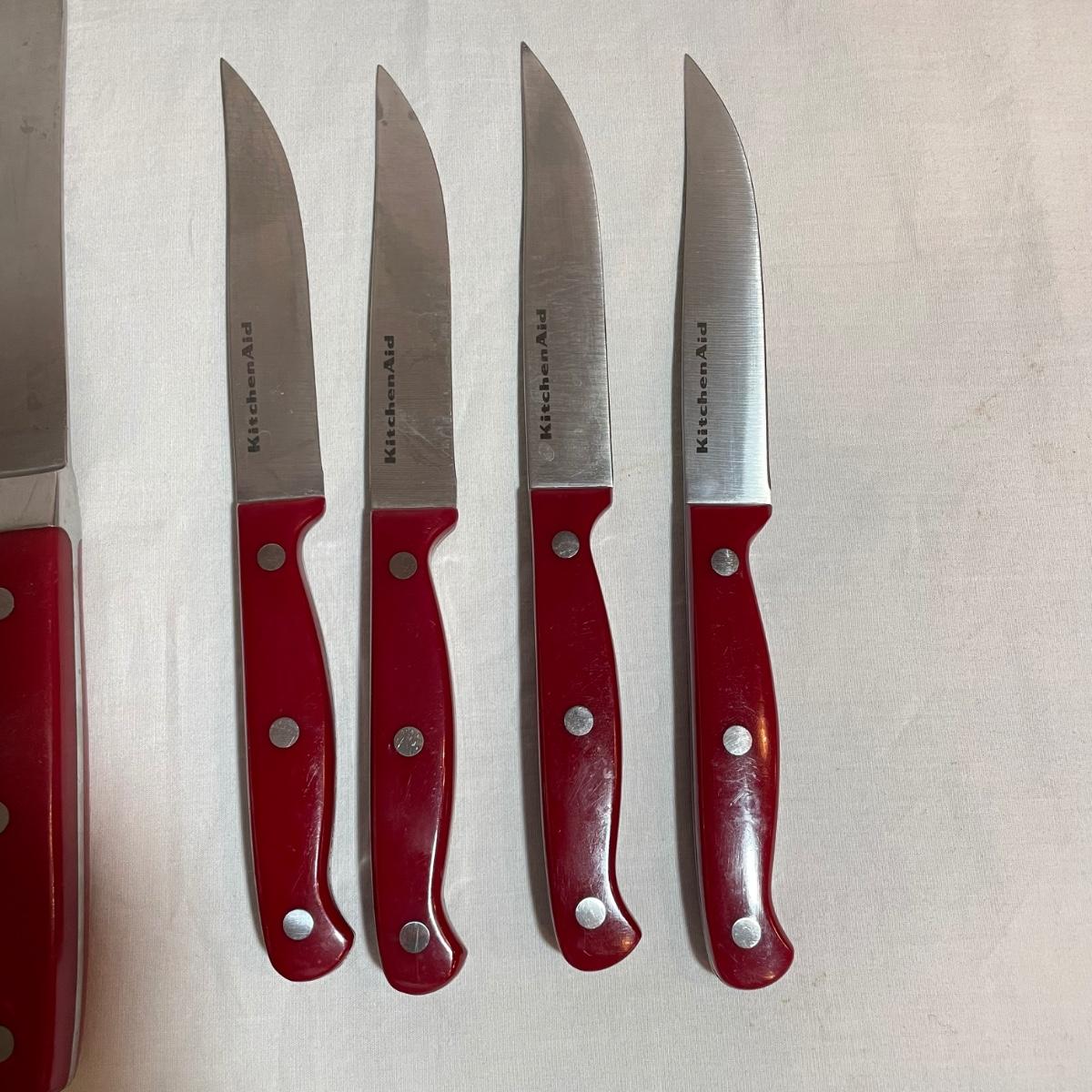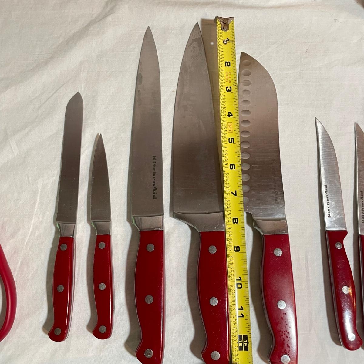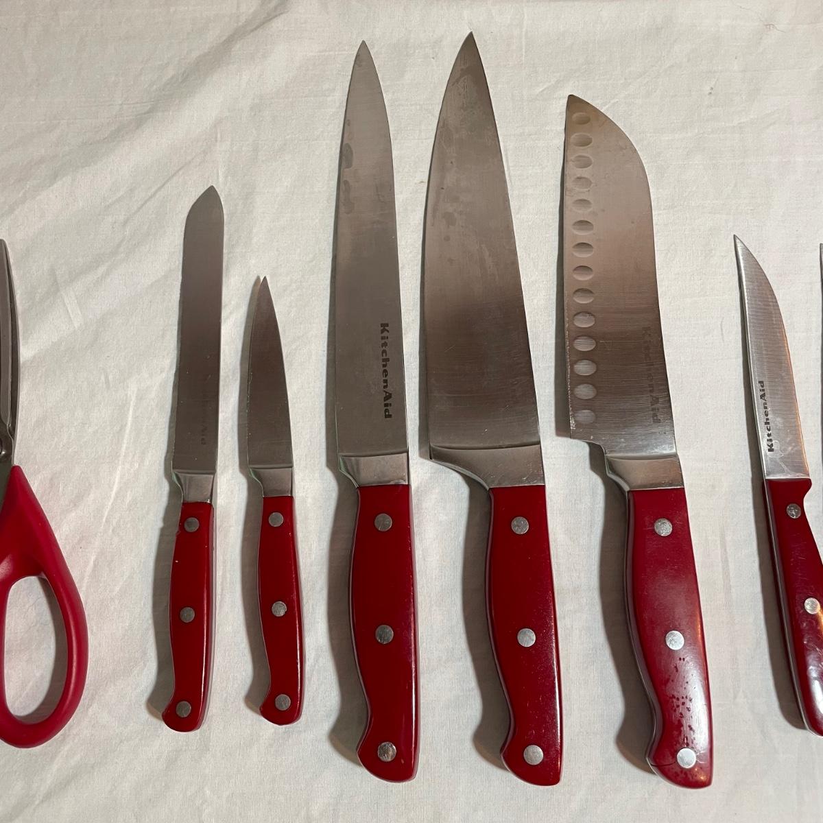Wooden KitchenAid knife block with nine knives, scissors and manual sharpener plus a Chef’s Choice 300 electric knife sharpener. Longest blade is 8”. Electric sharpener turned on when plugged in. The knife block needs a little cleaning. See images. Shipping available.