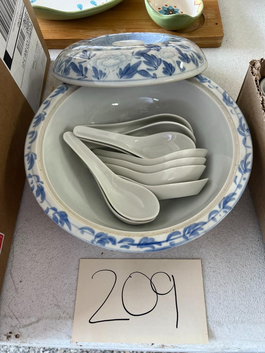 1 Serving Bowl W/Lid, 9 Soup Spoons