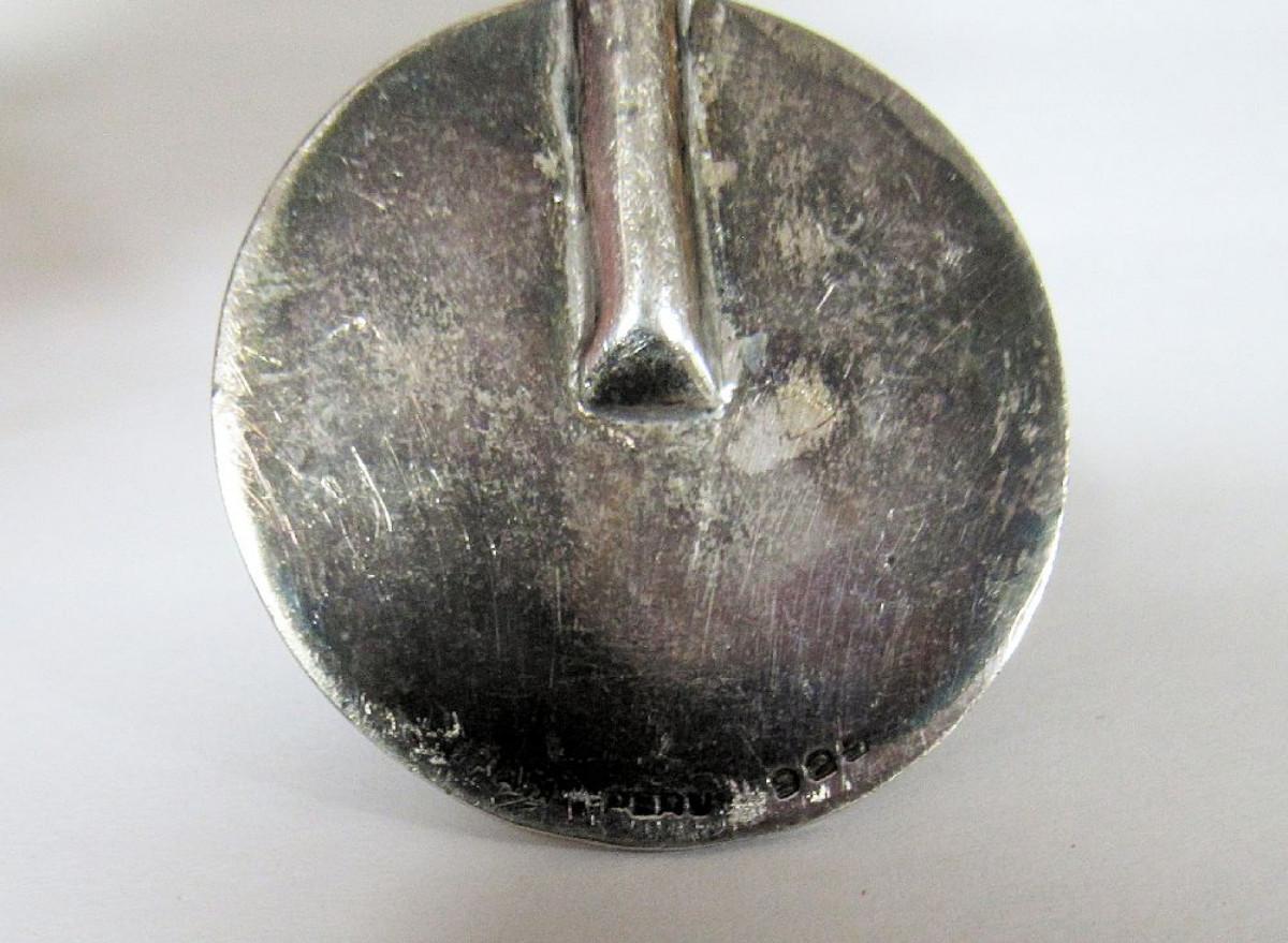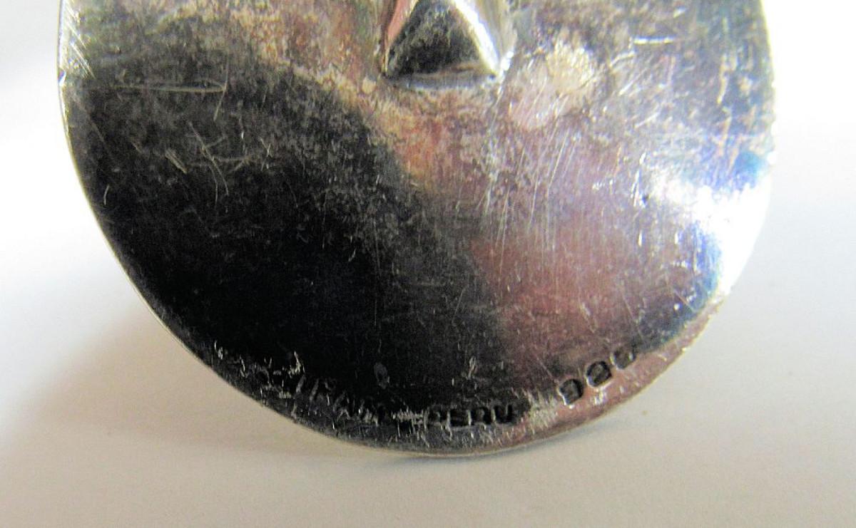 Good shape. Very tarnished, needs shining/buffing. The bottom disk is marked Peru 925 - I don't know if the entire thing is silver or not. Didn't have it tested. See all photos.