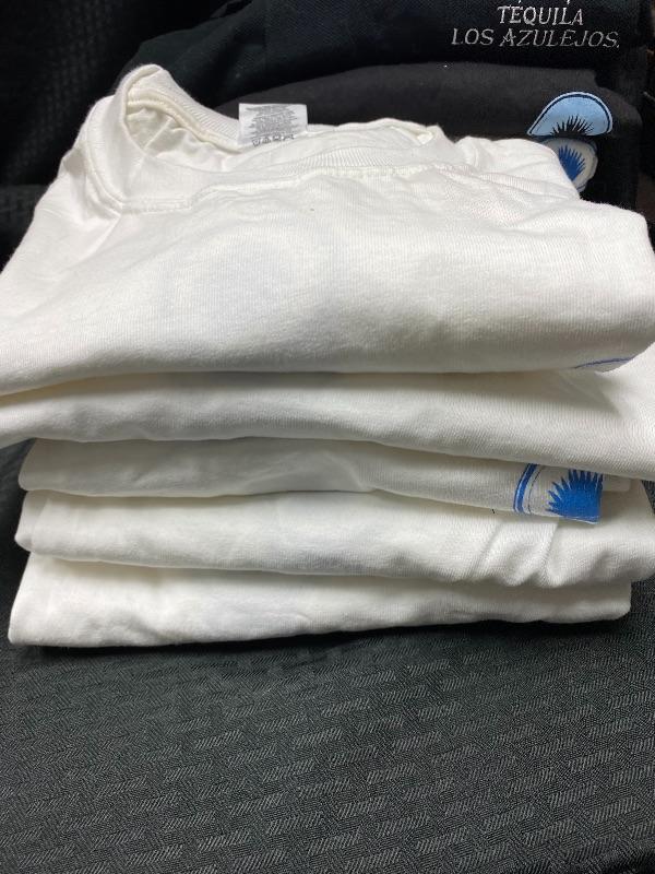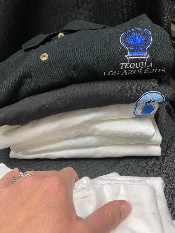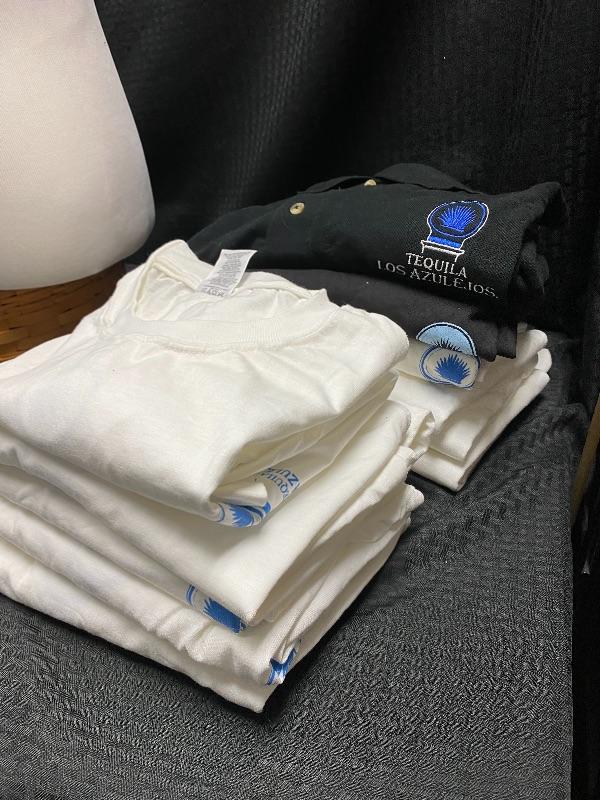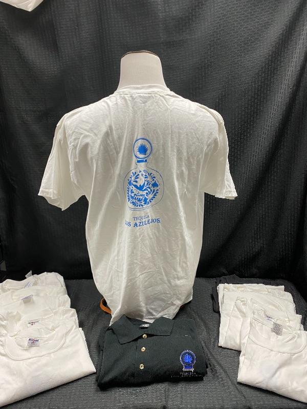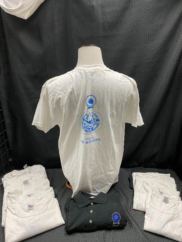 Lot of 11 Tequila Azul shirts. Shirts are sized Large & X Large. Lot is made of 9 white tshirts, 1 black tshirt, and 1 black polo shirt. All are new old stock promo shirts.