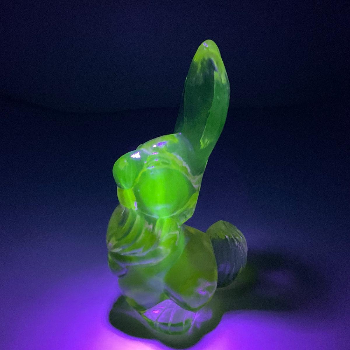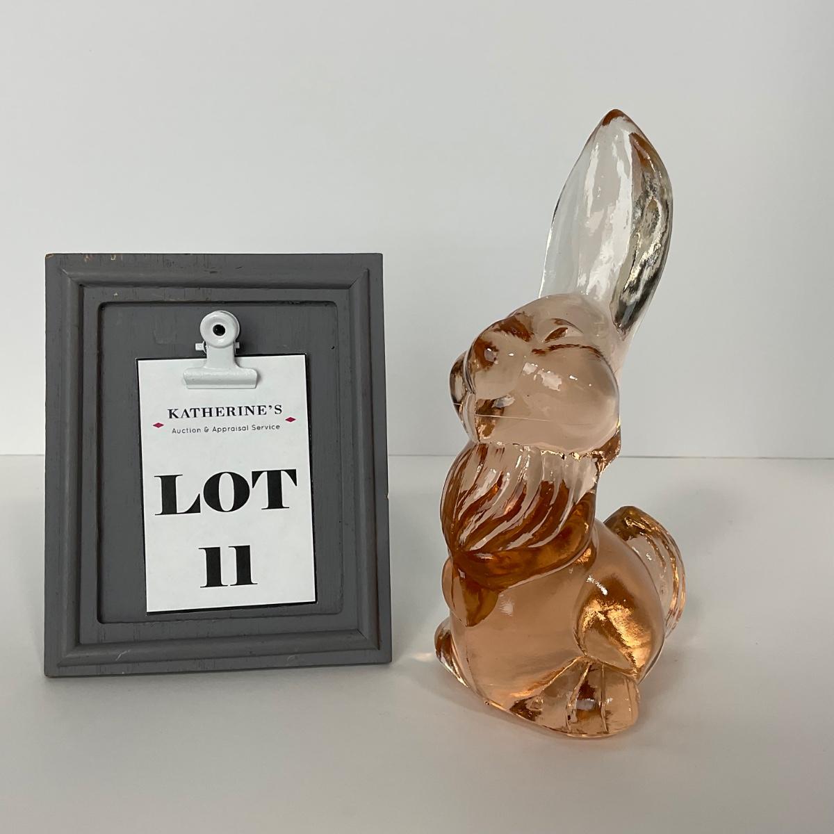 One uranium Viking glass peach epic bunny thumper marked piece. This piece is uranium glass so does glow beautifully under black light. This piece has no damage, and appears to be in great shape with no visable chips, cracks, or broken pieces. 6 3/4 inches tall. Please see photos for details and condition. Any condition statement is given as a courtesy to a client, is an opinion, and should not be treated as a statement of fact. Reference to condition written, oral or within a condition report shall not be regarded as a full account of condition and may not include all defects, alterations, or restorations. Absence of a condition report does not imply a lot is flawless or lacking imperfections or damage. Katherine’s Auction & Appraisal Service shall have no responsibility for any error or omission. Returns shall not be accepted on the basis of condition. ::: Shipping is available on this lot. If you require shipping you must let us know at the close of the auction. We will coordinate with you after the item has been won. Shipping fees will include insurance up to or exceeding the value of all items being mailed. If you have any questions regarding this lot please contact the auctioneer either via this website, by direct email or by phone. PICK UP TIMES and other important information can be found in the TERMS and DESCRIPTION of the auction. Please take a look for pertinent information. Thanks!