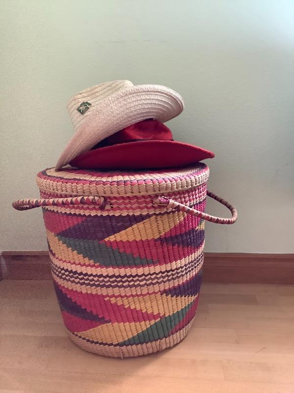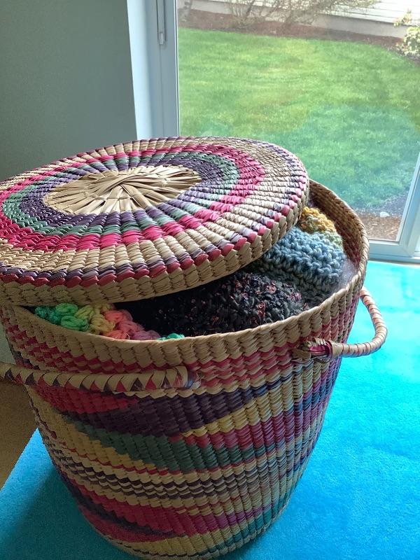 Huge lot of hand crochet scarves along with a few hats All stored in a beautiful large woven basket with lid