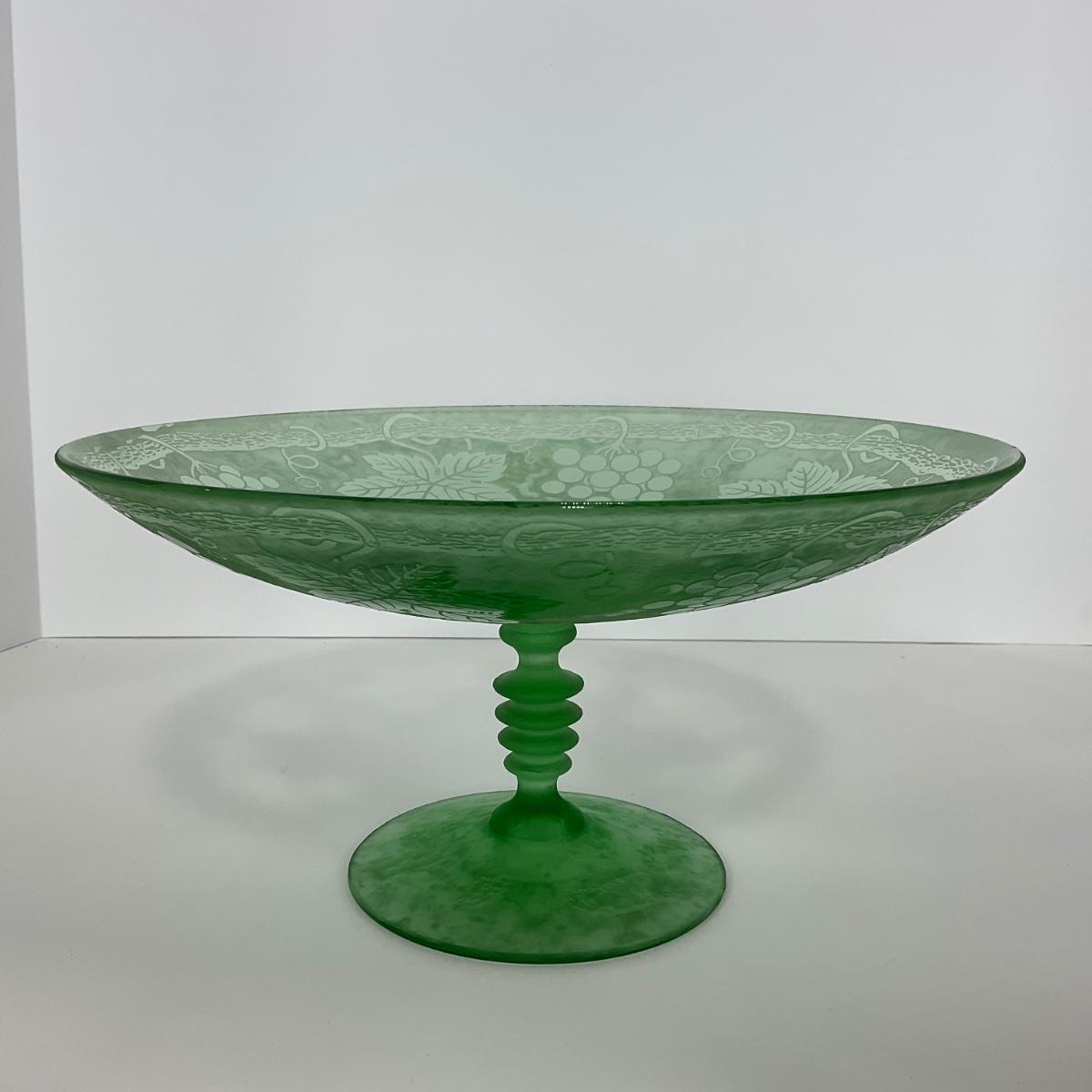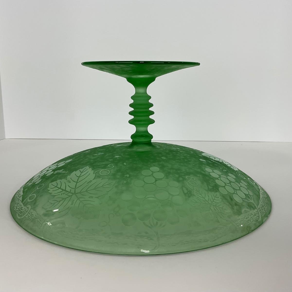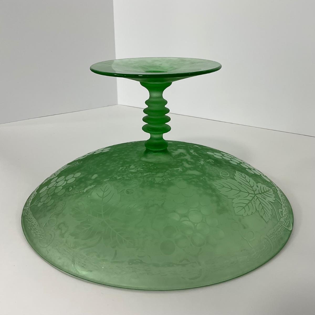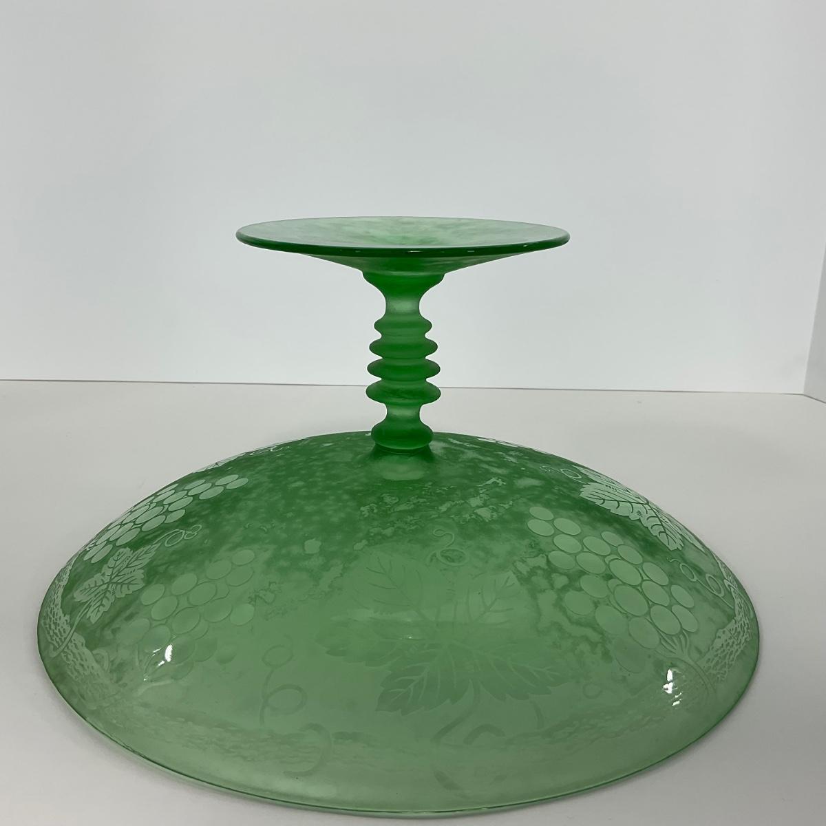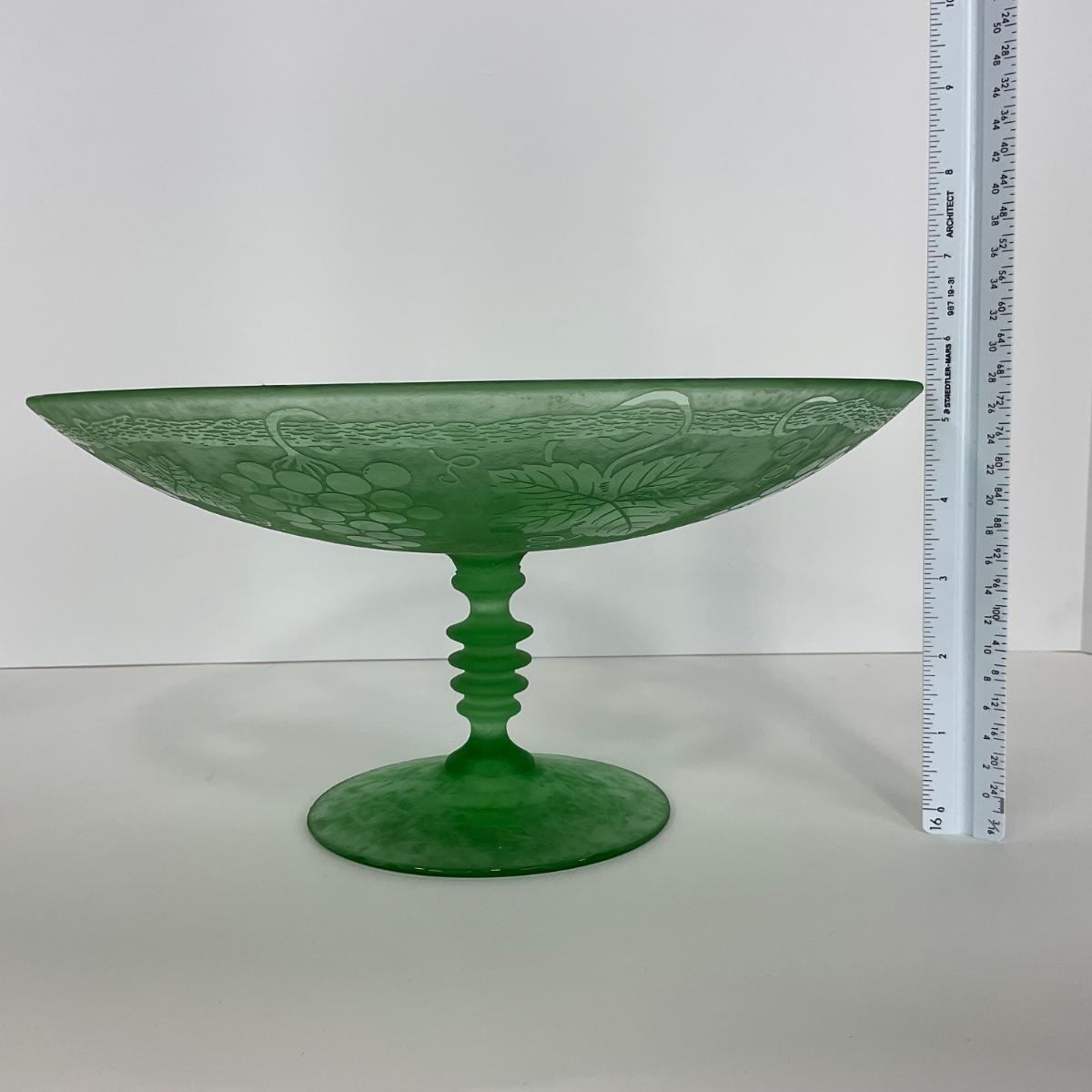 One large green etched Leaf and grapes pattern compote with a twisted stem. Please see photos for details and condition. ::: Shipping is available on this lot. If you require shipping you must let us know at the close of the auction. We will coordinate with you after the item has been won. Shipping fees will include insurance up to or exceeding the value of all items being mailed. If you have any questions regarding this lot please contact the auctioneer either via this website, by direct email or by phone. PICK UP TIMES and other important information can be found in the TERMS and DESCRIPTION of the auction. Please take a look for pertinent information. Thanks!