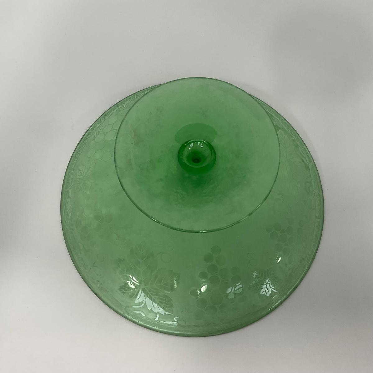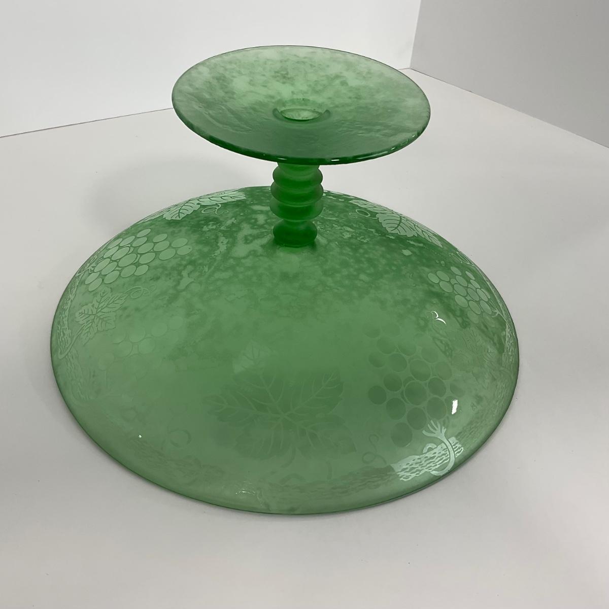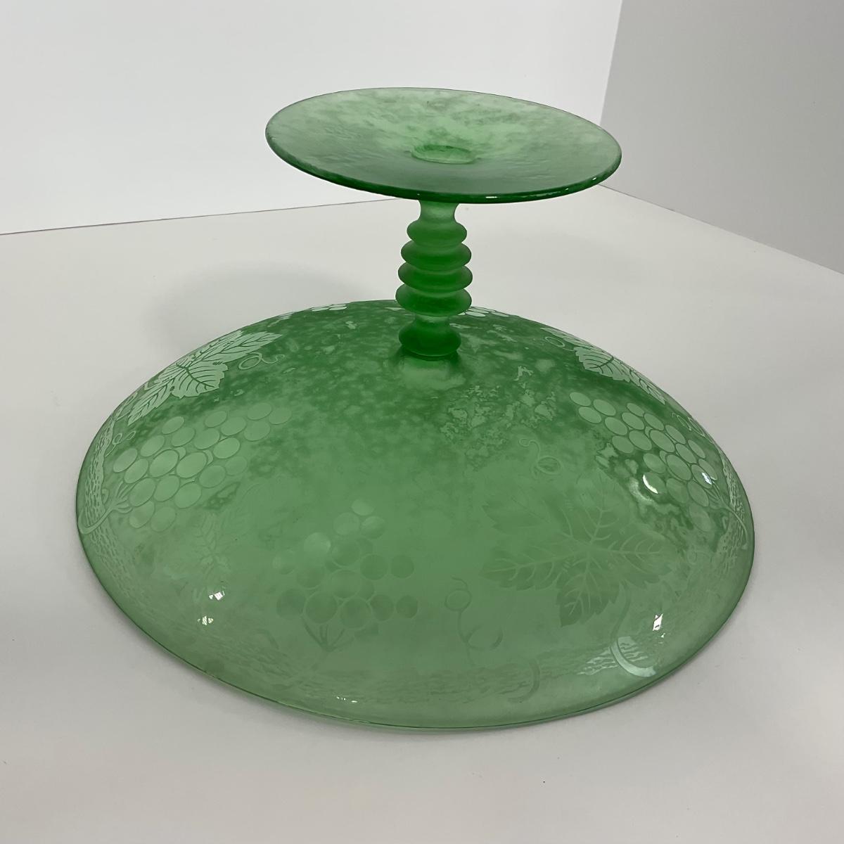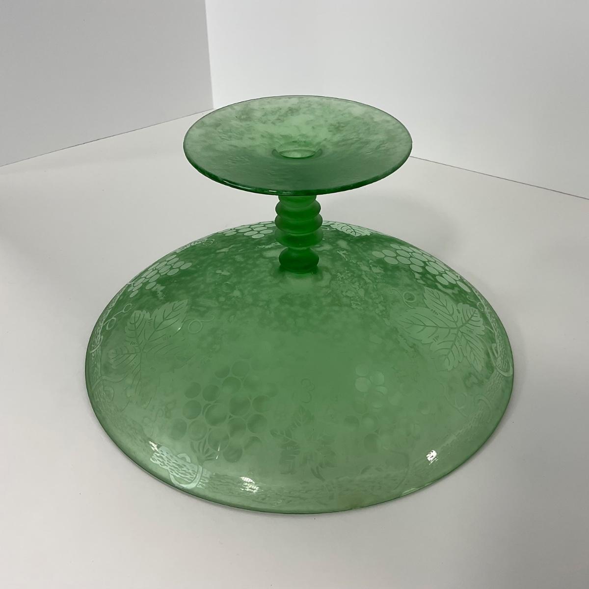 One large green etched Leaf and grapes pattern compote with a twisted stem. Please see photos for details and condition. ::: Shipping is available on this lot. If you require shipping you must let us know at the close of the auction. We will coordinate with you after the item has been won. Shipping fees will include insurance up to or exceeding the value of all items being mailed. If you have any questions regarding this lot please contact the auctioneer either via this website, by direct email or by phone. PICK UP TIMES and other important information can be found in the TERMS and DESCRIPTION of the auction. Please take a look for pertinent information. Thanks!