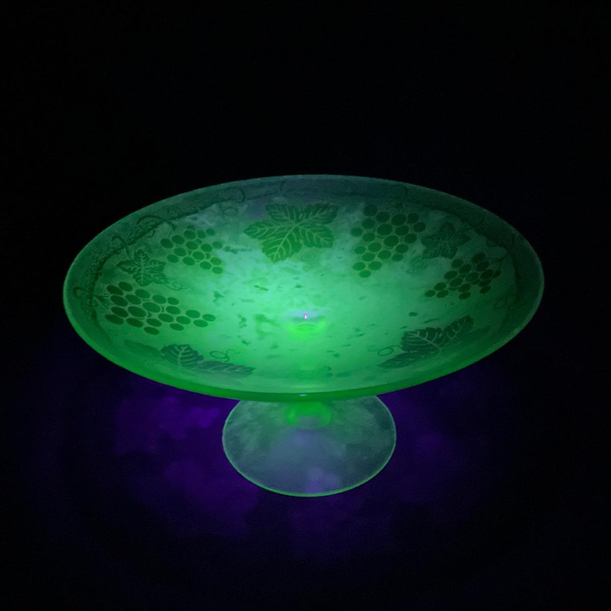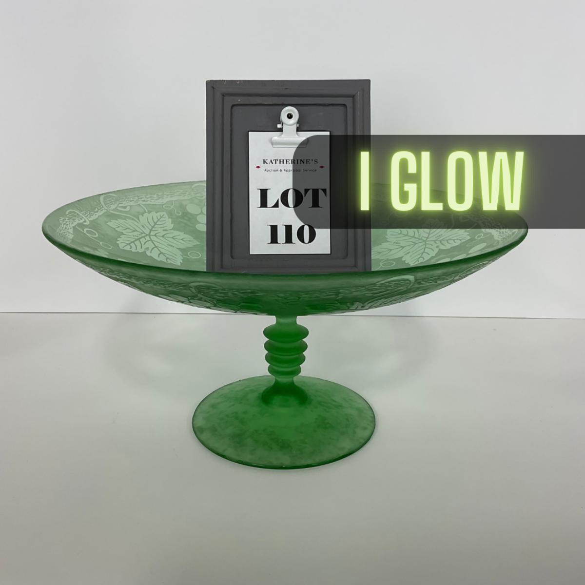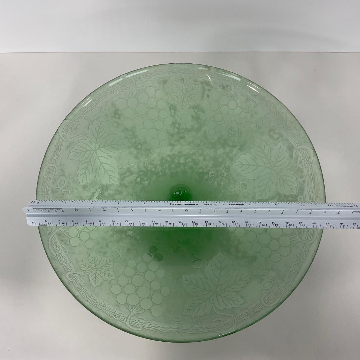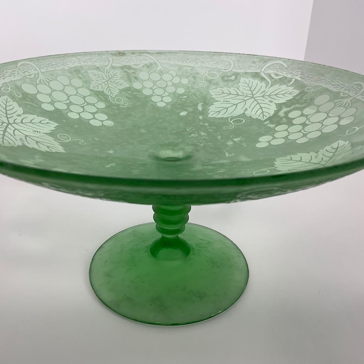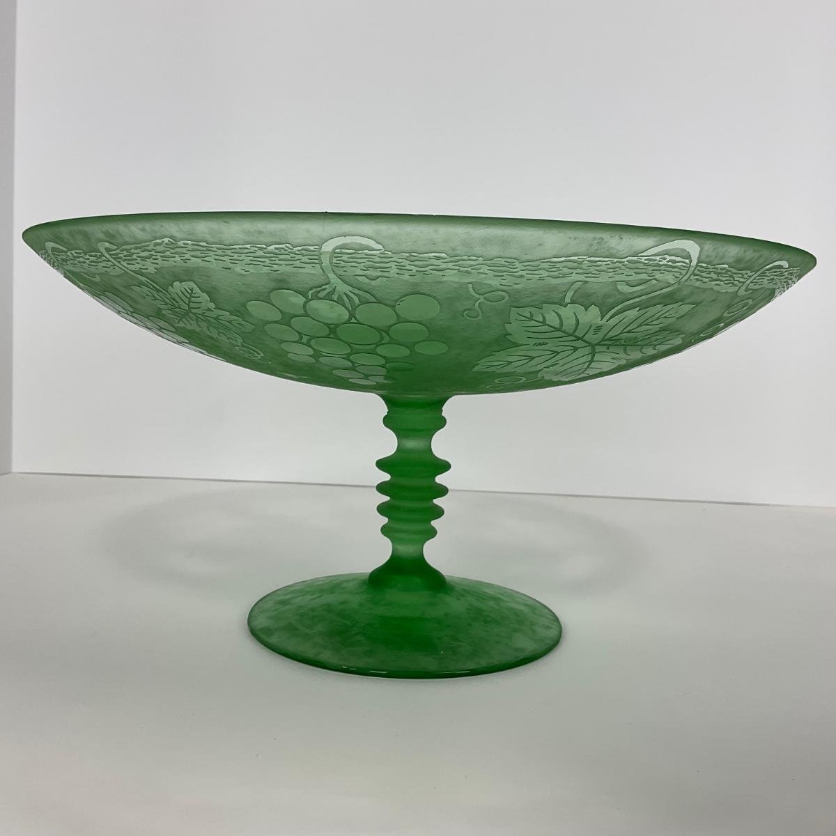 One large green etched Leaf and grapes pattern compote with a twisted stem. Please see photos for details and condition. ::: Shipping is available on this lot. If you require shipping you must let us know at the close of the auction. We will coordinate with you after the item has been won. Shipping fees will include insurance up to or exceeding the value of all items being mailed. If you have any questions regarding this lot please contact the auctioneer either via this website, by direct email or by phone. PICK UP TIMES and other important information can be found in the TERMS and DESCRIPTION of the auction. Please take a look for pertinent information. Thanks!