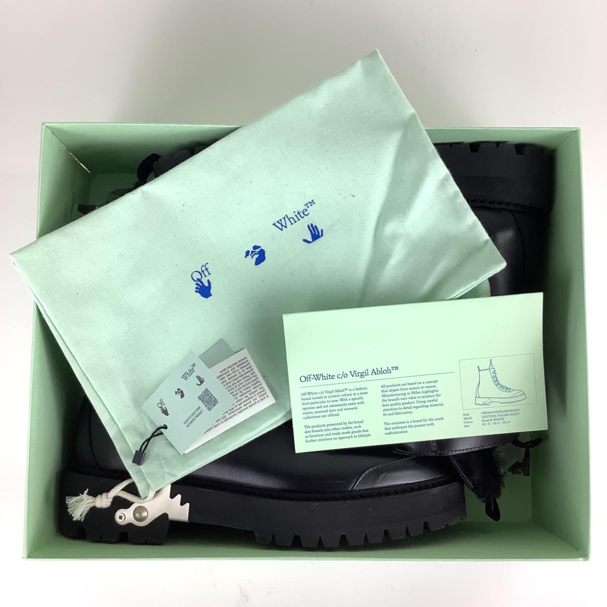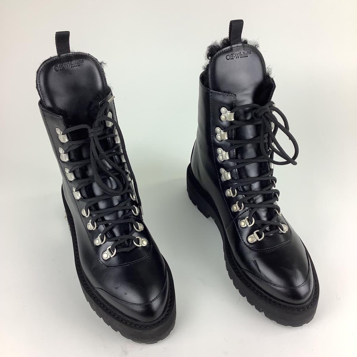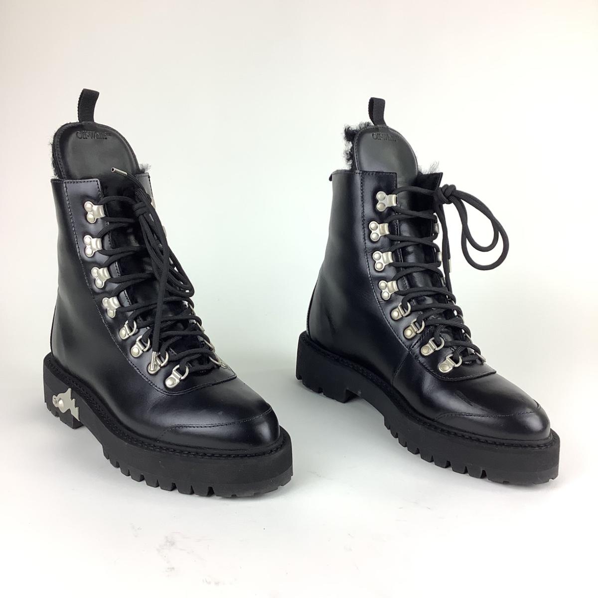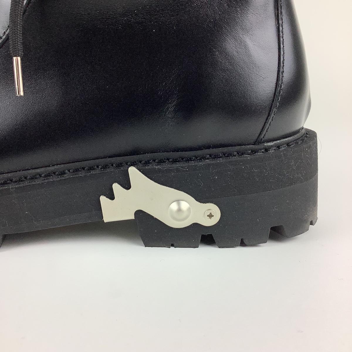 Off-White black leather ankle boots designed in Milan, Italy have padded insoles, thick lug sole,