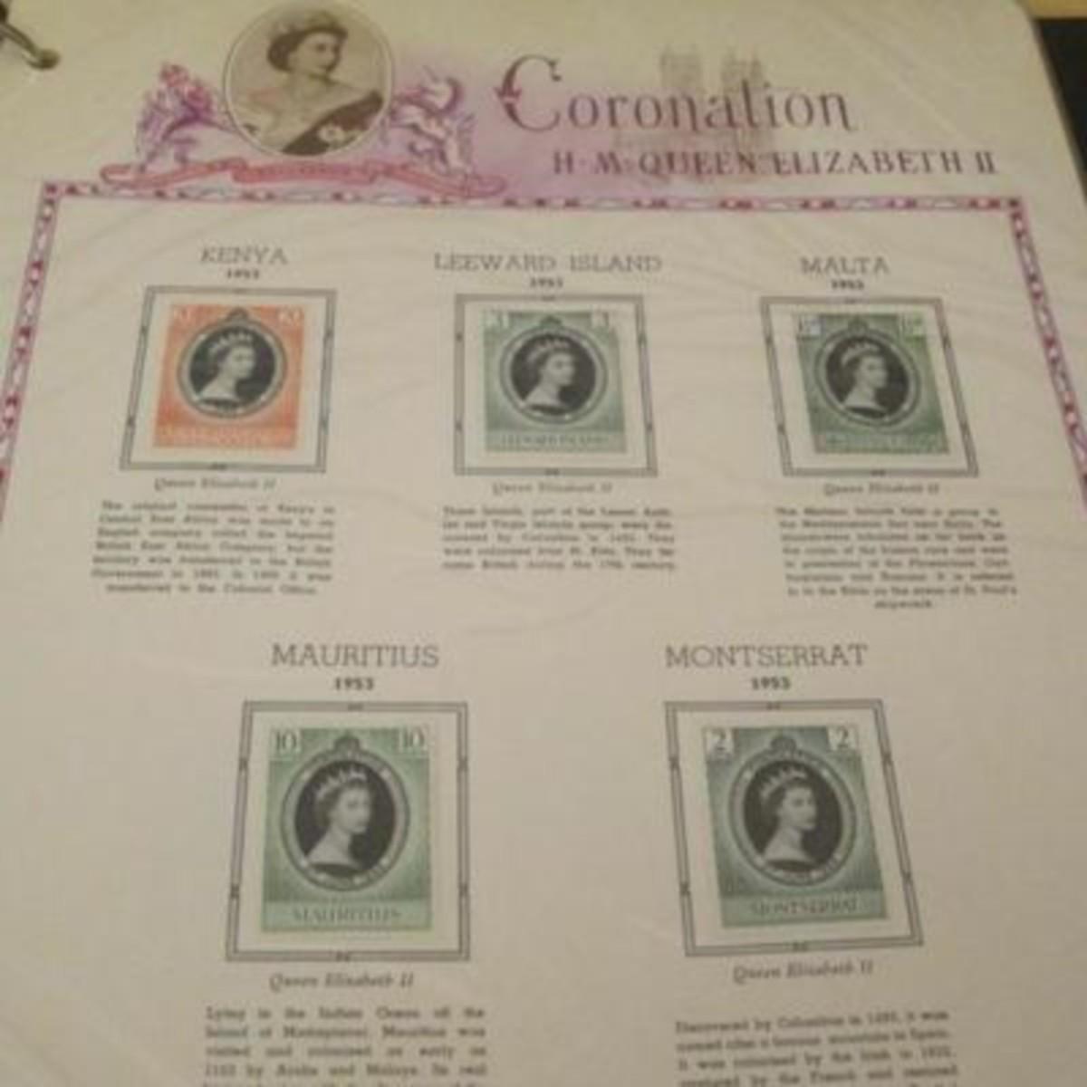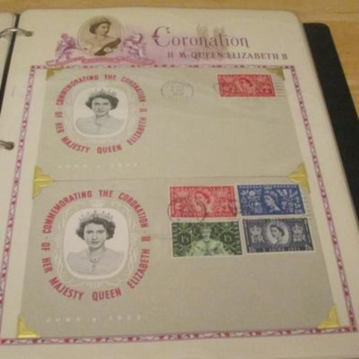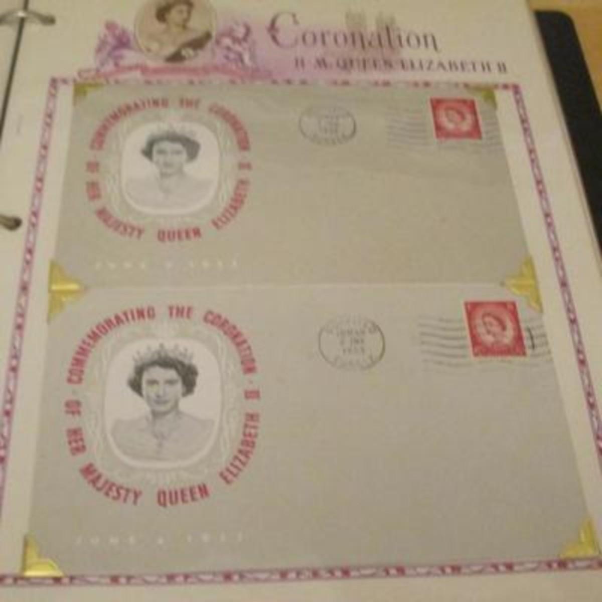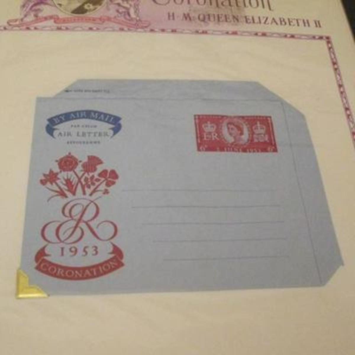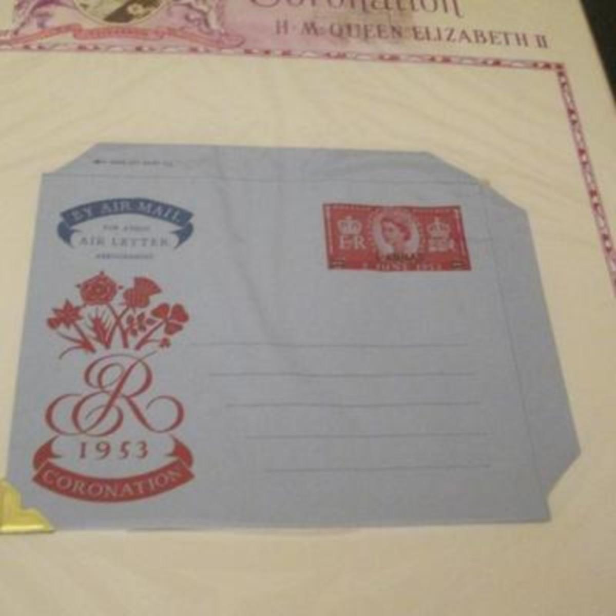 White Ace stamp album for all of the stamps issued by the UK and British colonies in 1953 honoring the Coronation of Queen Elizabeth II. First Day Covers, Air Letters Aerogrammes