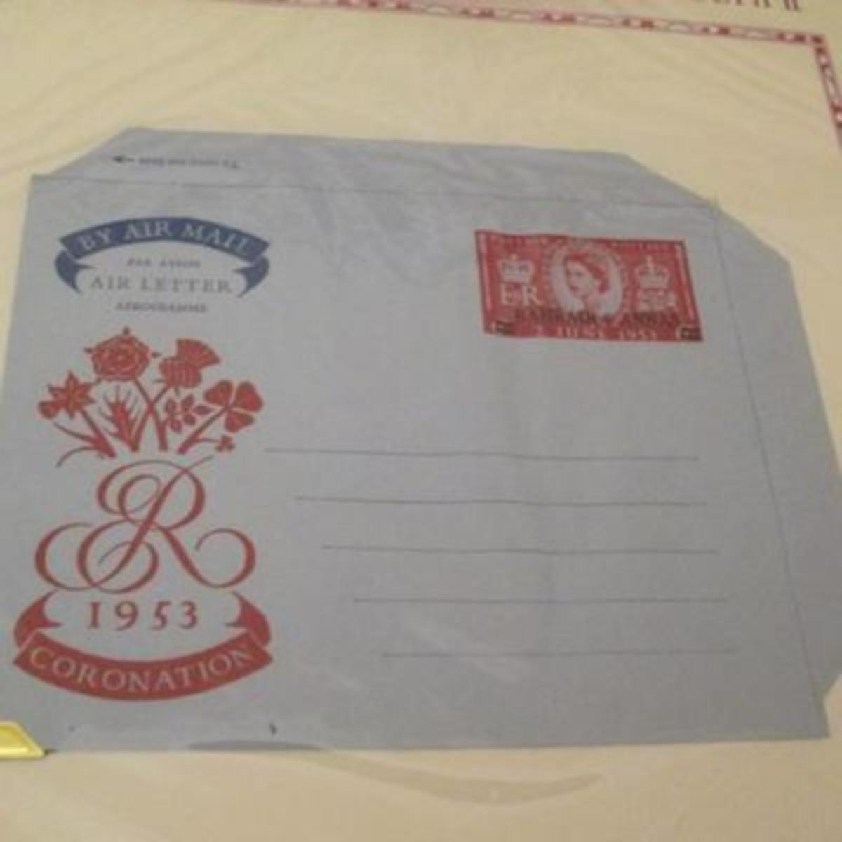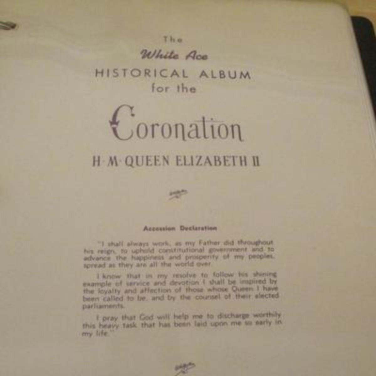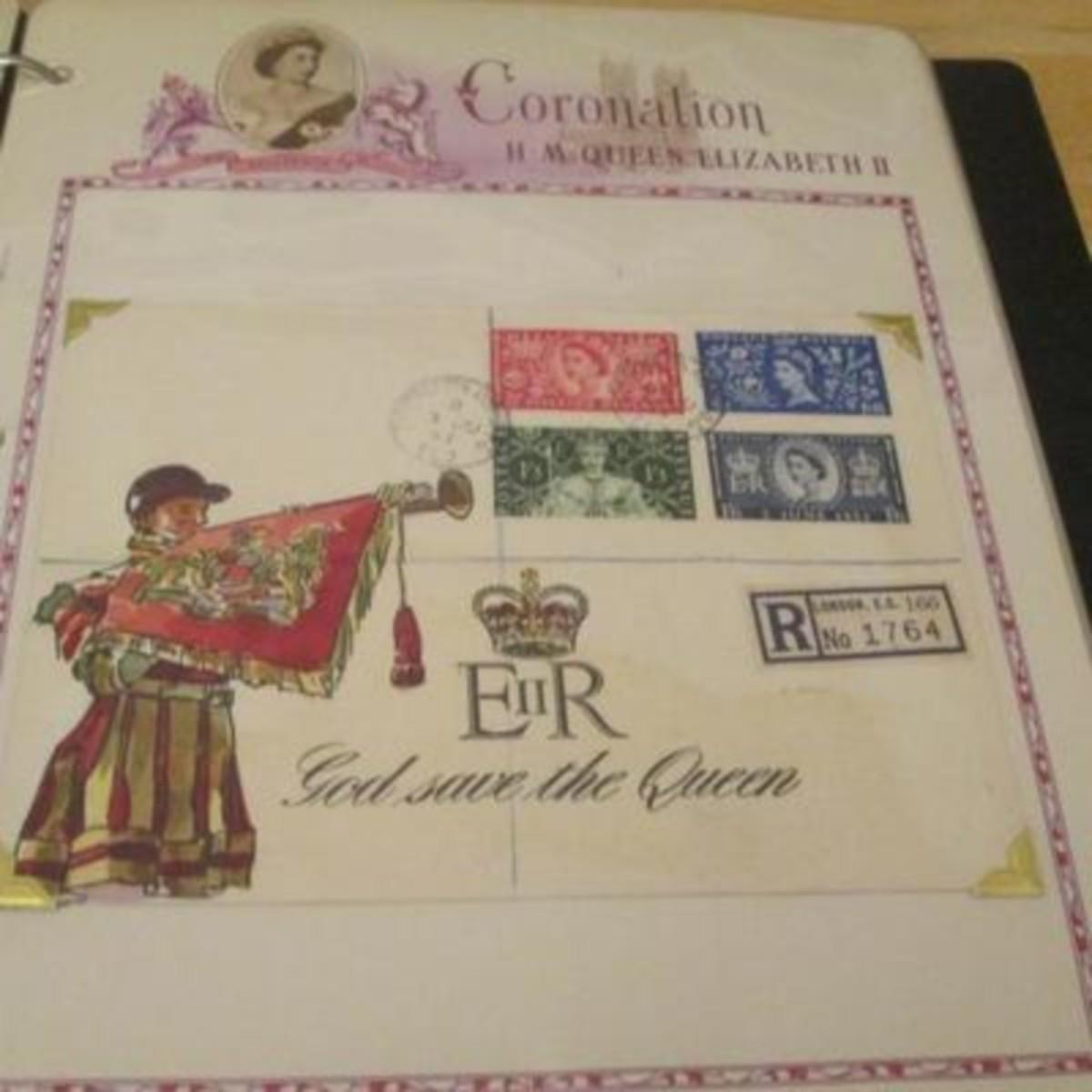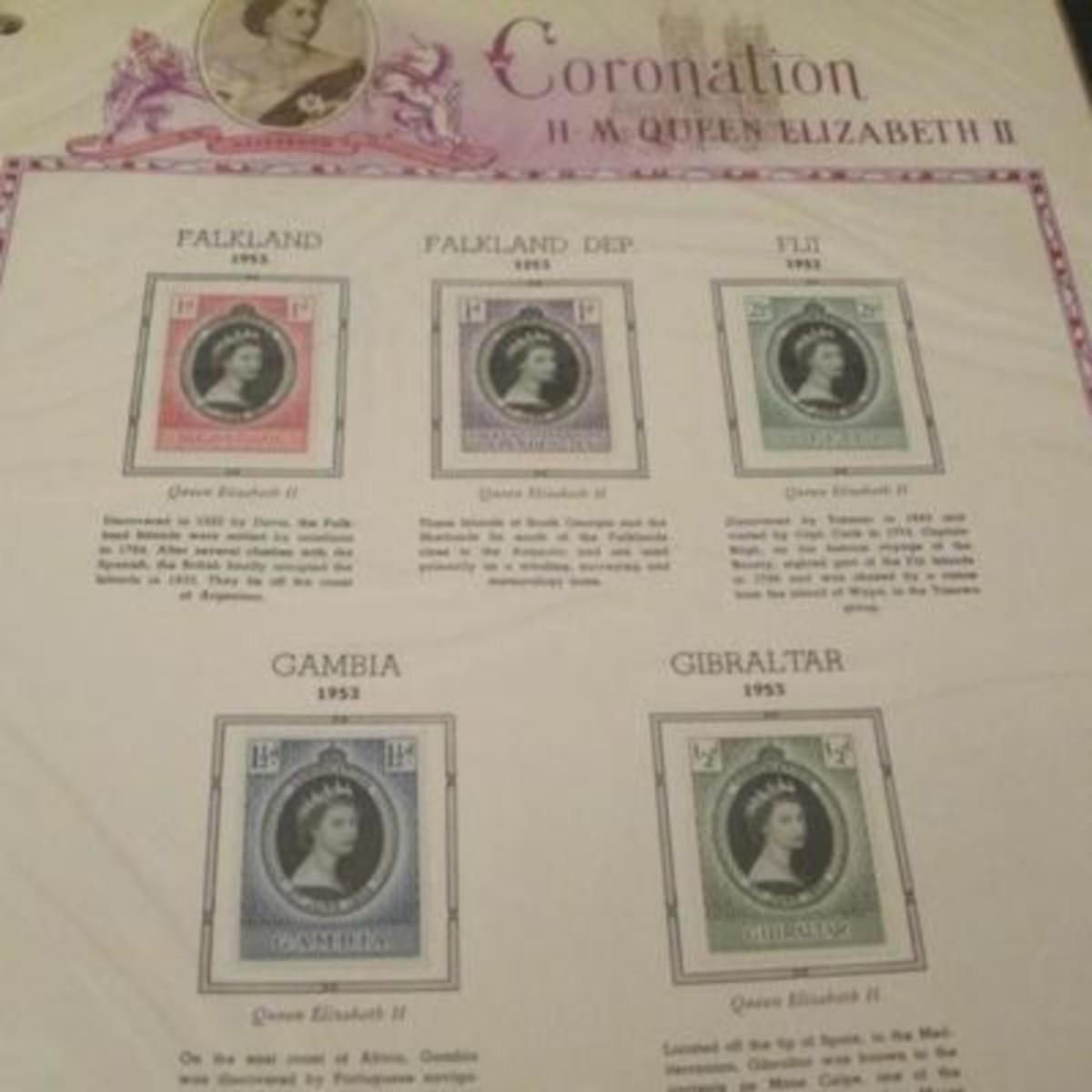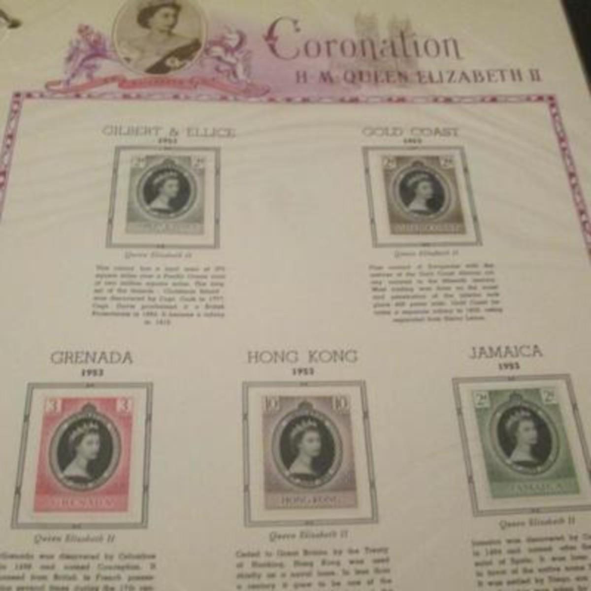 White Ace stamp album for all of the stamps issued by the UK and British colonies in 1953 honoring the Coronation of Queen Elizabeth II. First Day Covers, Air Letters Aerogrammes