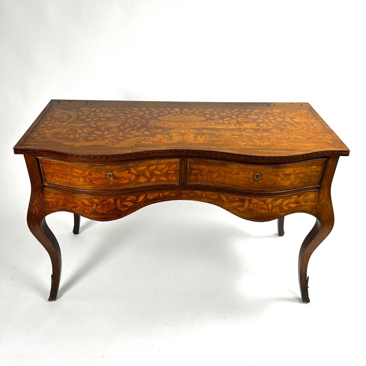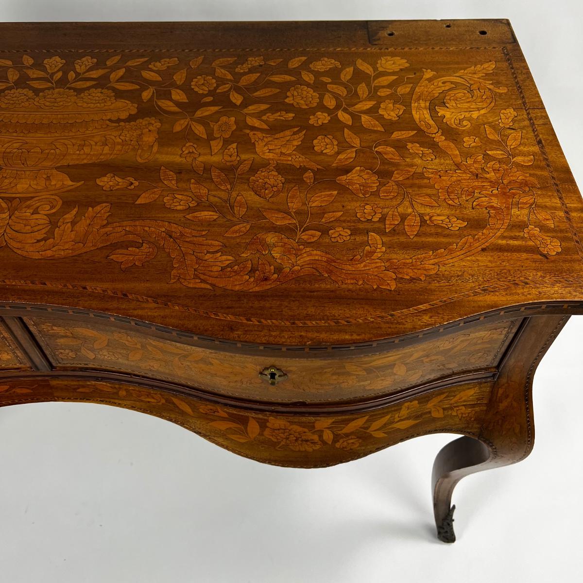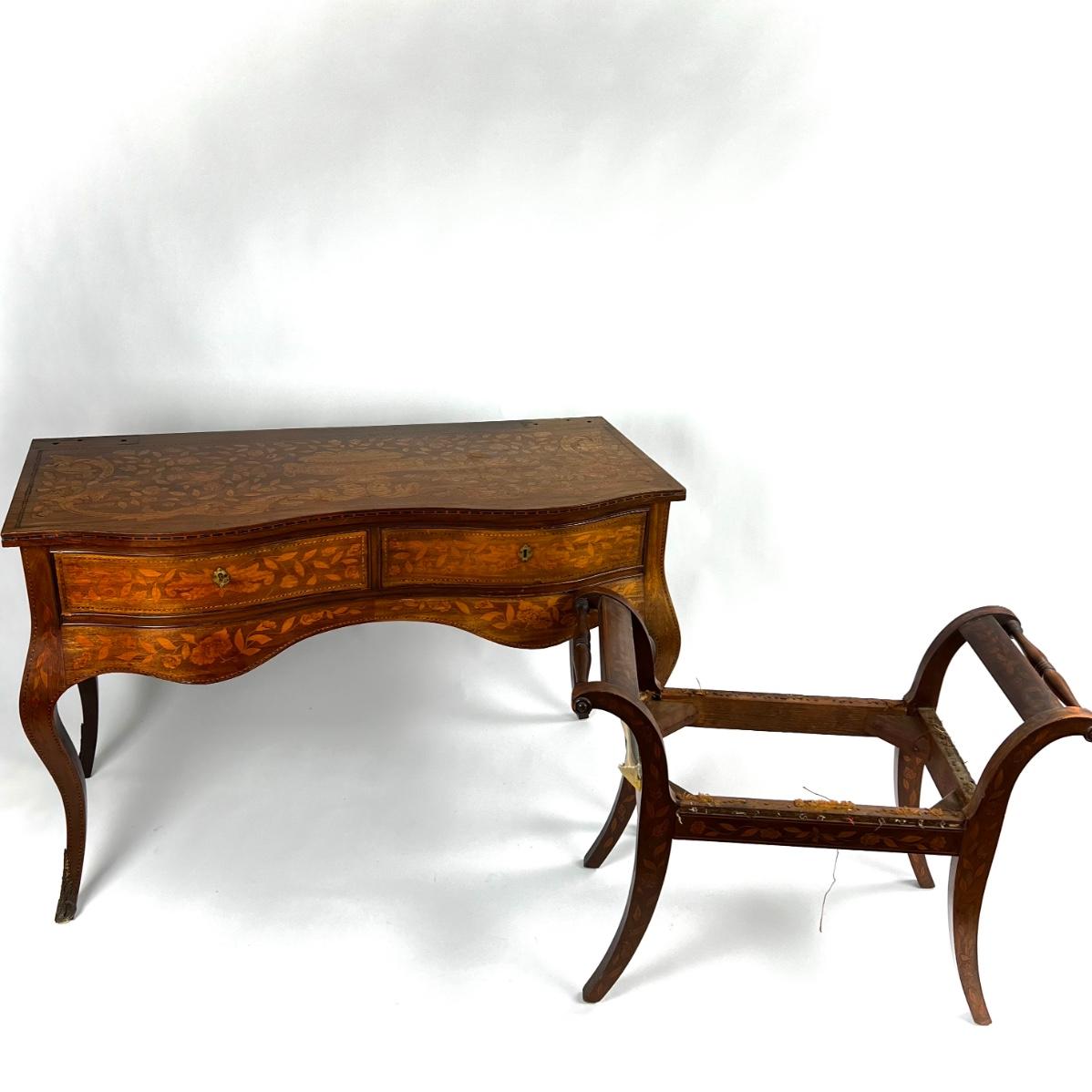1101 Antique Dutch Marquetry Inlaid Vanity Desk & Dutch Marquetry Vanity Bench