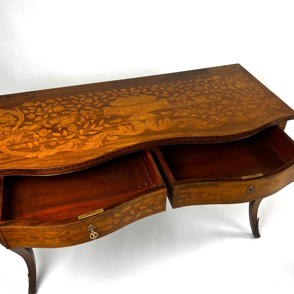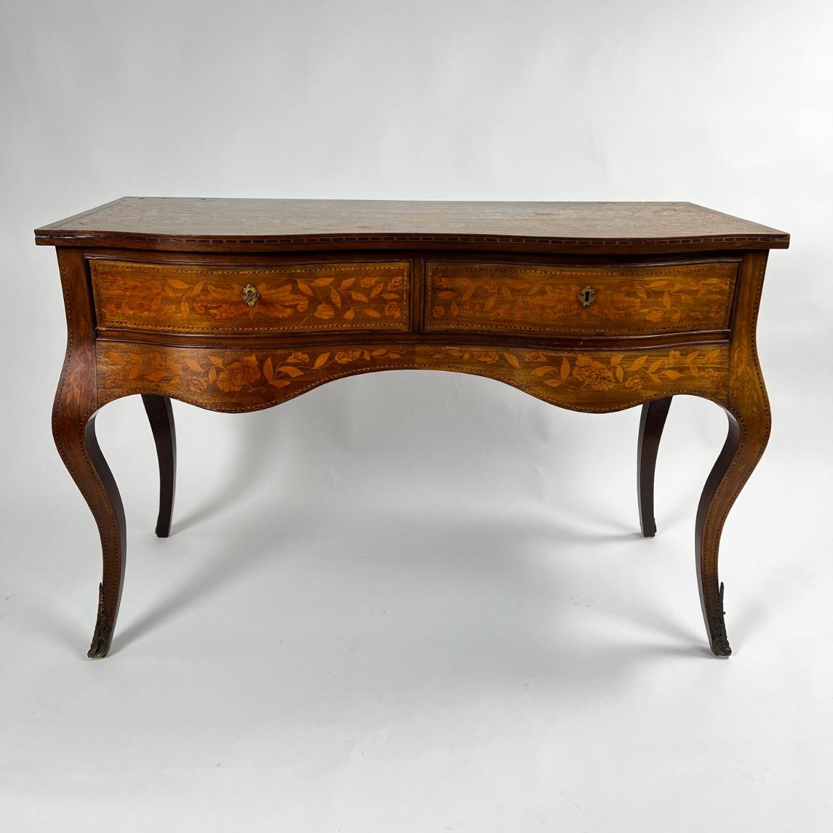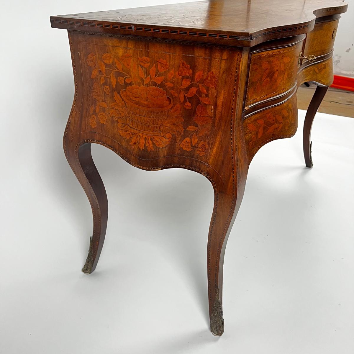 Antique Dutch Marquetry Inlaid Vanity Desk with Cabriole Legs, Ornate Brass Mounts and 2 Drawers. 19 1/2”D x 43 1/2”W x 28 3/4”H