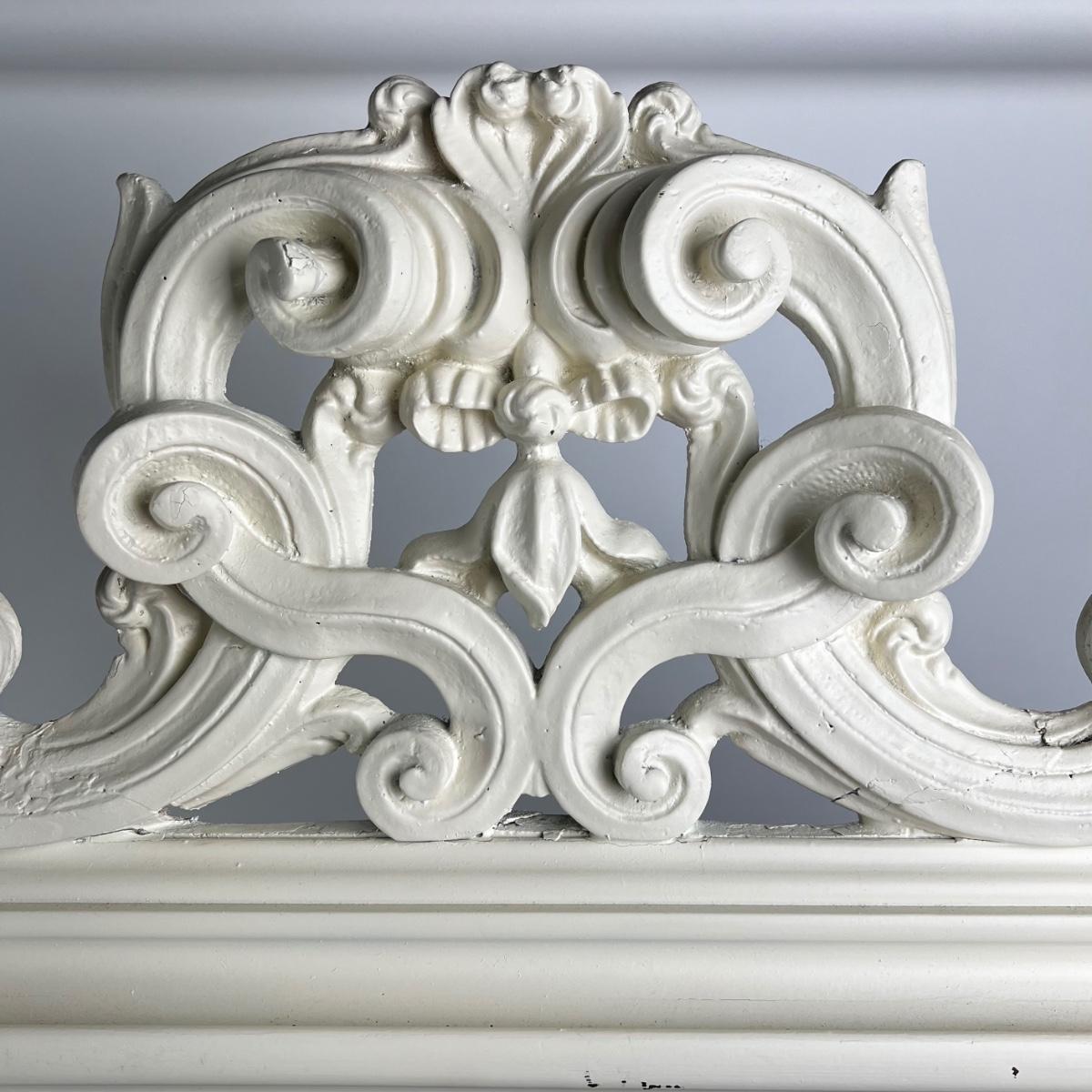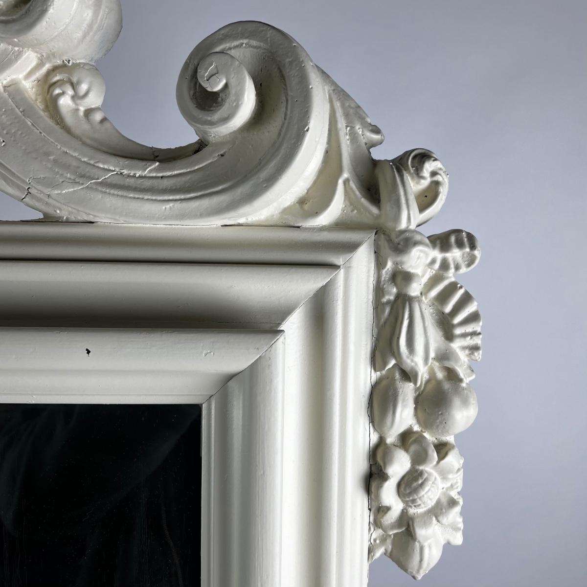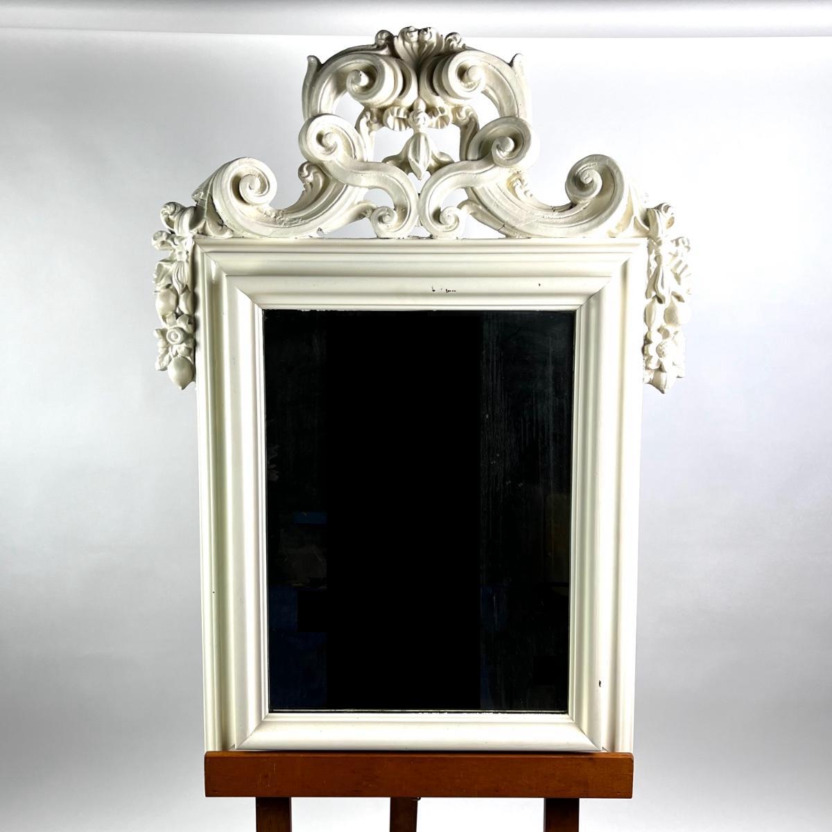 Frame once had artwork in it then repurposed and painted white with a mirror, the ornamental decor is carved EPS foam.