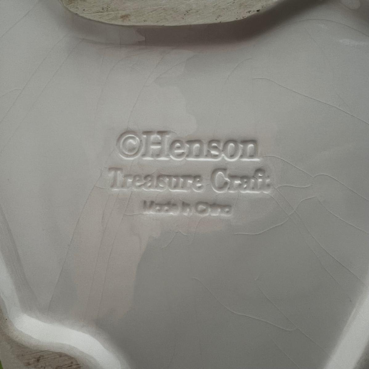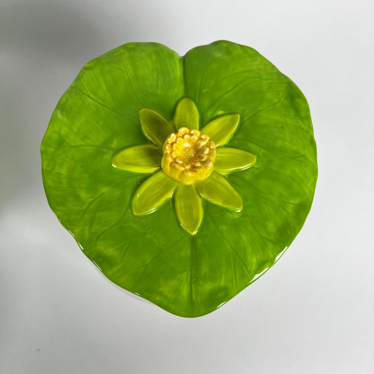 Everyone’s favorite muppet Kermit the Frog. This cookie jar is separated from Kermit with a lily pad lid. It was crafted by Treasure Craft licensed by Jim Henson. Kermit and the lily pad show small signs of crazing.