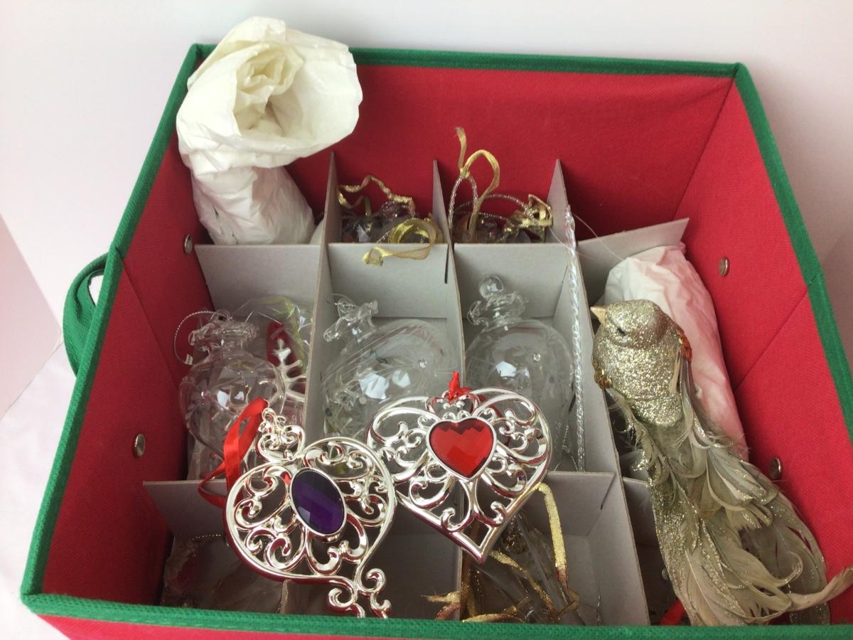 Lot contains a Christmas ornament organizer with assorted clear ornaments and Lenox ornaments.