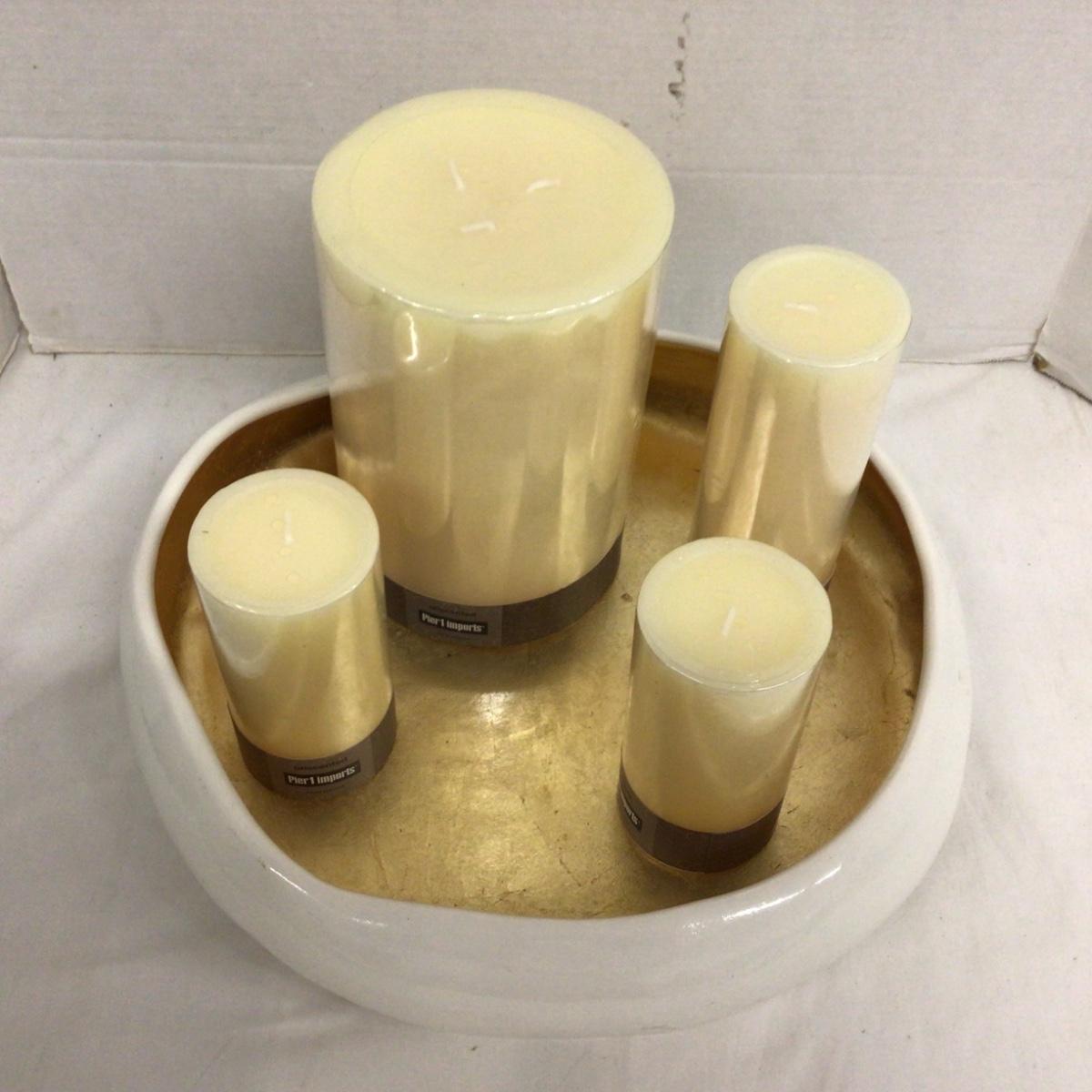 Pier one 4 pc candle set with round white and gold Ethan Allen dish