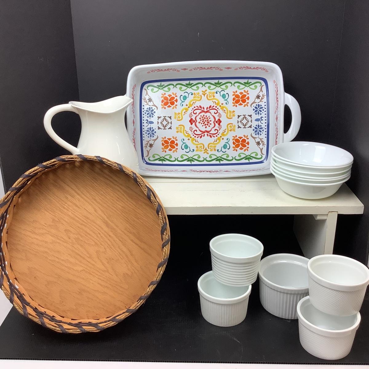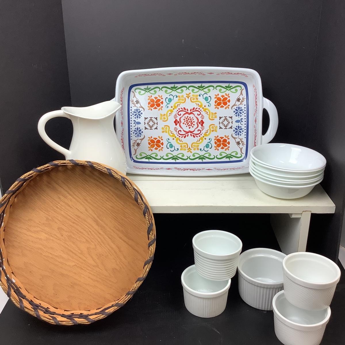 Lot of handmade woven la-z-susan signed by artist Mahlon S. Gingerich with Nordic ware ceramic baking dishe , White pottery pitcher and Corelle bowls