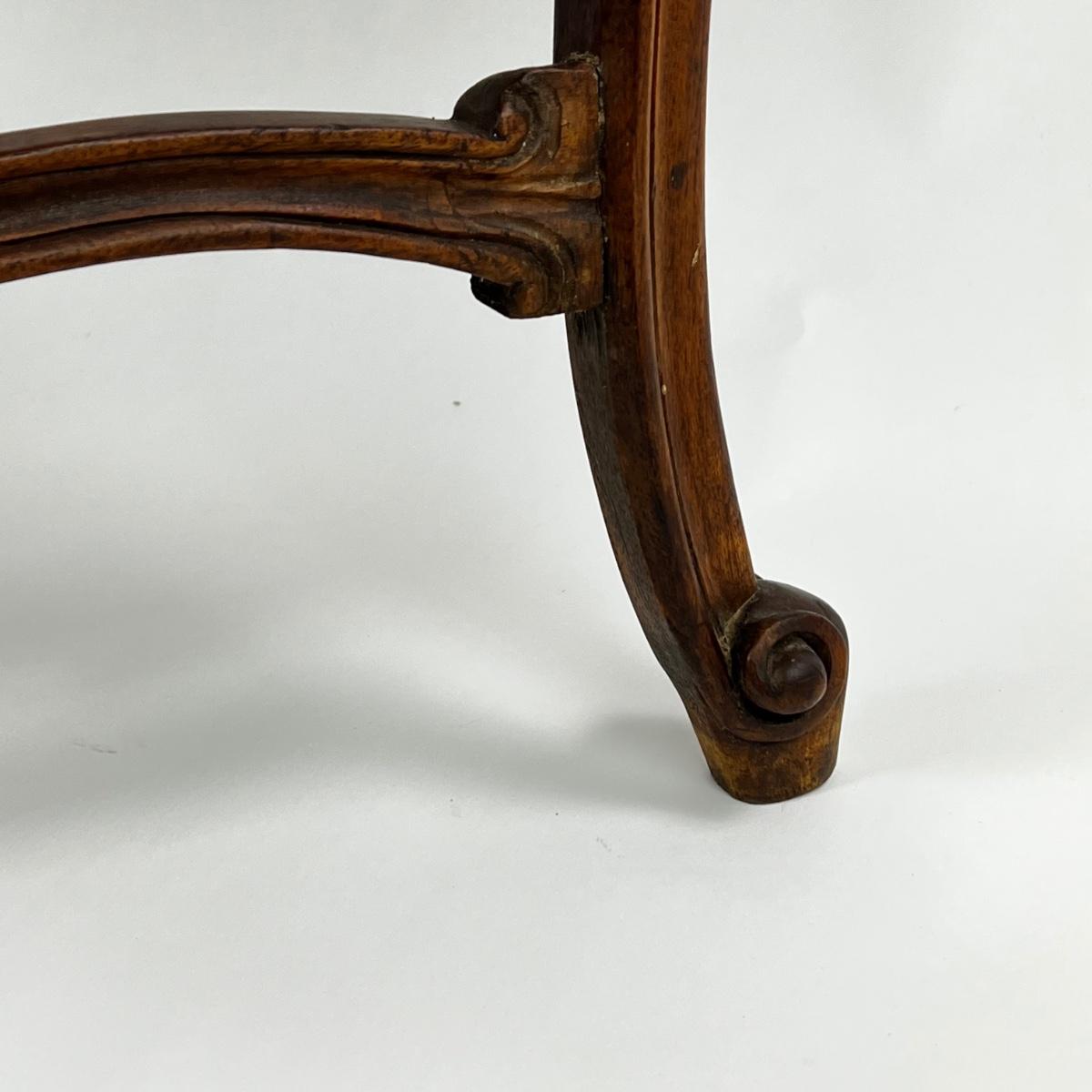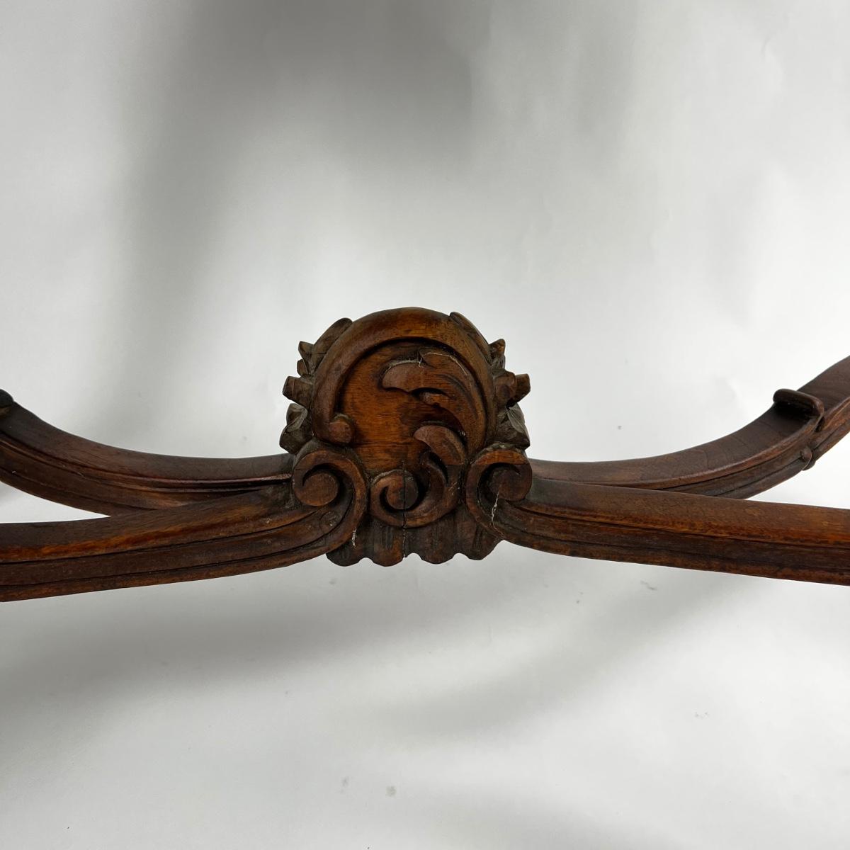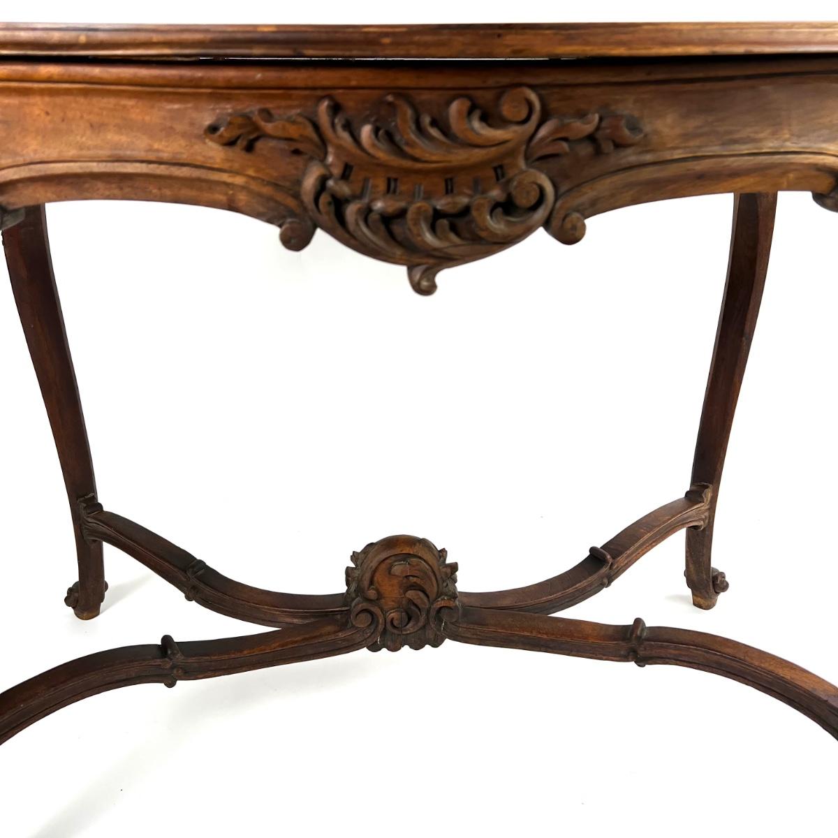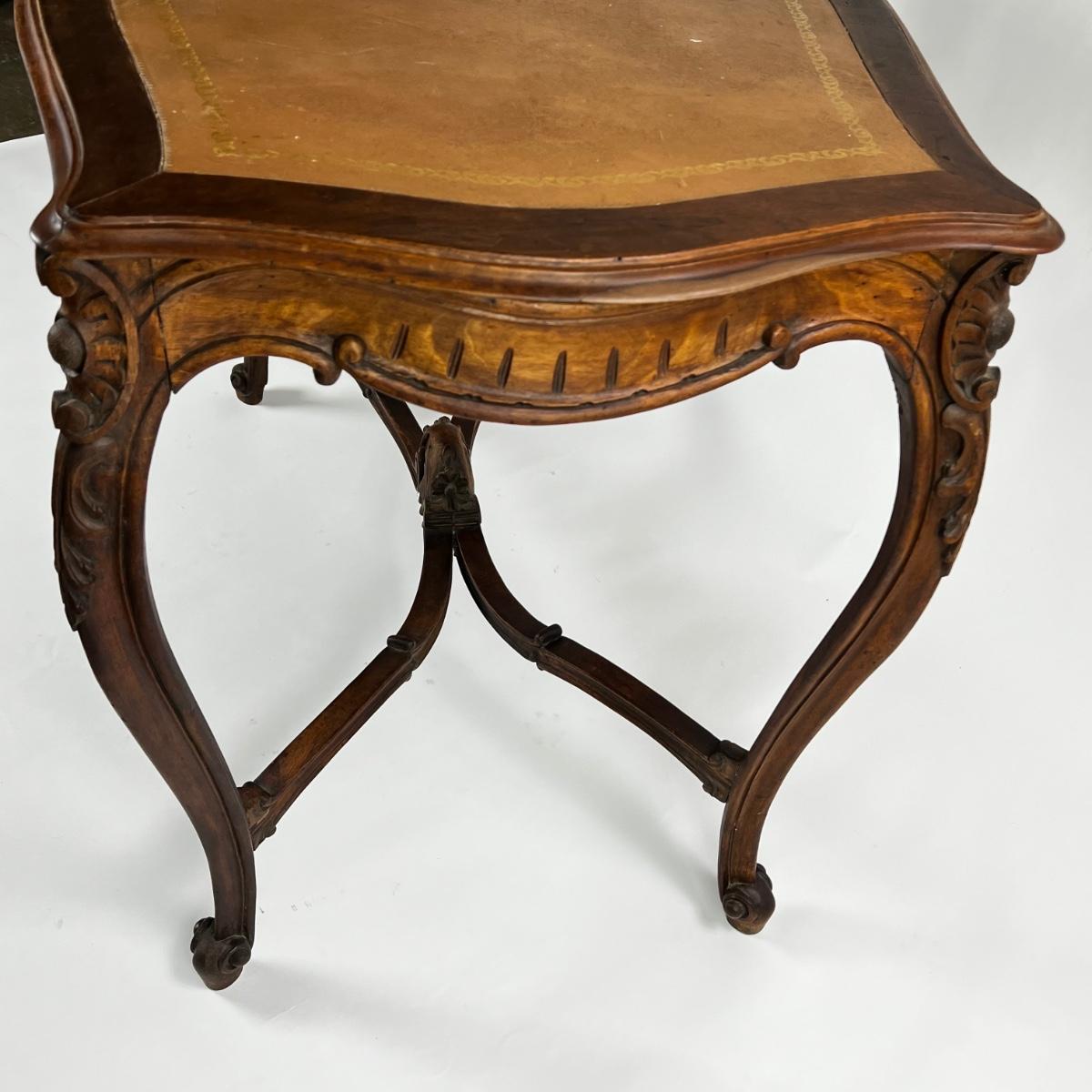 Antique French Louis XV Style Carved Walnut Table with leather top, cabriole legs and with foliate motif, beautiful carved stretcher with intersecting wave motif details, and whorl feet.