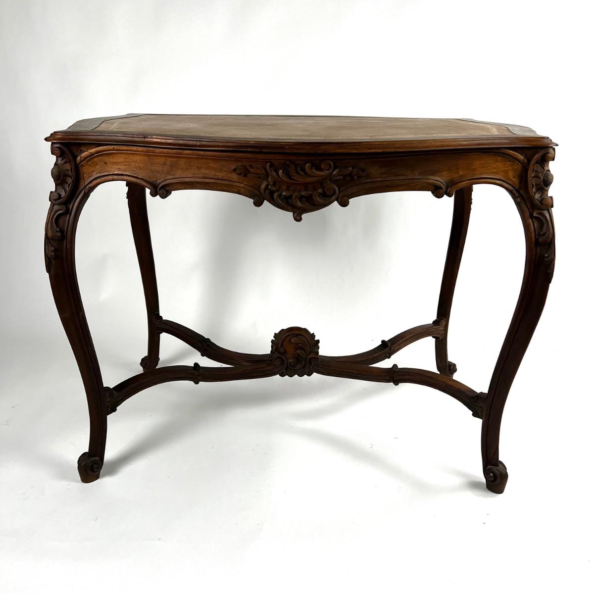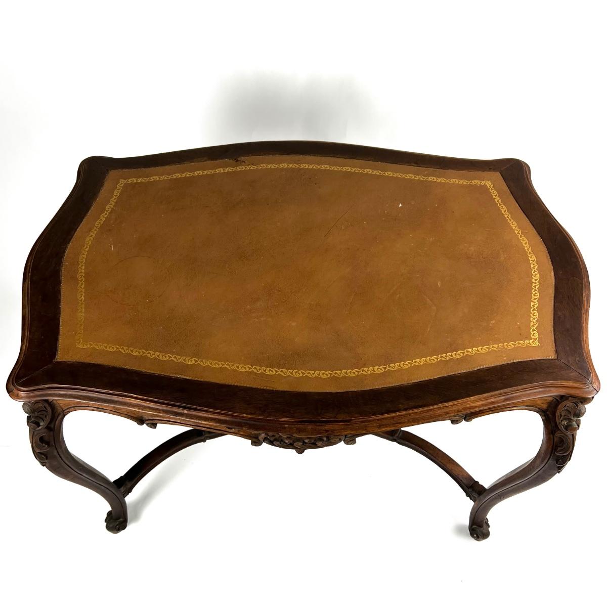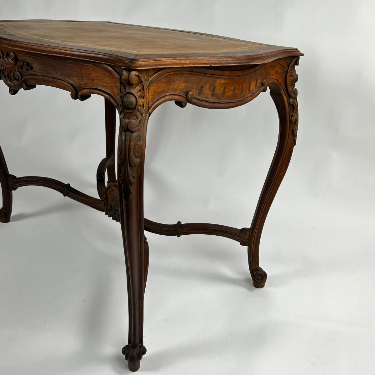 1107 Antique French Louis XV Style Carved Walnut Table with Leather Top