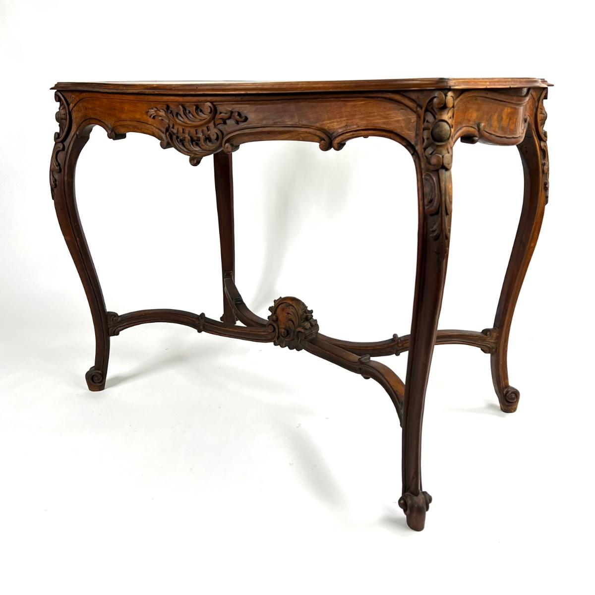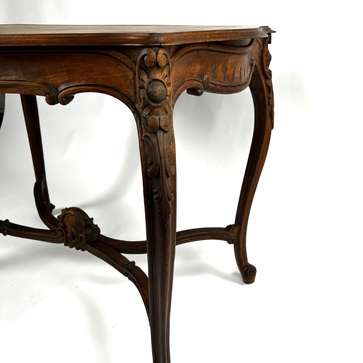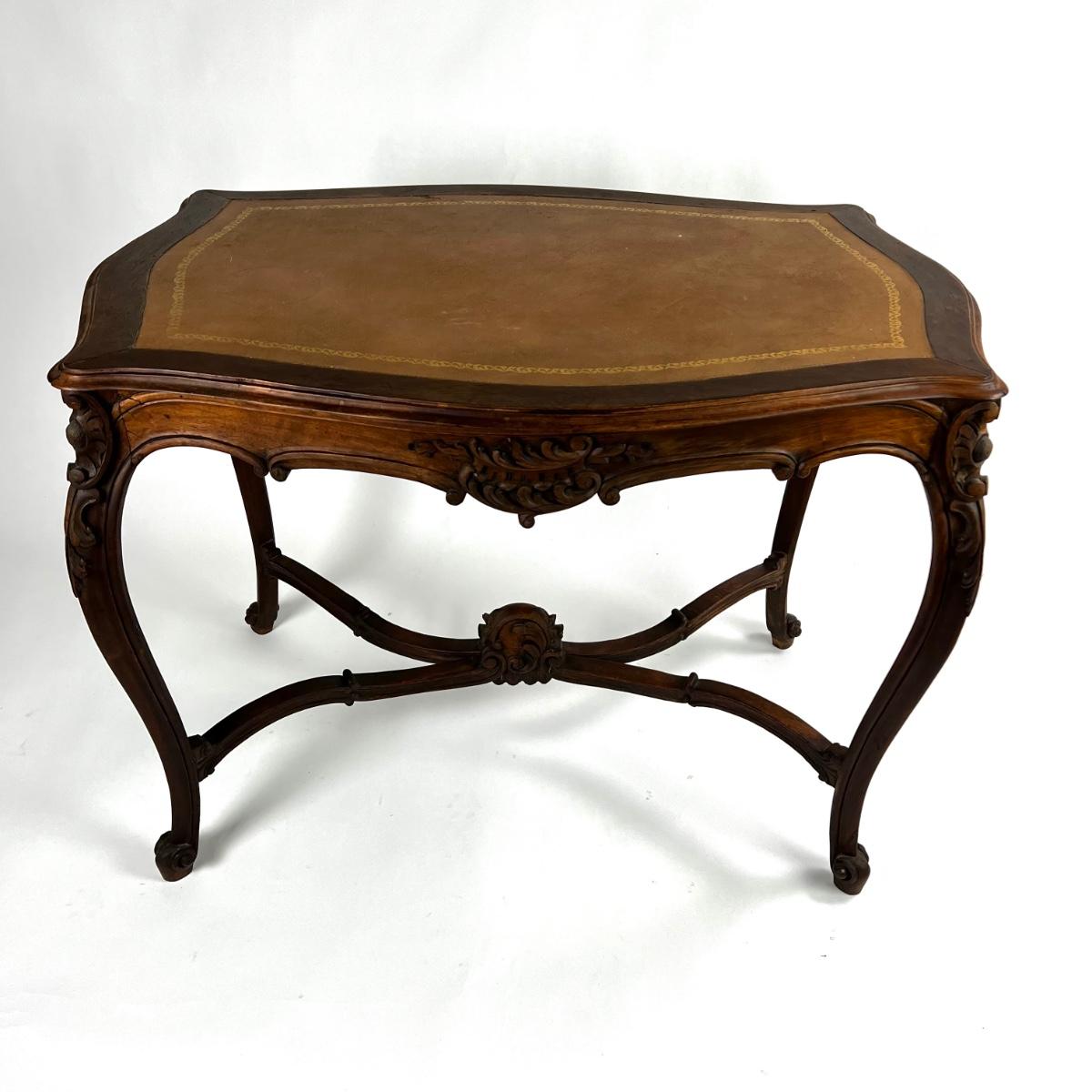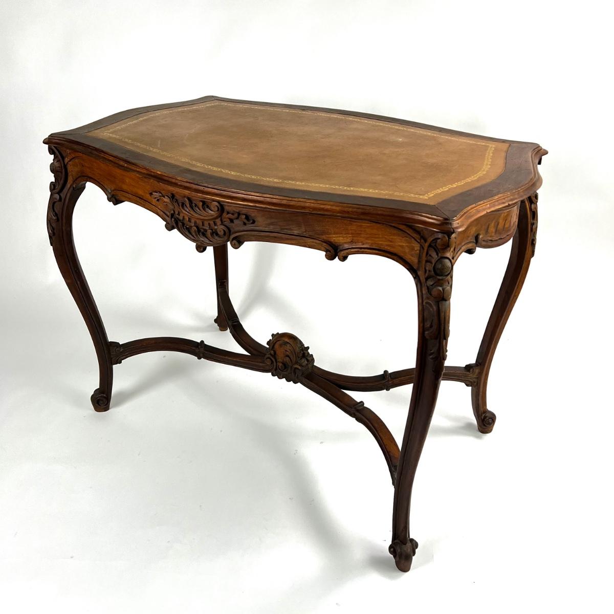 1107 Antique French Louis XV Style Carved Walnut Table with Leather Top
