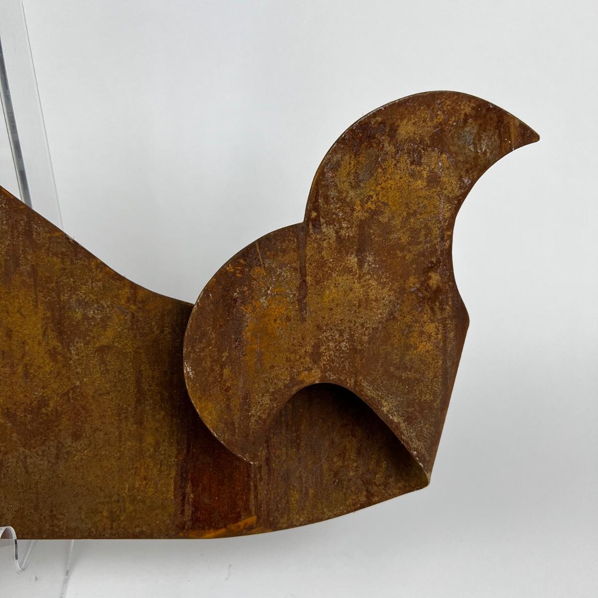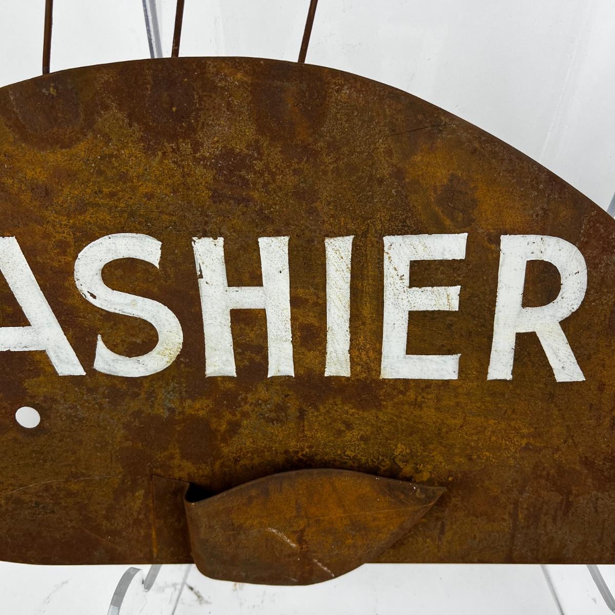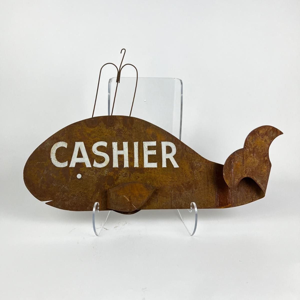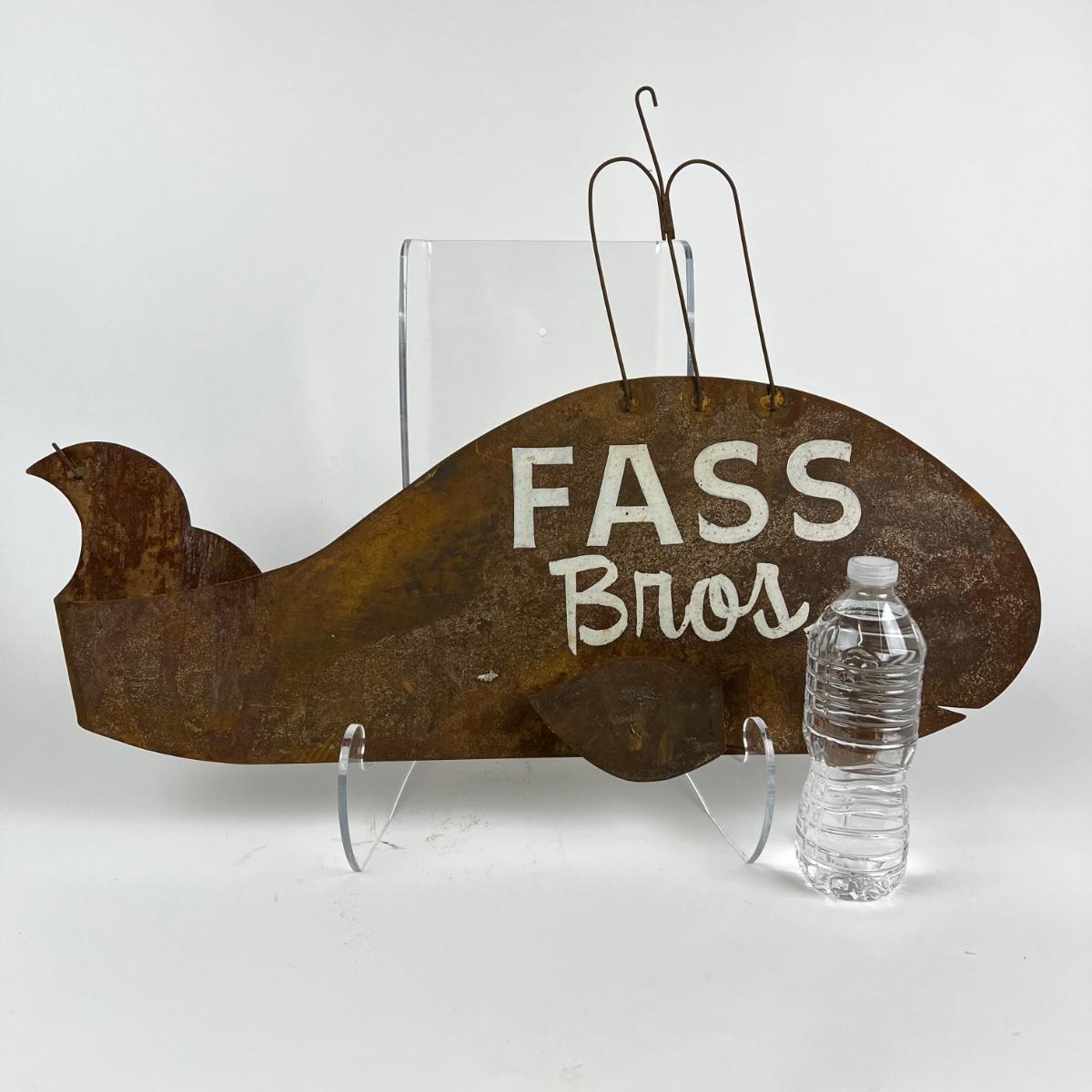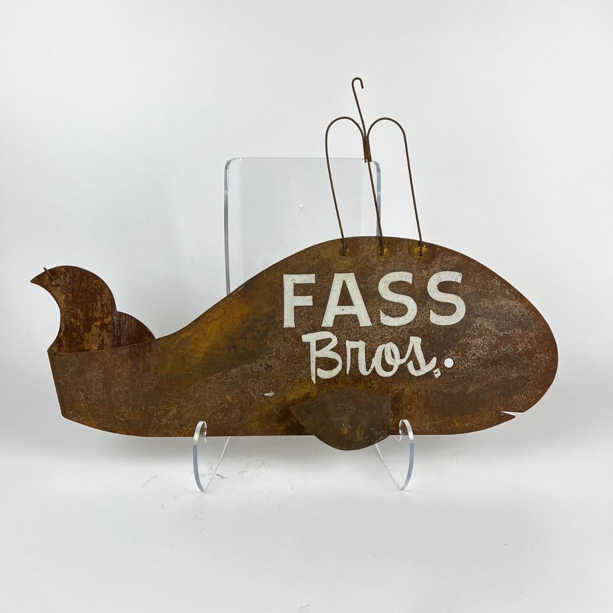 Vintage whale cashier sign made of metal from Fass Bros Fish House. Metal has rust and weathering.