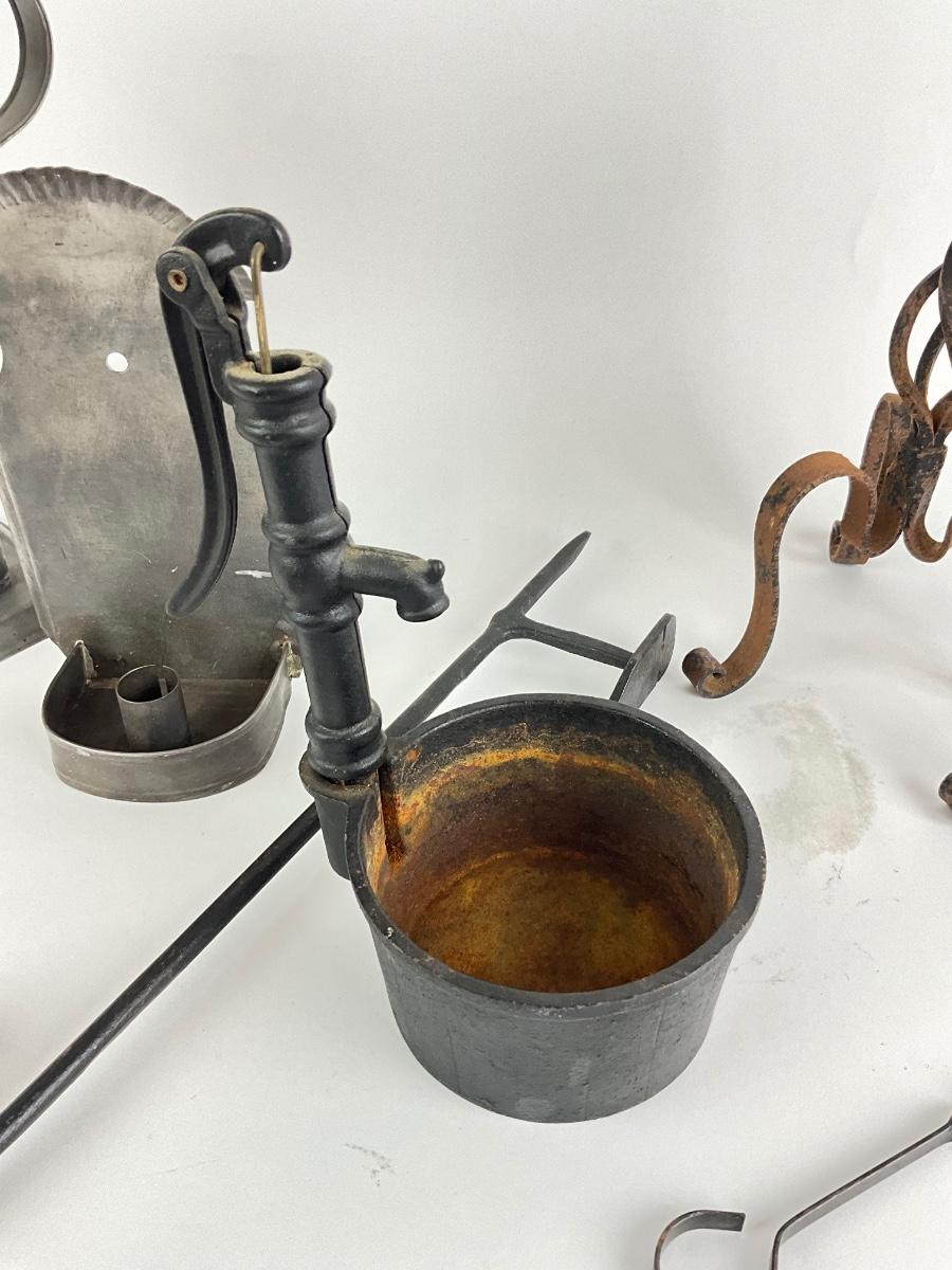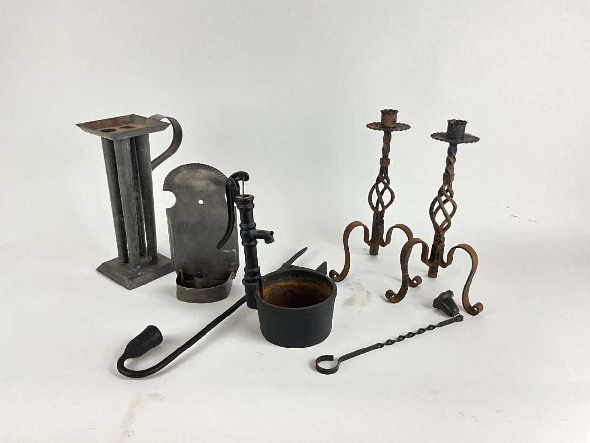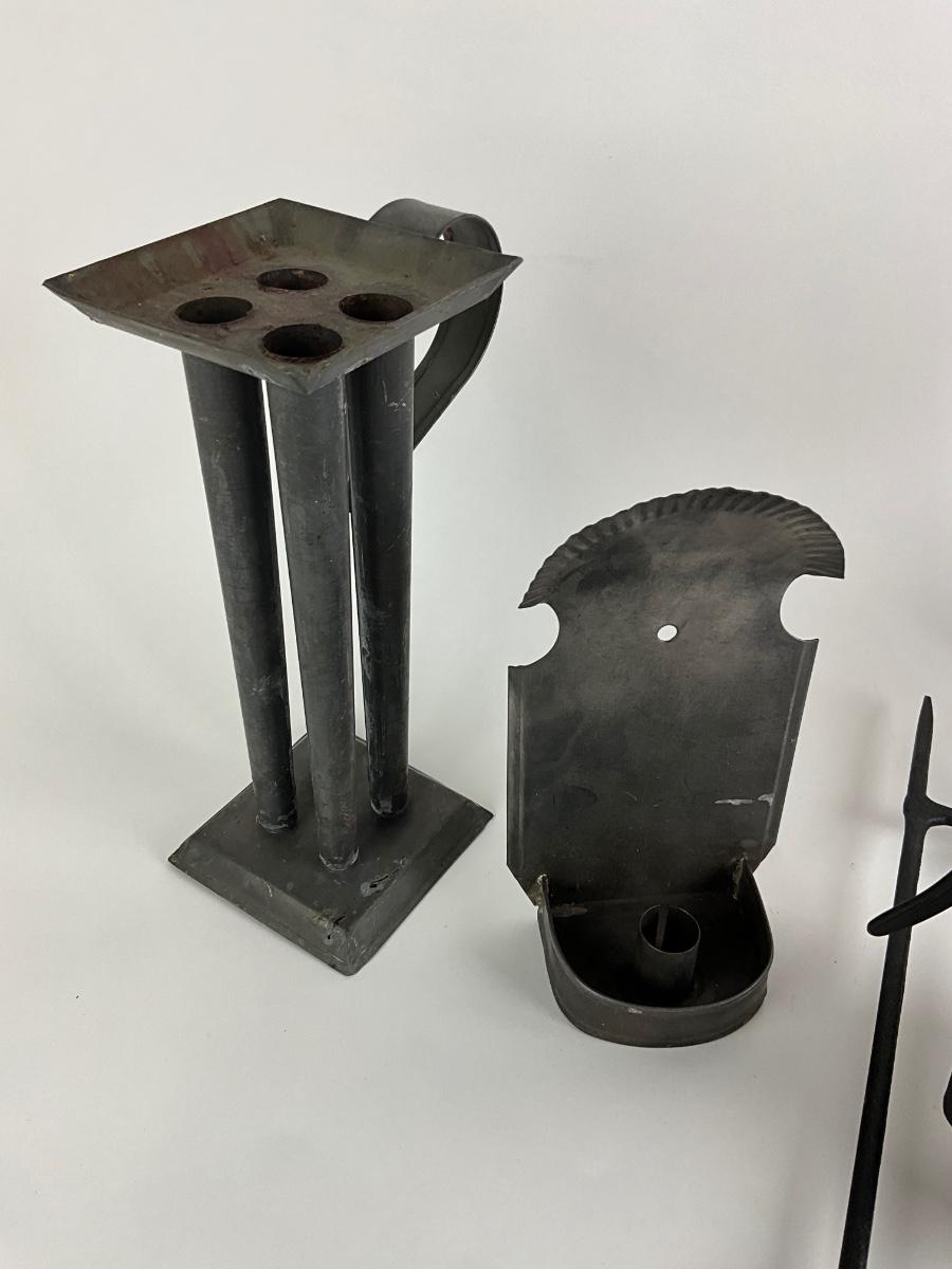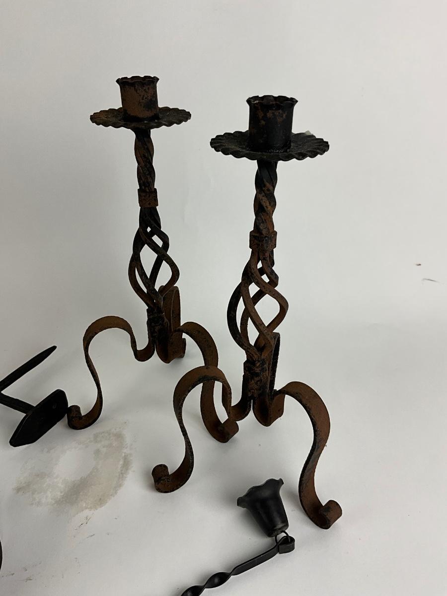 4 candle mold is metal, and measures 11" high , wrought iron candle wall piece is 17" high, iron well is 9.5" high , candlesticks are wrought iron and measures 12"
