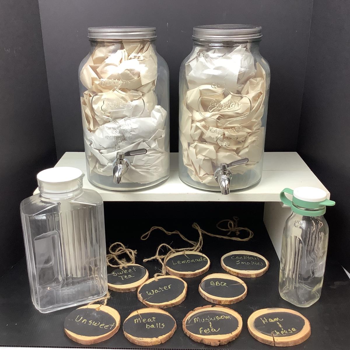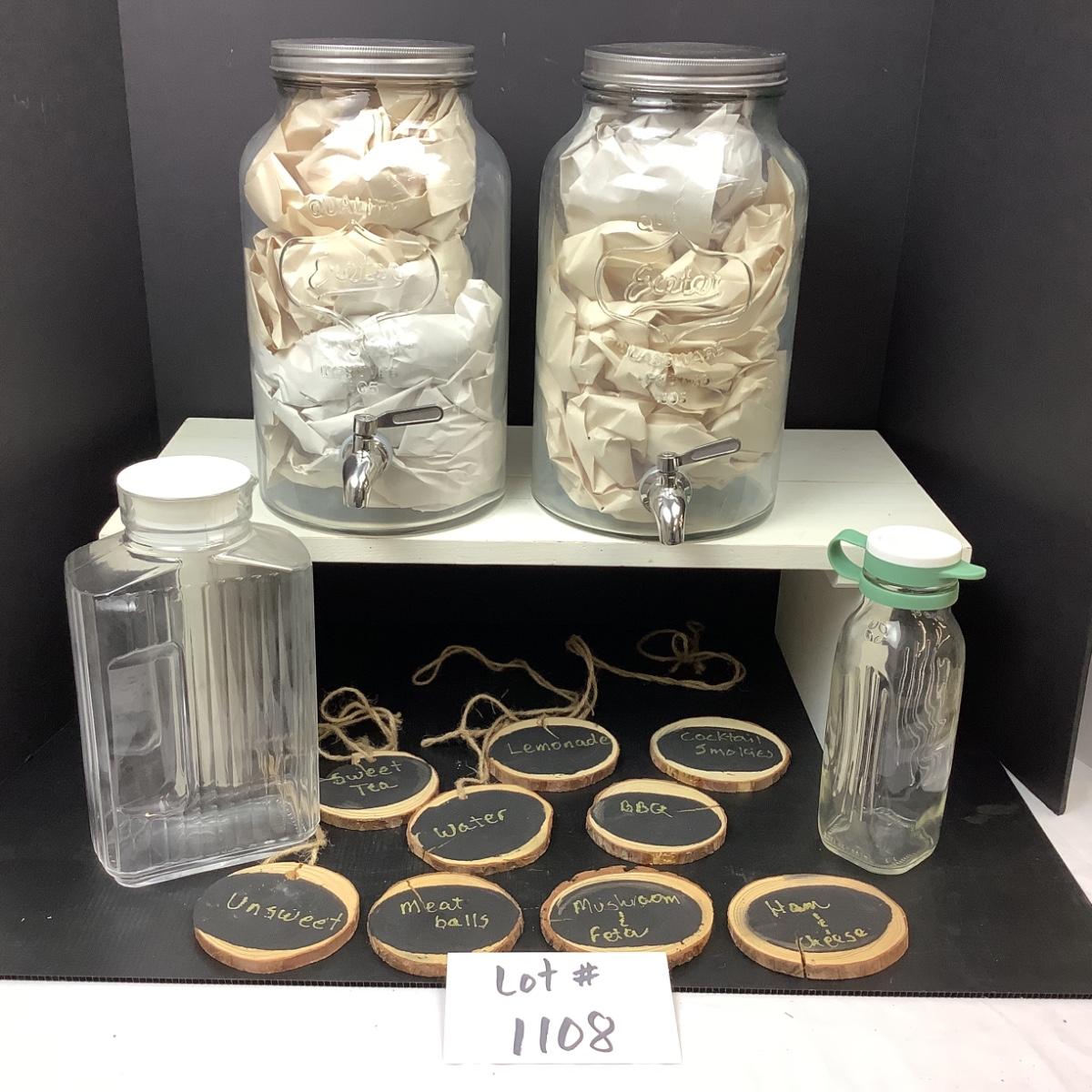 Two - 2 gal dispensers, with 2- liter glass pitcher with lid and 9 wooden tree bark Chalk markers