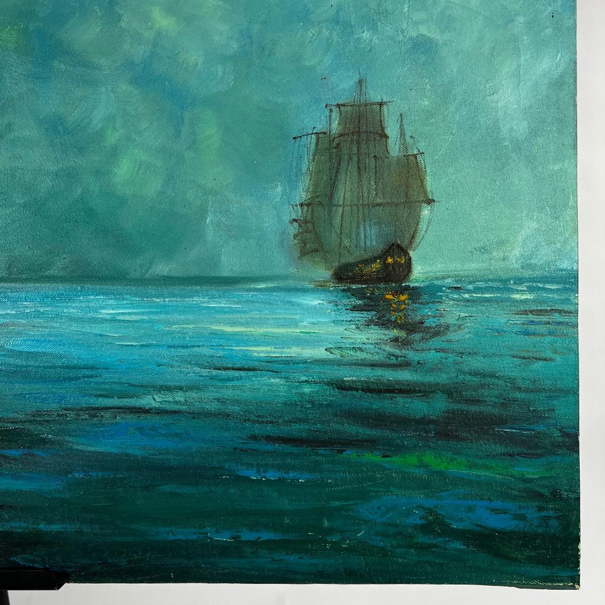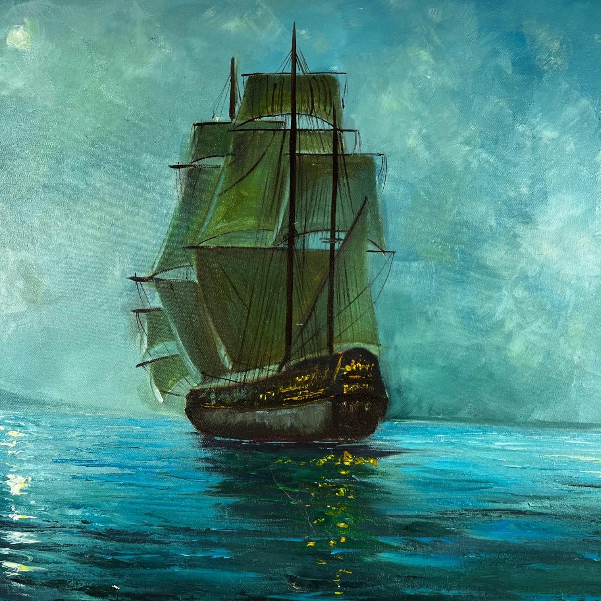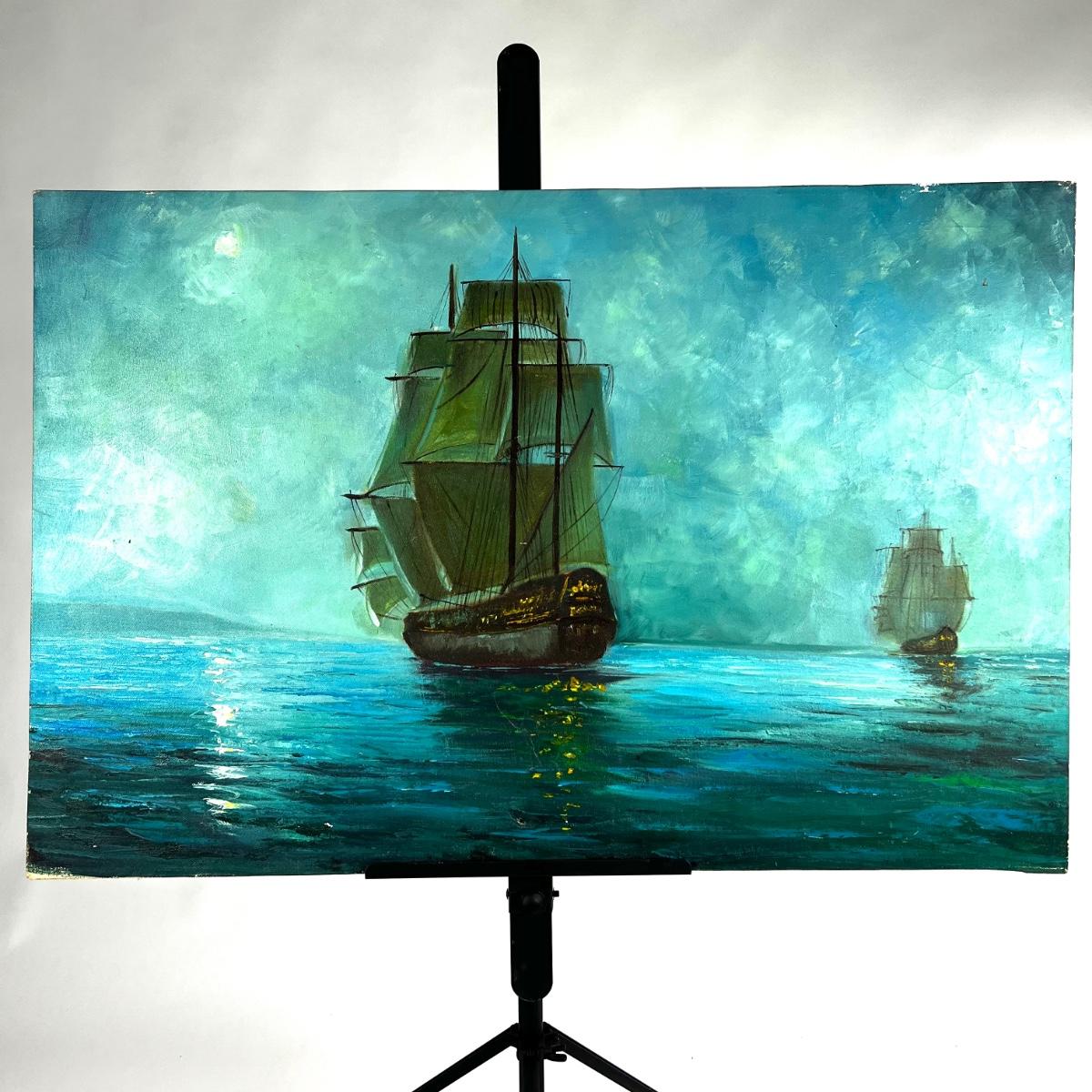 Vintage Original Oil Painting of two Clipper ships sailing the night seas.