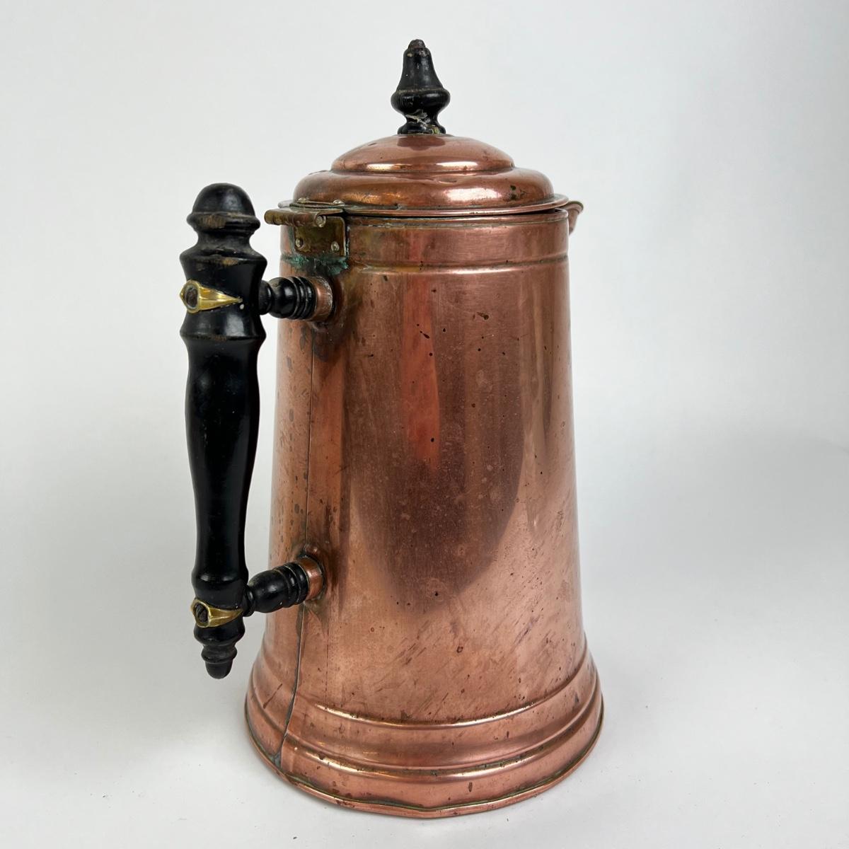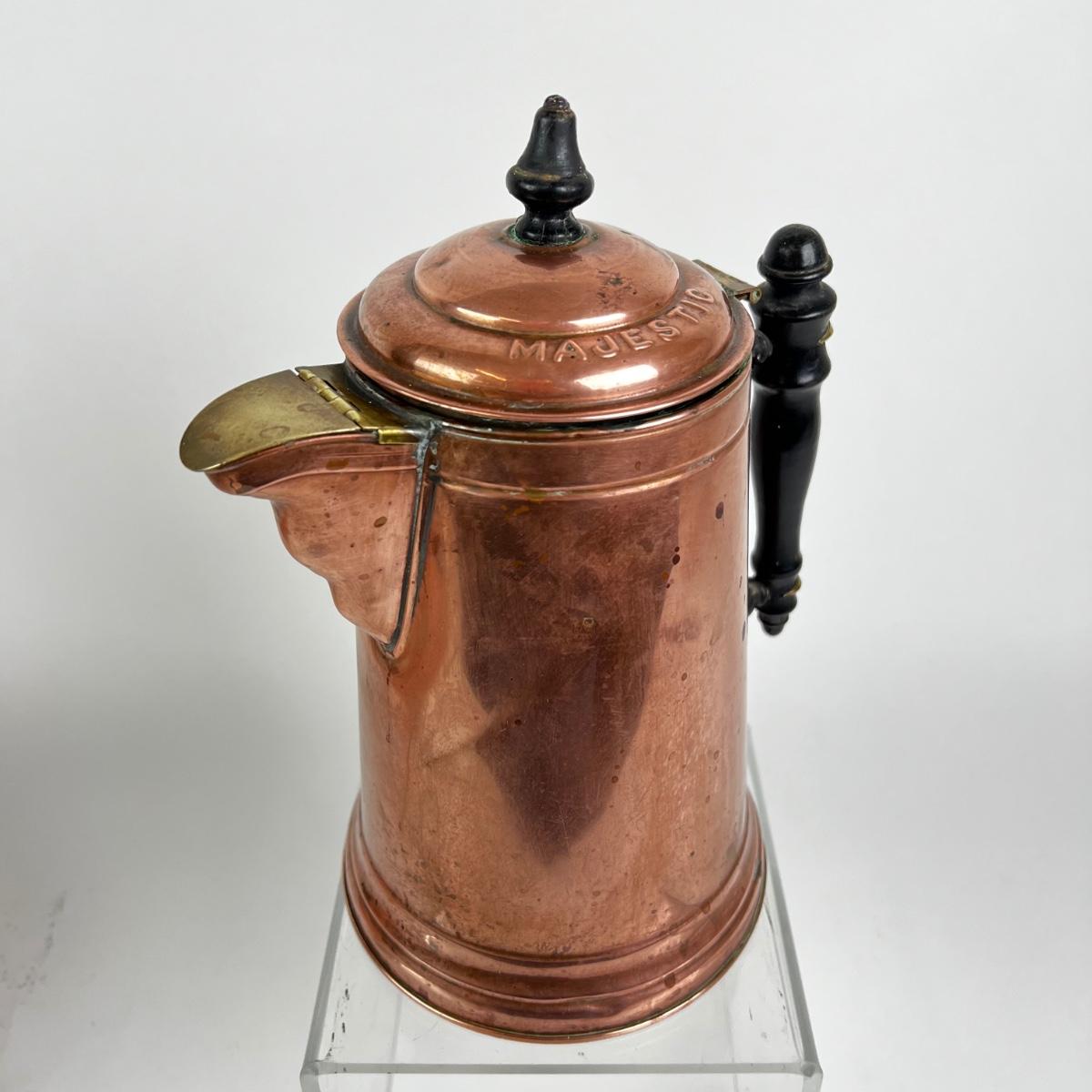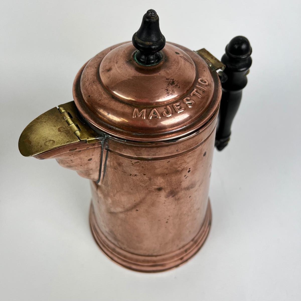 Copper coffee server by Majestic has brass hardware on the carved wood handle.