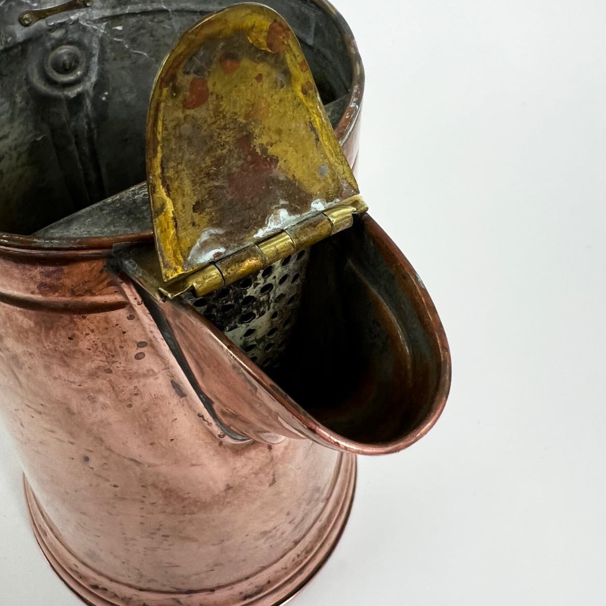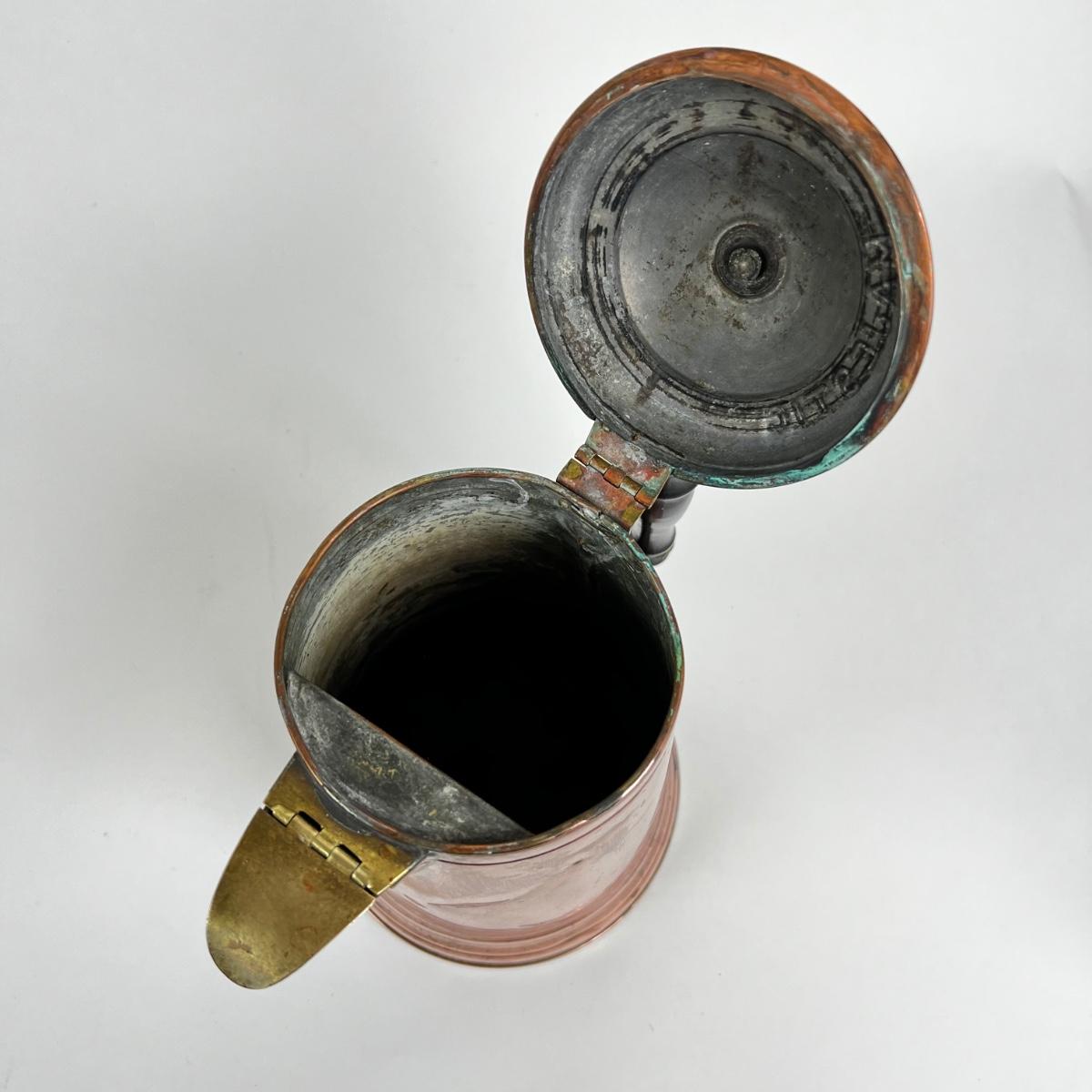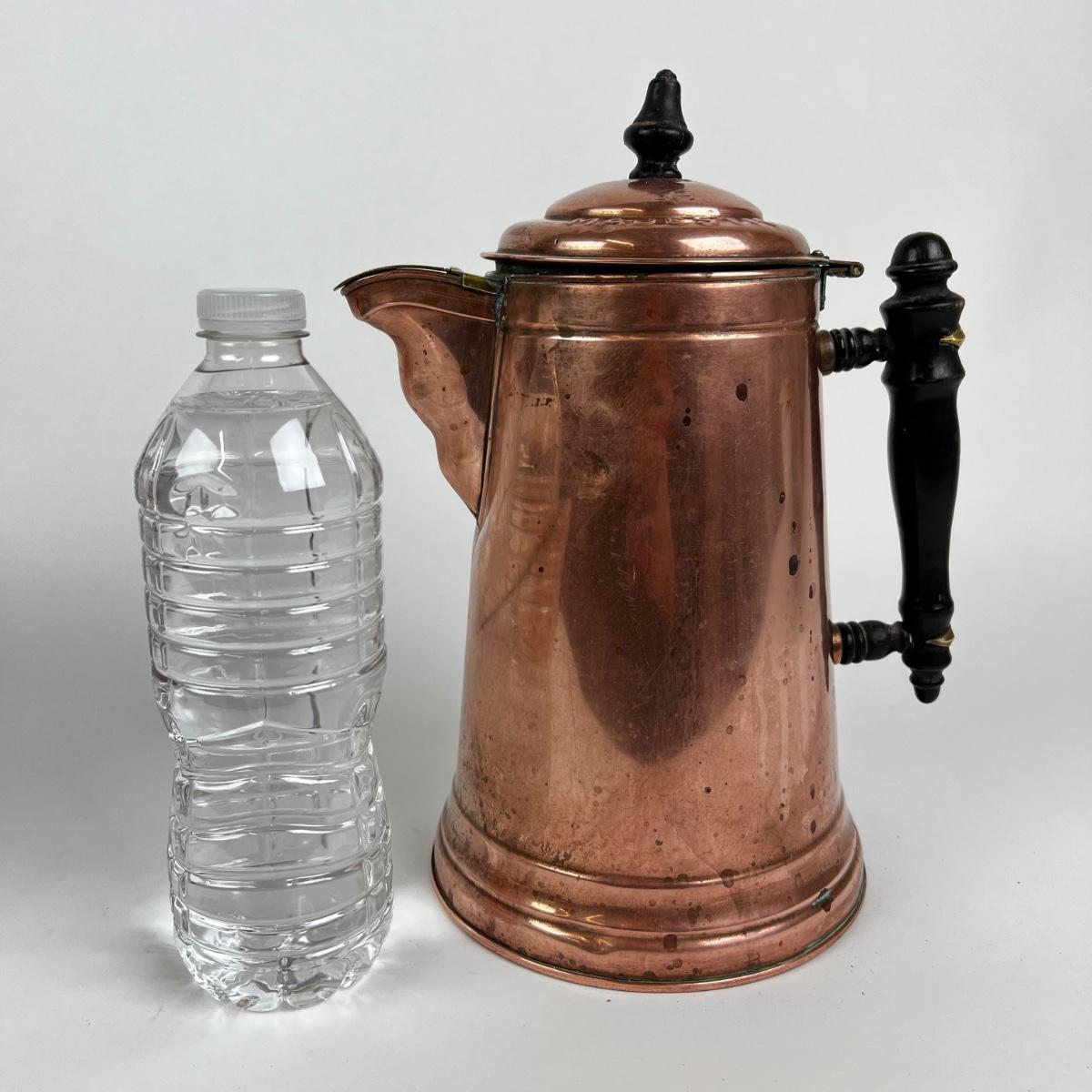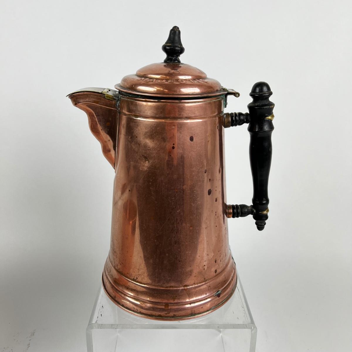 Copper coffee server by Majestic has brass hardware on the carved wood handle.