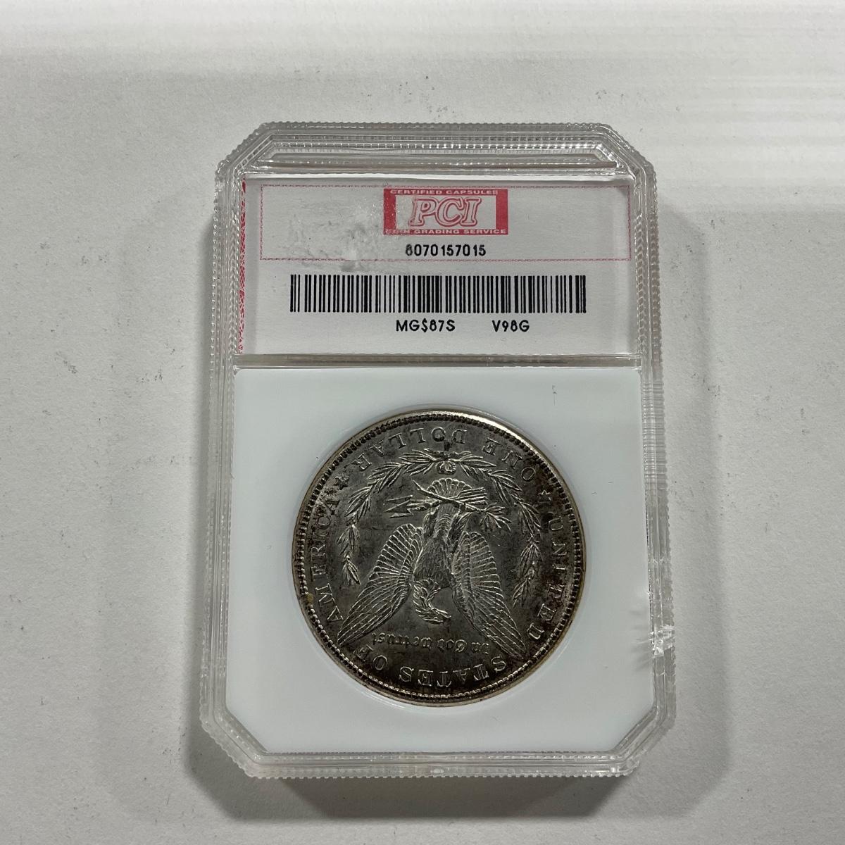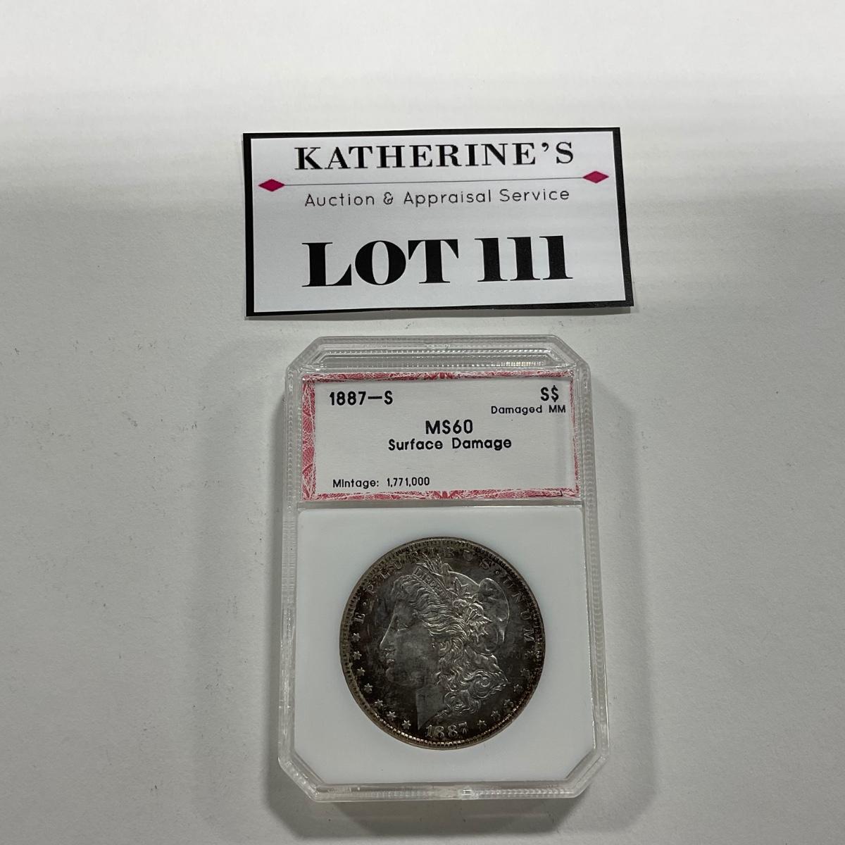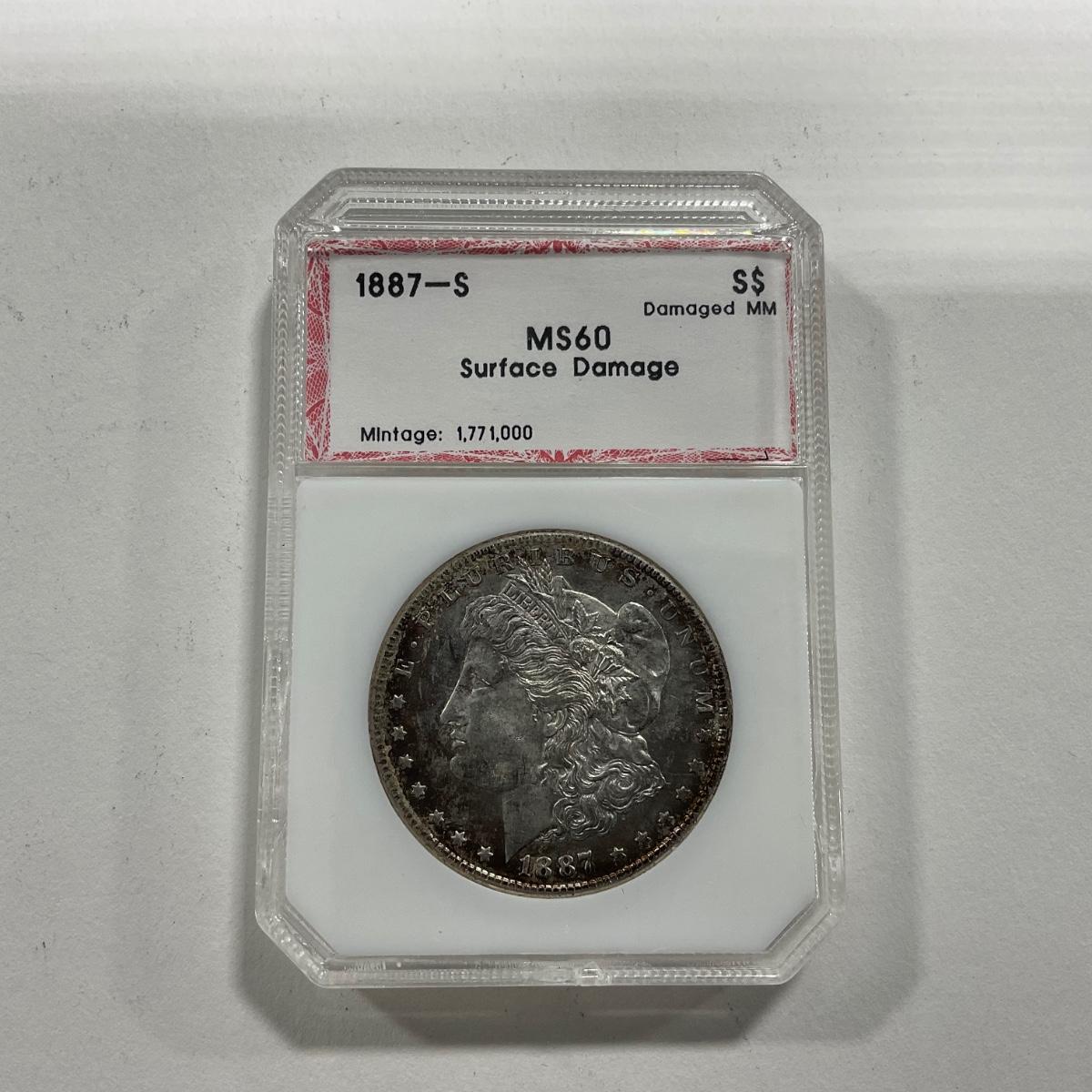 One graded 1887-S Morgan MS60 Surface Damage coin. Please see photos for details and condition. ::: Shipping is available on this lot. If you require shipping you must let us know at the close of the auction. We will coordinate with you after the item has been won. Shipping fees will include insurance up to or exceeding the value of all items being mailed. If you have any questions regarding this lot please contact the auctioneer either via this website, by direct email or by phone. PICK UP TIMES and other important information can be found in the TERMS and DESCRIPTION of the auction. Please take a look for pertinent information. Thanks!