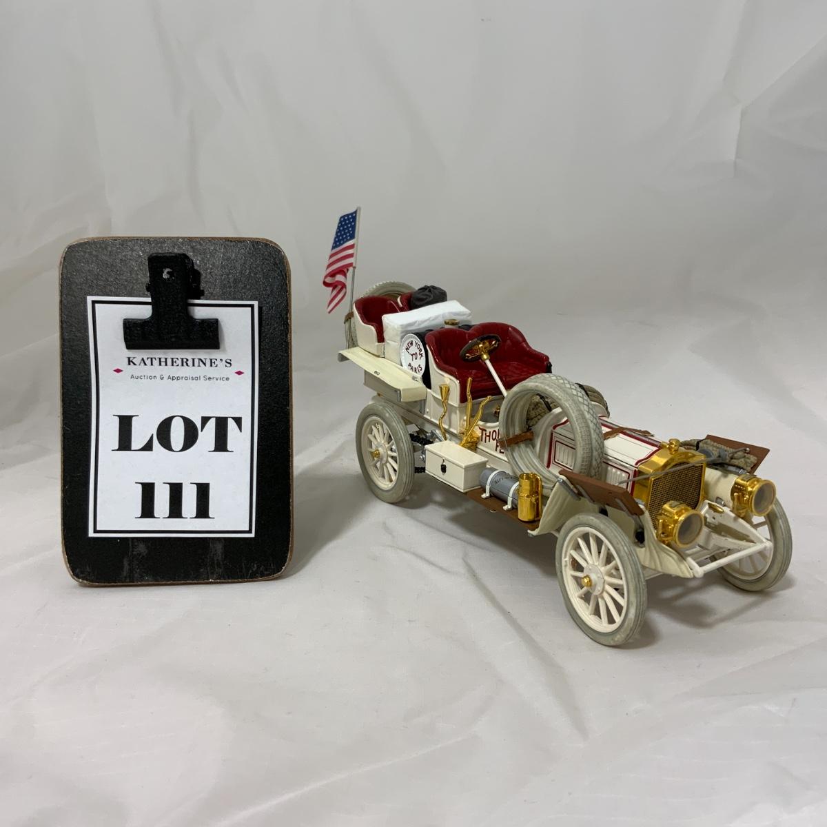 From the Estate of Peter Radovanovich: Franklin Mint Die-Cast 1907 Thomas Flyer. I’m not certain where the flag goes, I couldn’t find a spot for it, but it looks pretty great where I placed it. Car appears to be complete and looks excellent! Car does not come with original box. Please see photos for details and condition. ::: Shipping is available on this lot. If you require shipping you must let us know at the close of the auction. We will coordinate with you after the item has been won. Shipping fees will include insurance up to or exceeding the value of all items being mailed. If you have any questions regarding this lot please contact the auctioneer either via this website, by direct email or by phone. PICK UP TIMES and other important information can be found in the TERMS and DESCRIPTION of the auction. Please take a look for pertinent information. Thanks!