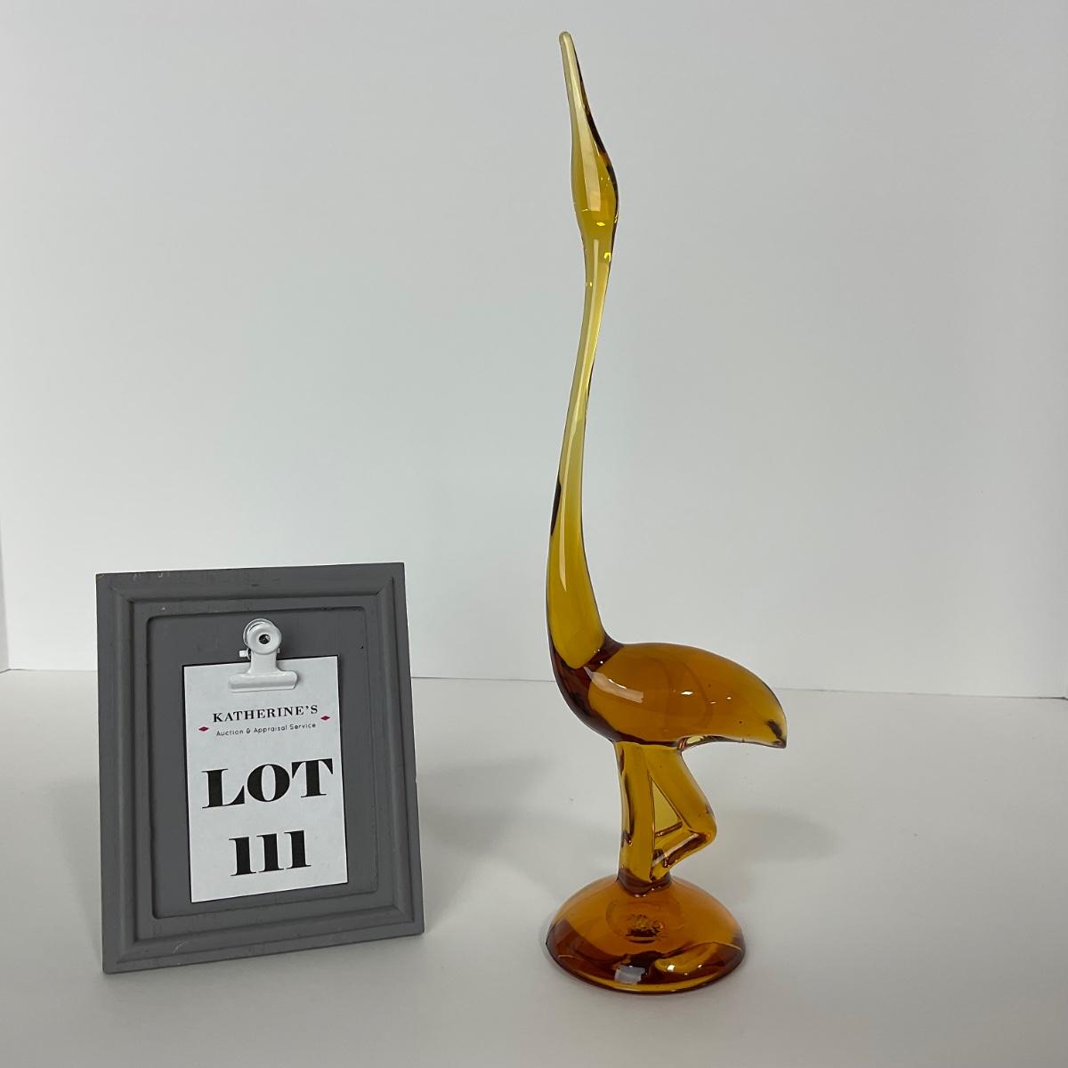 One Viking glass long neck crane figure This piece has no damage, and appears to be in great shape with no visable chips, cracks, or broken pieces. 3 1/2 inches wide by 11 1/2 inches tall. Please see photos for details and condition. Any condition statement is given as a courtesy to a client, is an opinion, and should not be treated as a statement of fact. Reference to condition written, oral or within a condition report shall not be regarded as a full account of condition and may not include all defects, alterations, or restorations. Absence of a condition report does not imply a lot is flawless or lacking imperfections or damage. Katherine’s Auction & Appraisal Service shall have no responsibility for any error or omission. Returns shall not be accepted on the basis of condition. ::: Shipping is available on this lot. If you require shipping you must let us know at the close of the auction. We will coordinate with you after the item has been won. Shipping fees will include insurance up to or exceeding the value of all items being mailed. If you have any questions regarding this lot please contact the auctioneer either via this website, by direct email or by phone. PICK UP TIMES and other important information can be found in the TERMS and DESCRIPTION of the auction. Please take a look for pertinent information. Thanks!
