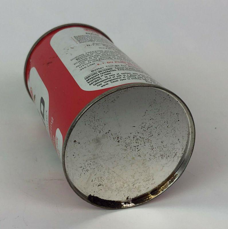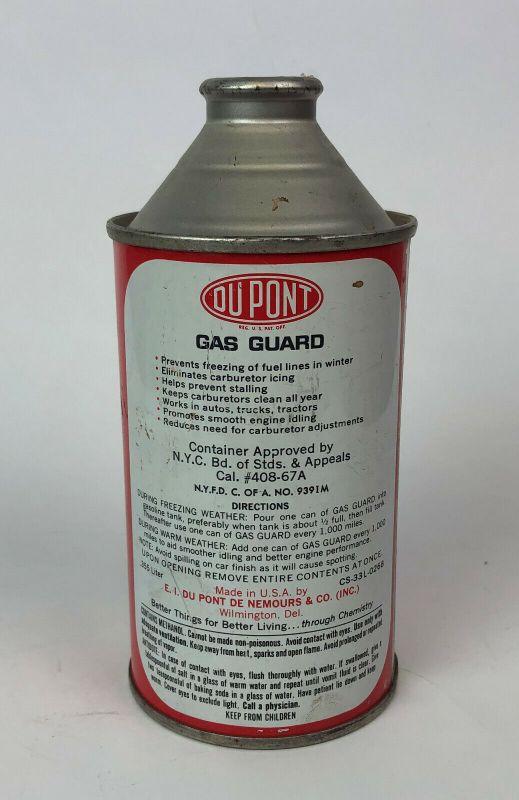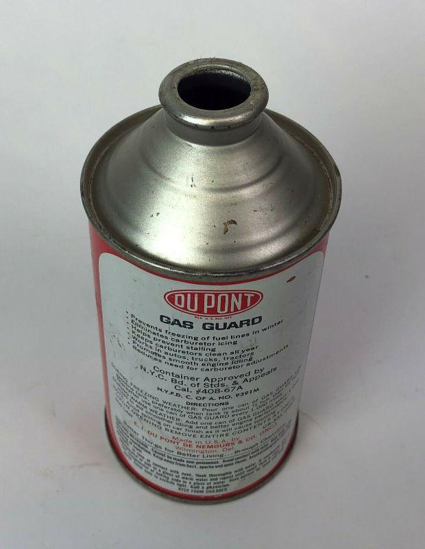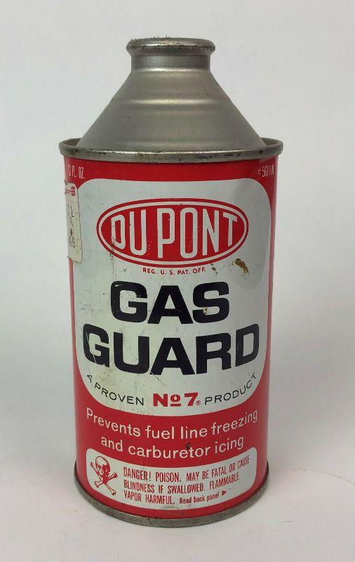 Here is a vintage 5 1/2" tall cone-top advertising tin of DUPONT GAS GUARD fuel treatment...'A Proven No. 7 Product'...Good condition on the graphics on this garage find...No cap...Pre zip code...Offered with no reserve...