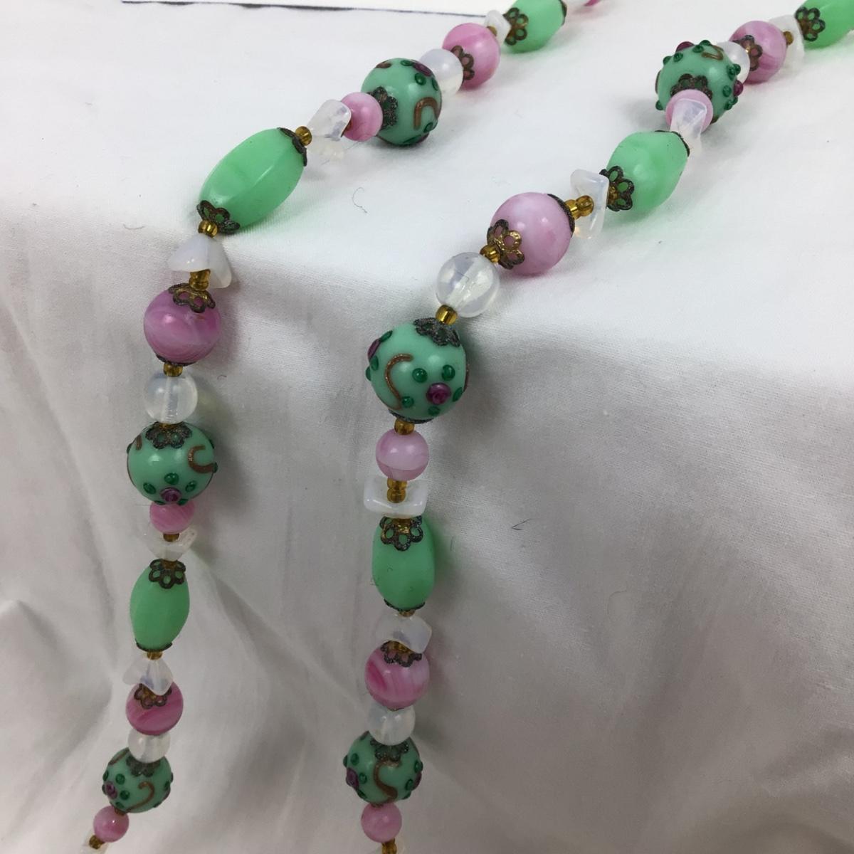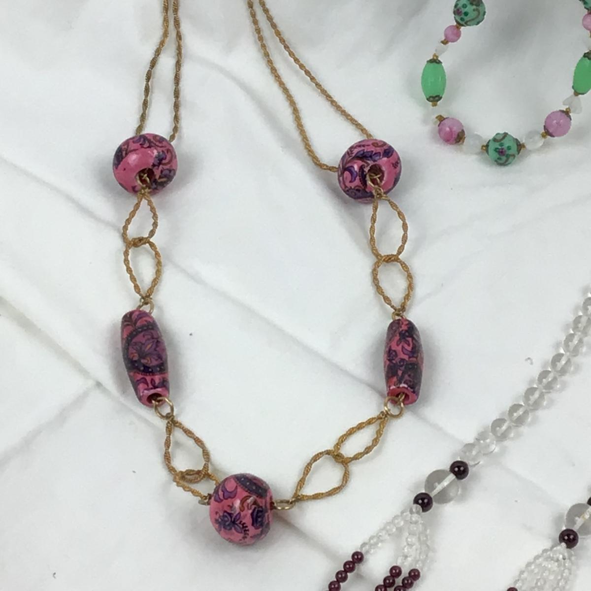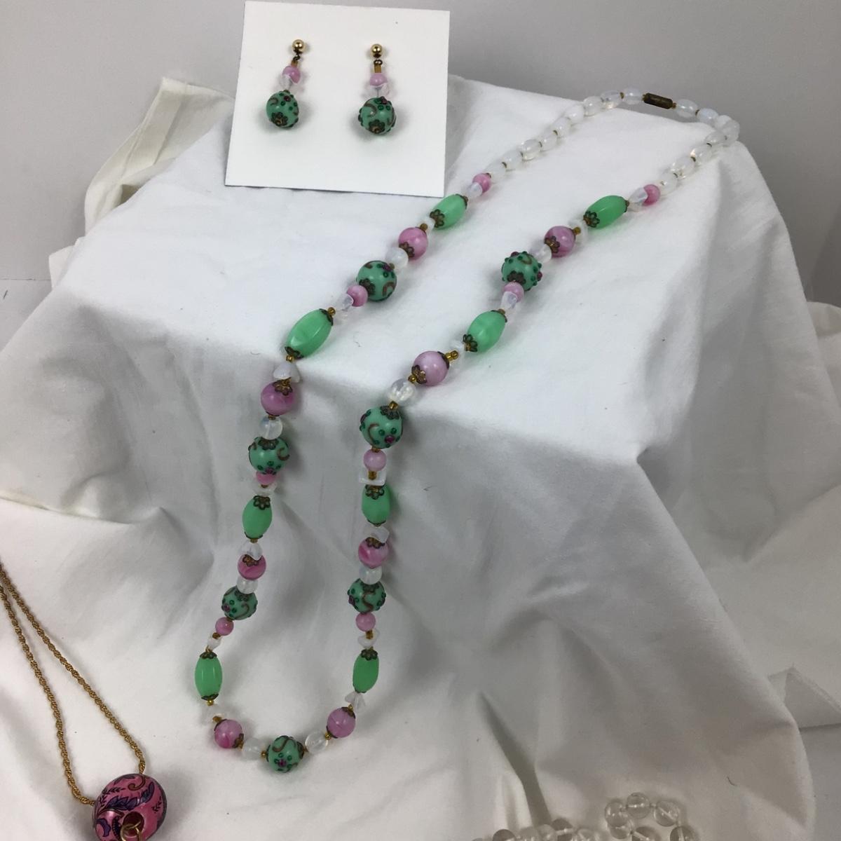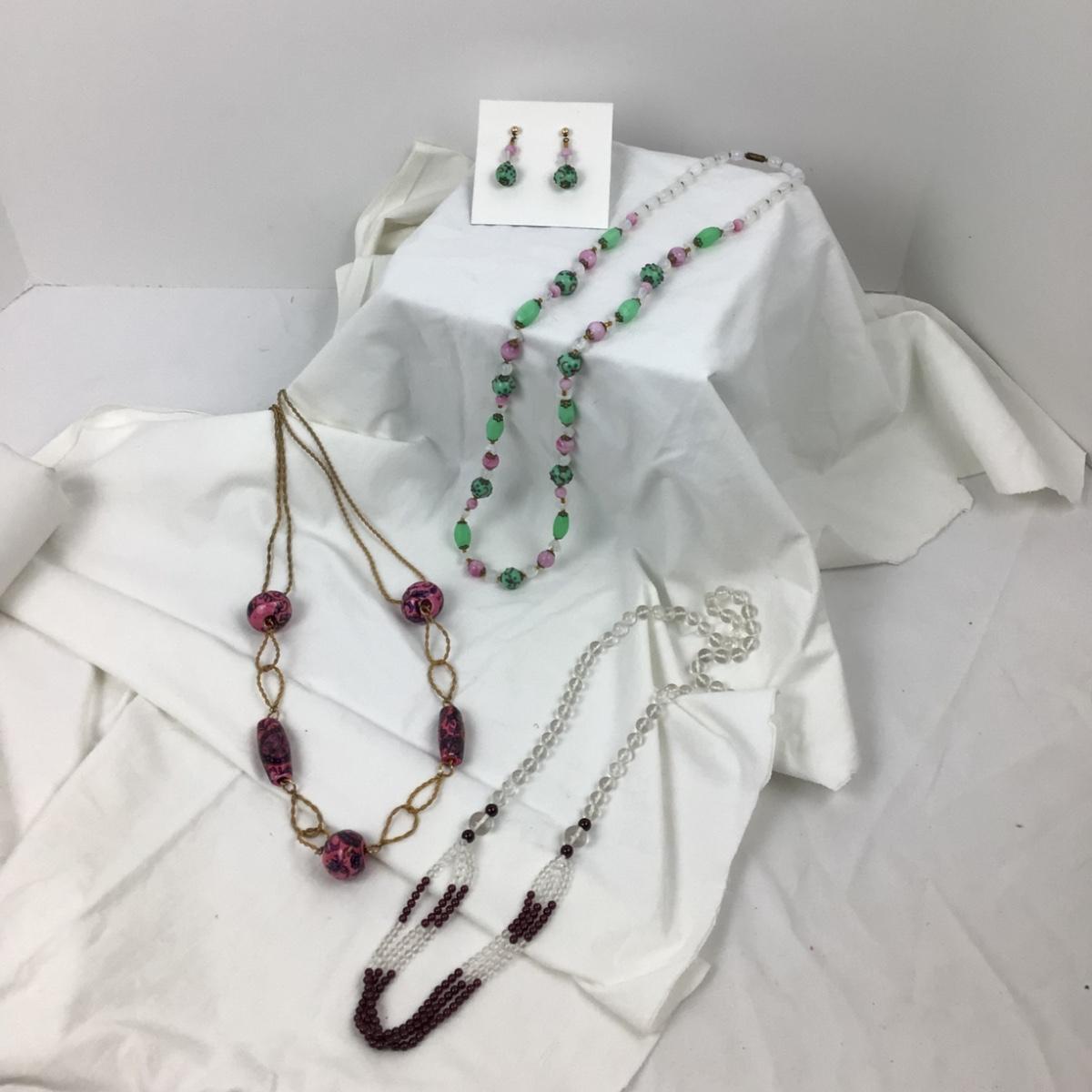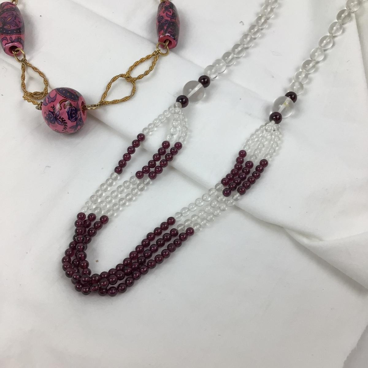 Beautiful Murano Glass Beaded Necklace measuring 30” with matching pierced earrings, Garnet and Glass Beaded Necklace measuring 32” , Floral Pink Pottery Necklace by Vogue measures 29”