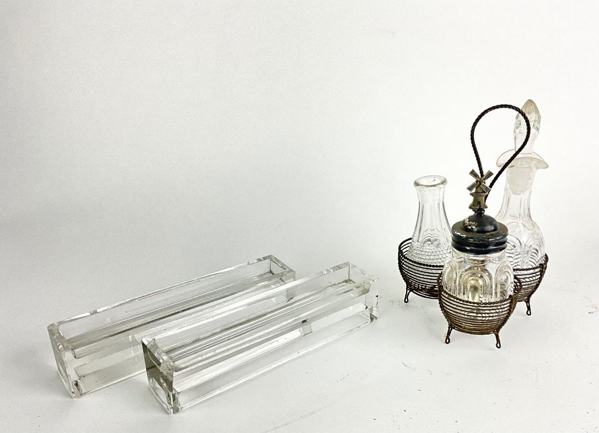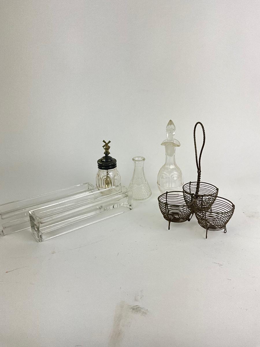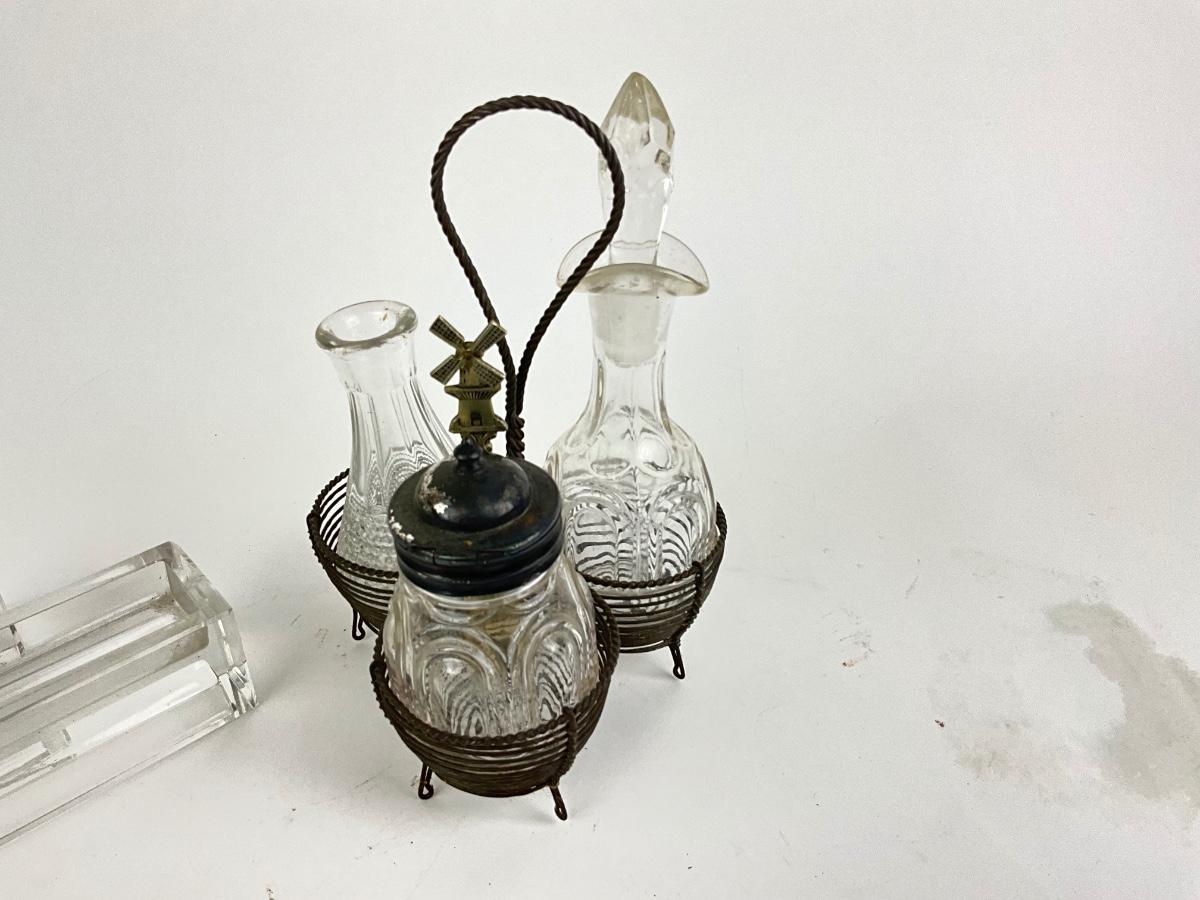1113 Lot of Vintage Glass Cruet , Wire Basket and Glass Vases