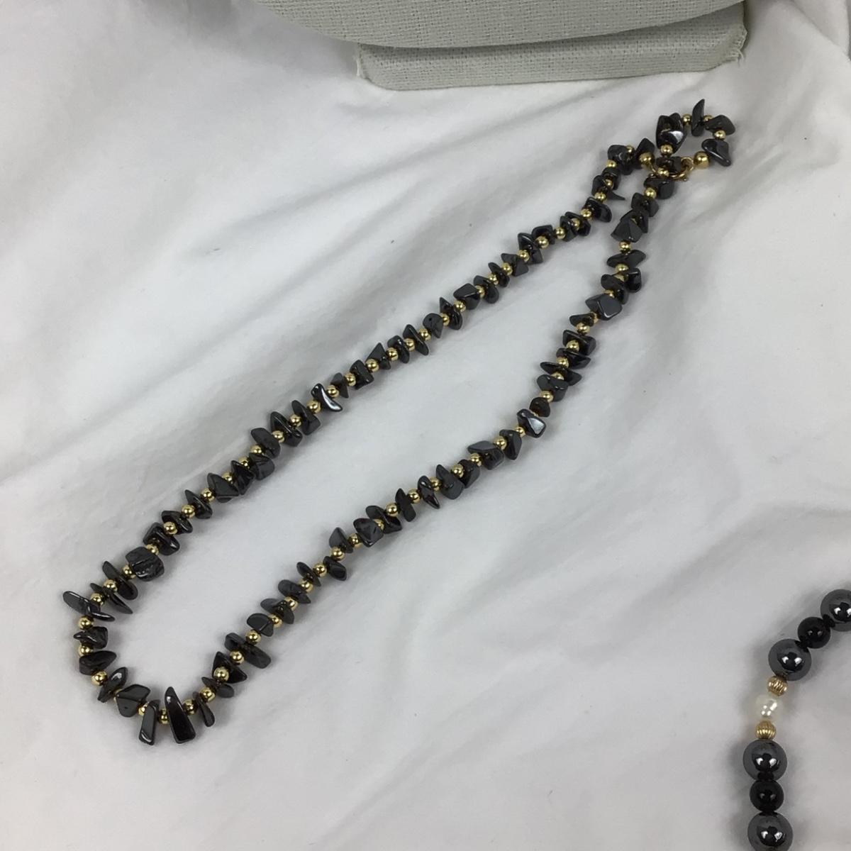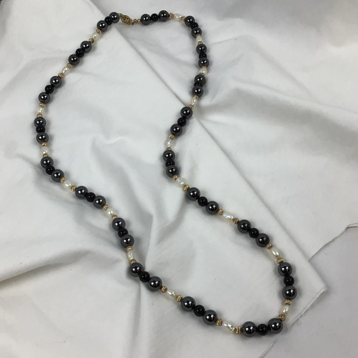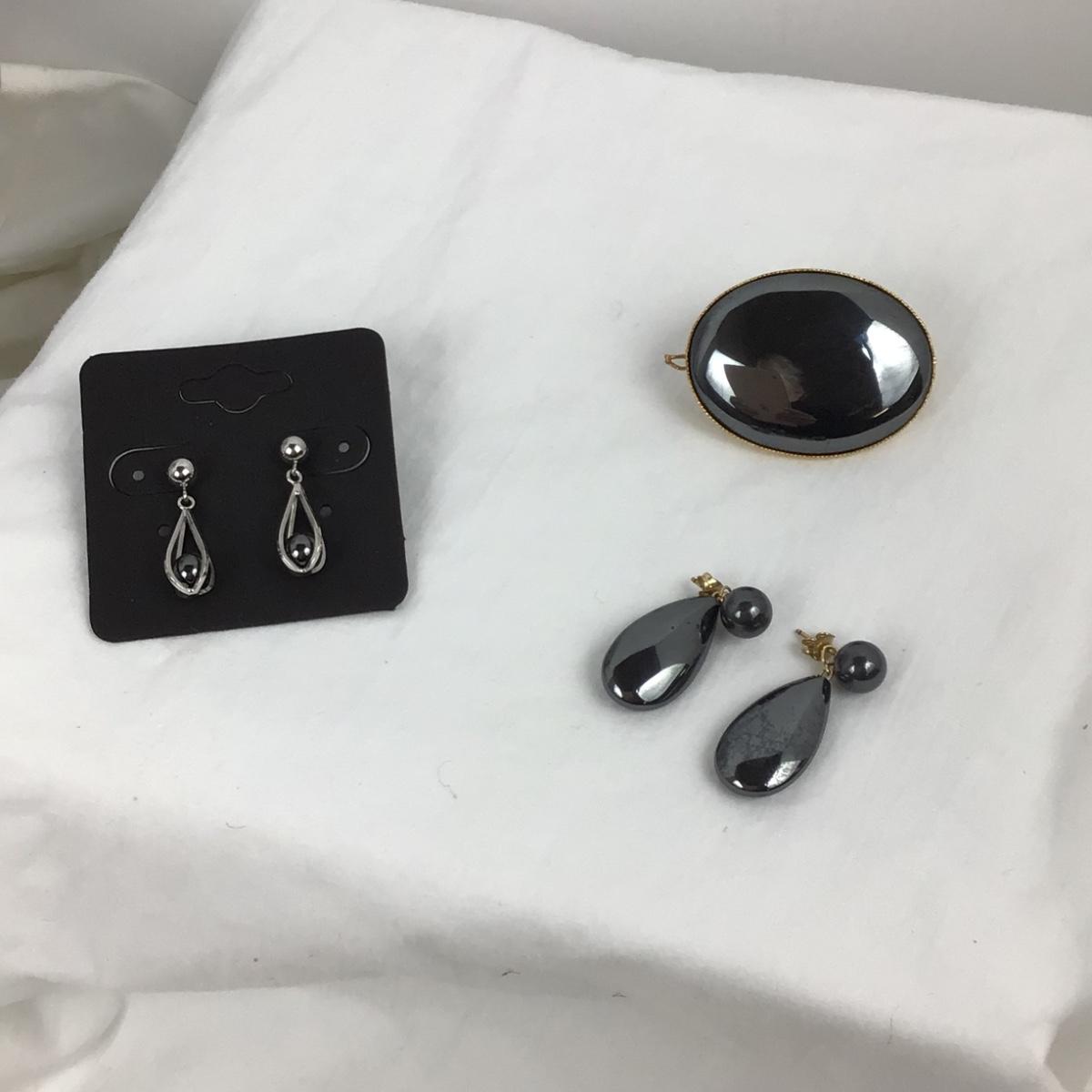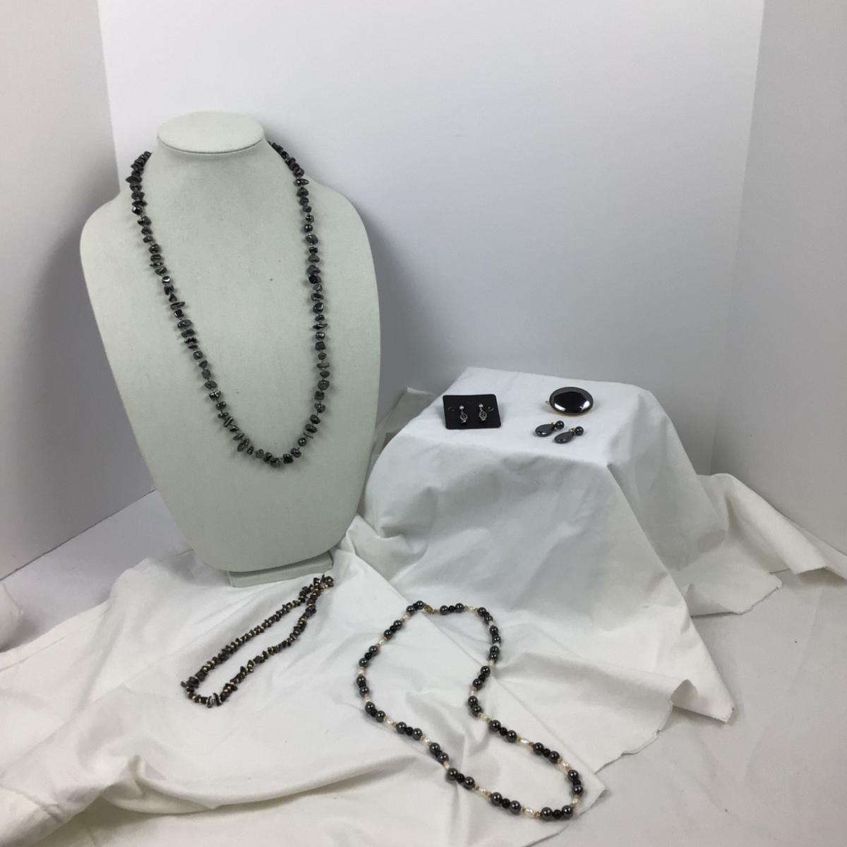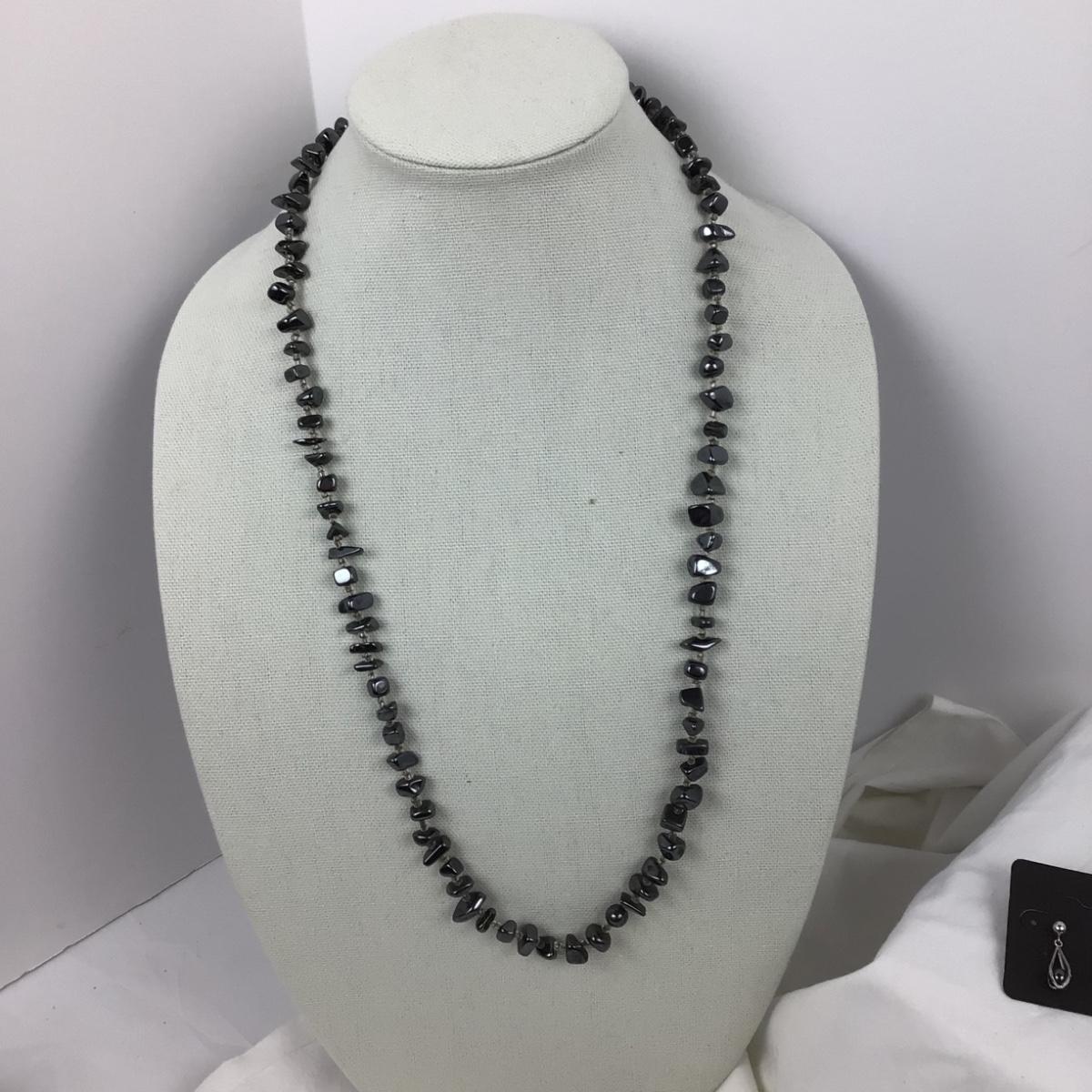Hematite and Silver Necklace is 32” with scarf clip and two pairs of Hematite pierced earrings