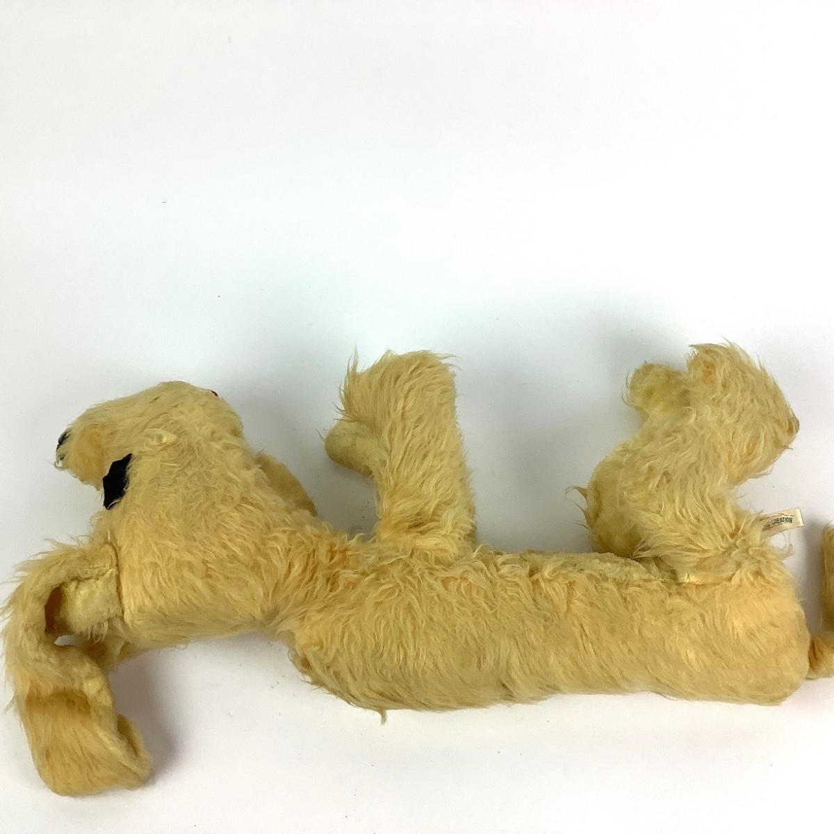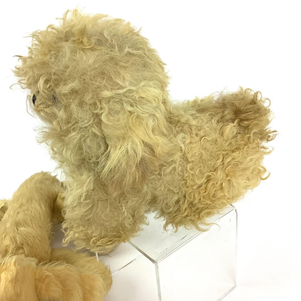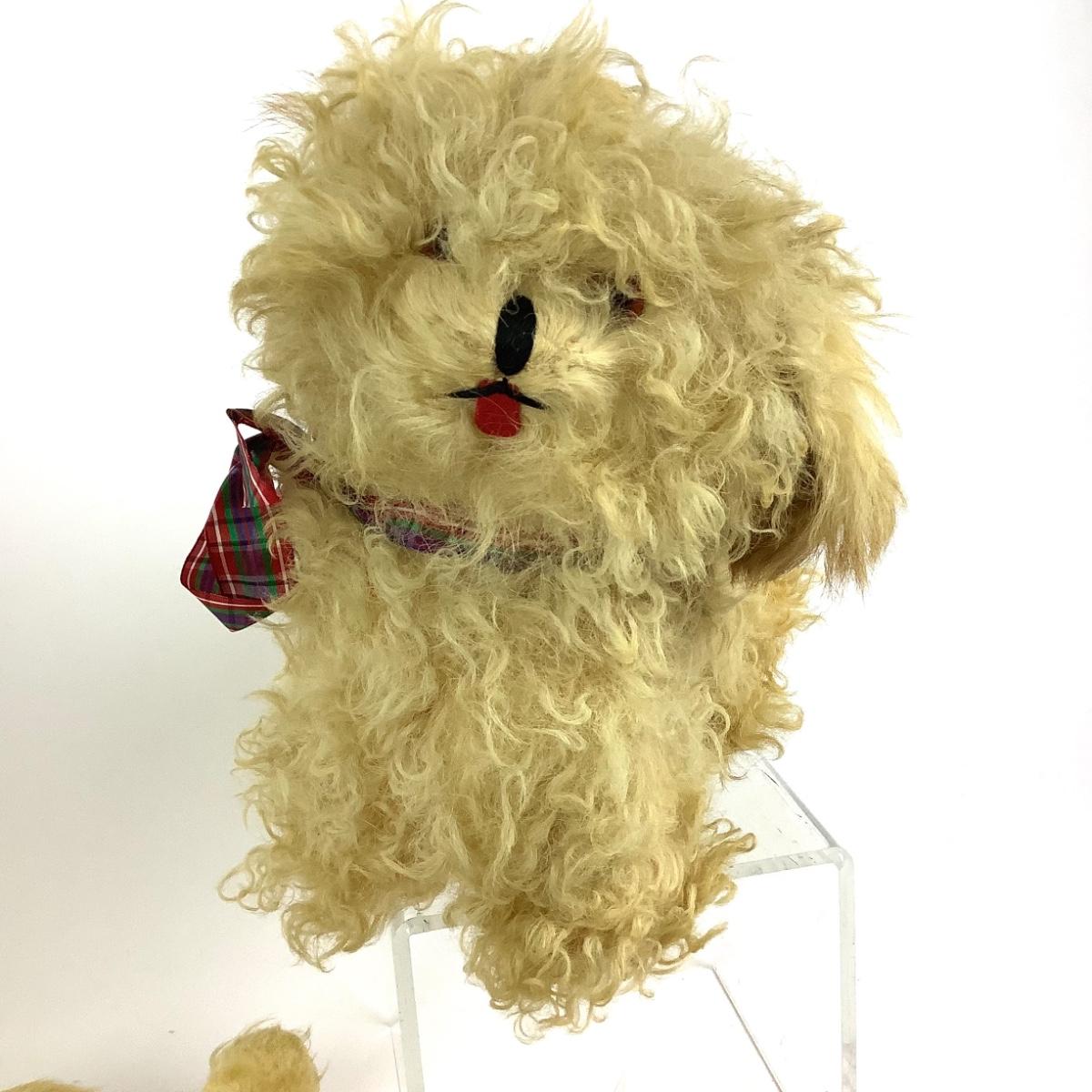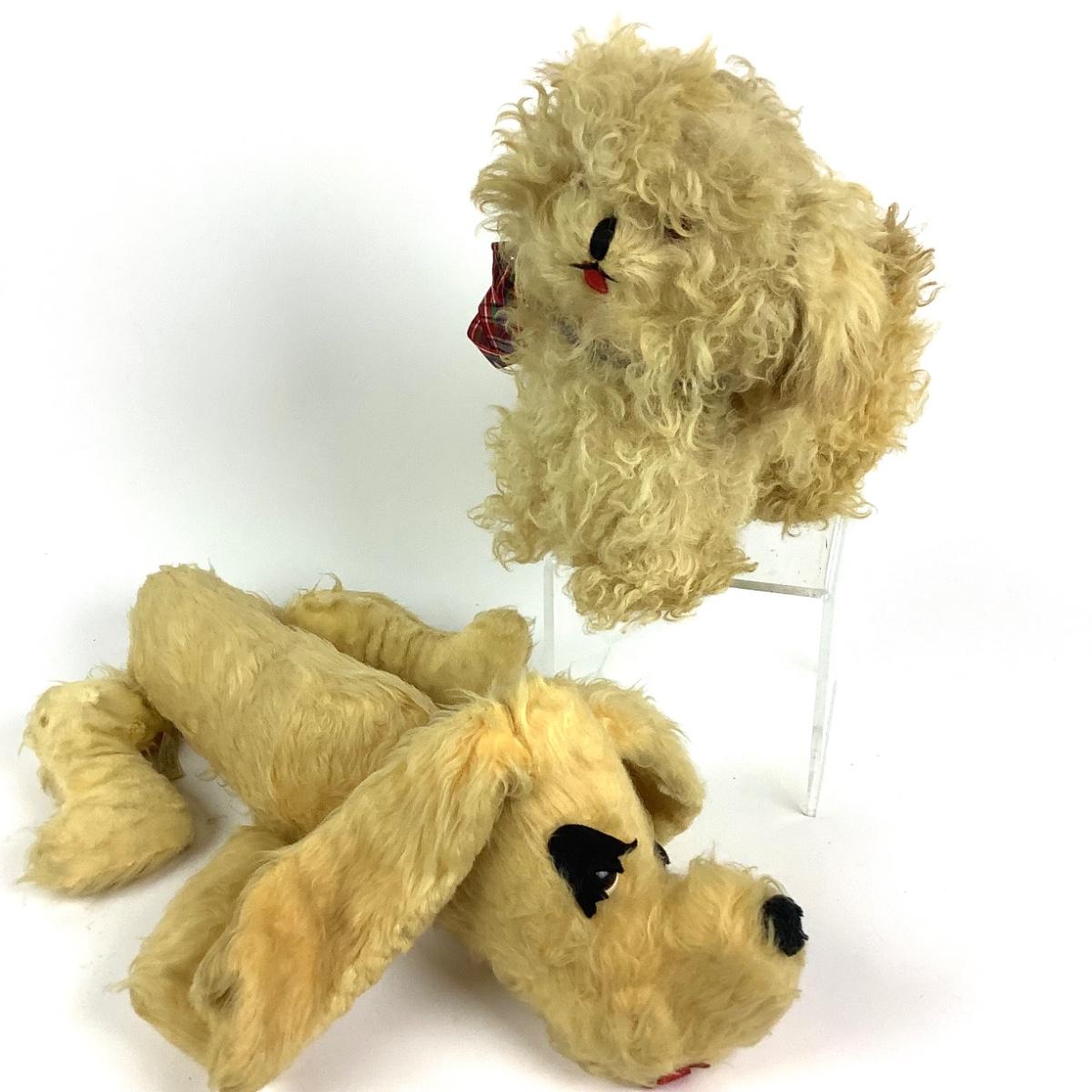 Vintage Rushton Co. Dog that is 18"L, the vintage standing curly hair dog plush is 11" h x 11" w.